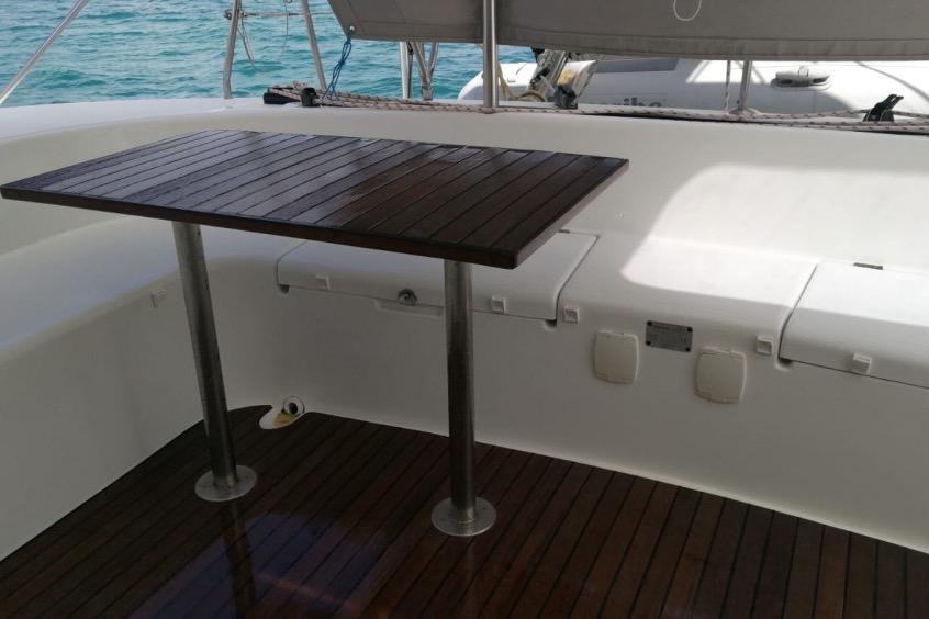 On this version, you’ll find a cockpit and teak table in excellent condition. The rigid bimini, along with the side and aft enclosures, provides optimal comfort and privacy for relaxing or sailing in any conditions.