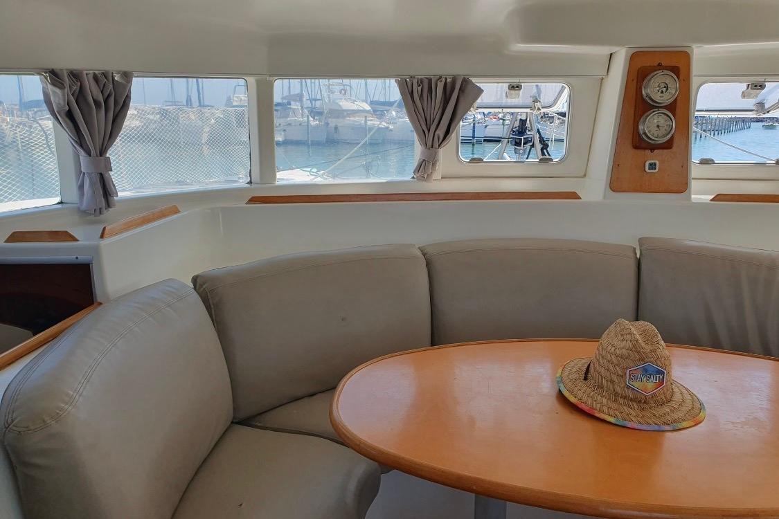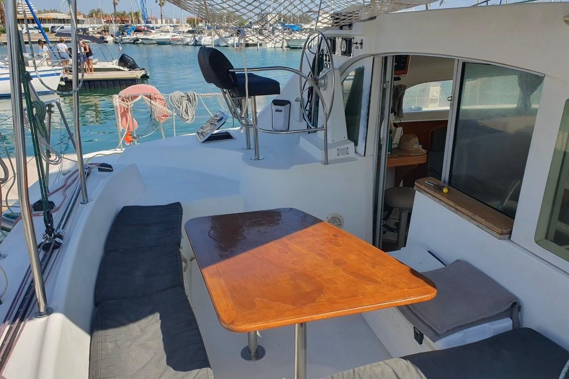 Ce catamaran offre un vaste cockpit convivial, idéal pour la détente ou les repas en plein air, parfaitement protégé par une bimini rigide. La circulation à bord est fluide, et la visibilité depuis la barre est excellente.