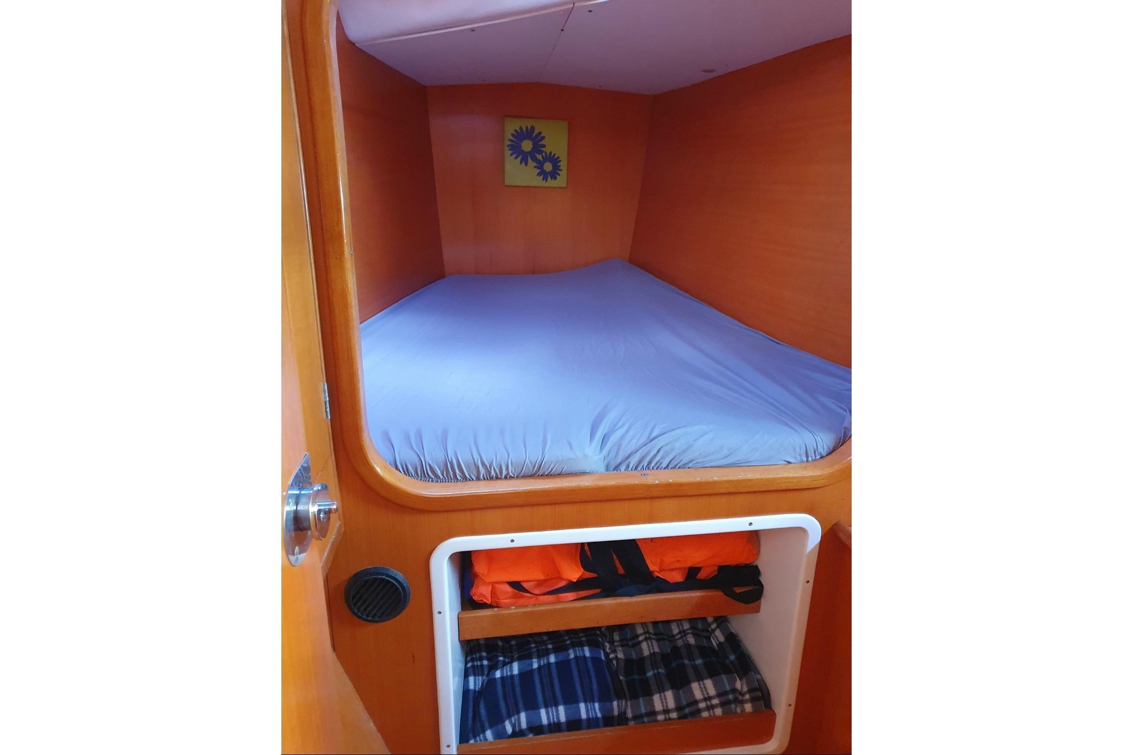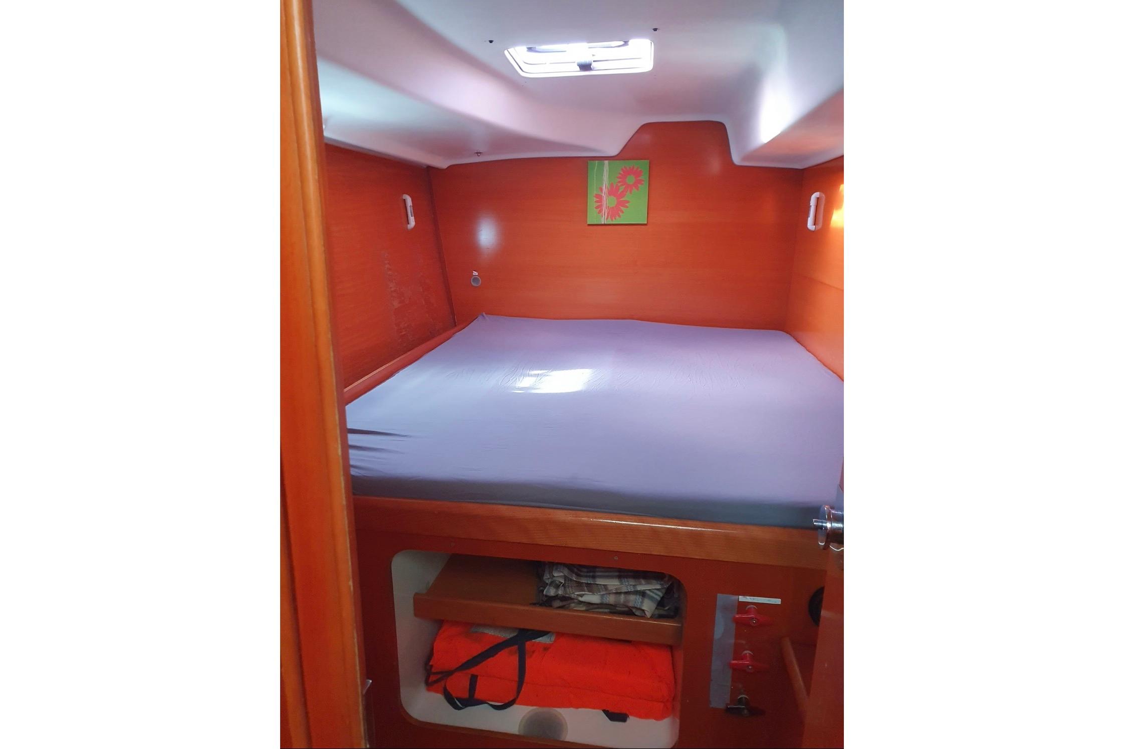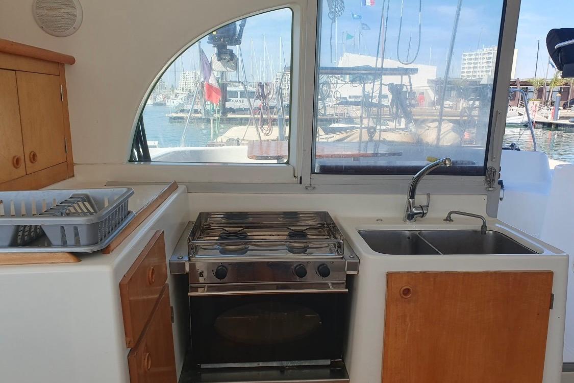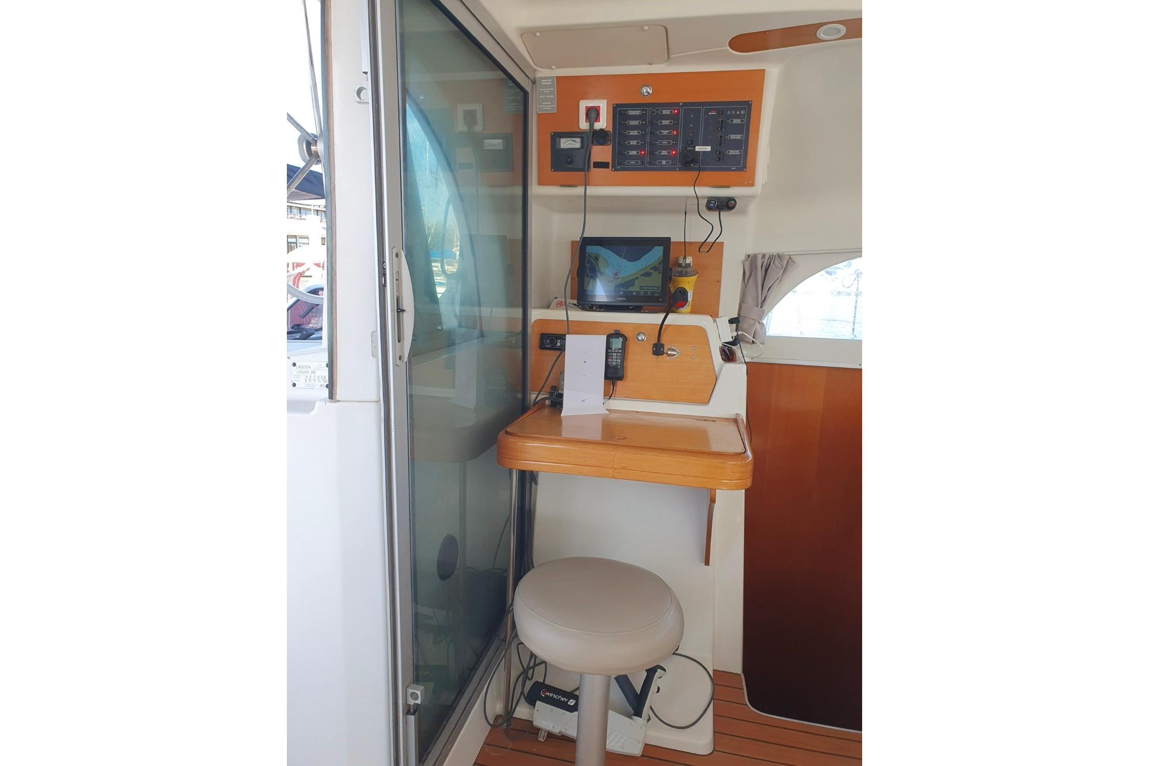 À l’intérieur, le carré lumineux bénéficie d’une vue panoramique, et la cuisine en L est fonctionnelle et bien équipée pour la vie à bord. Les quatre cabines doubles offrent un hébergement confortable pouvant accueillir famille et amis dans les meilleures conditions.