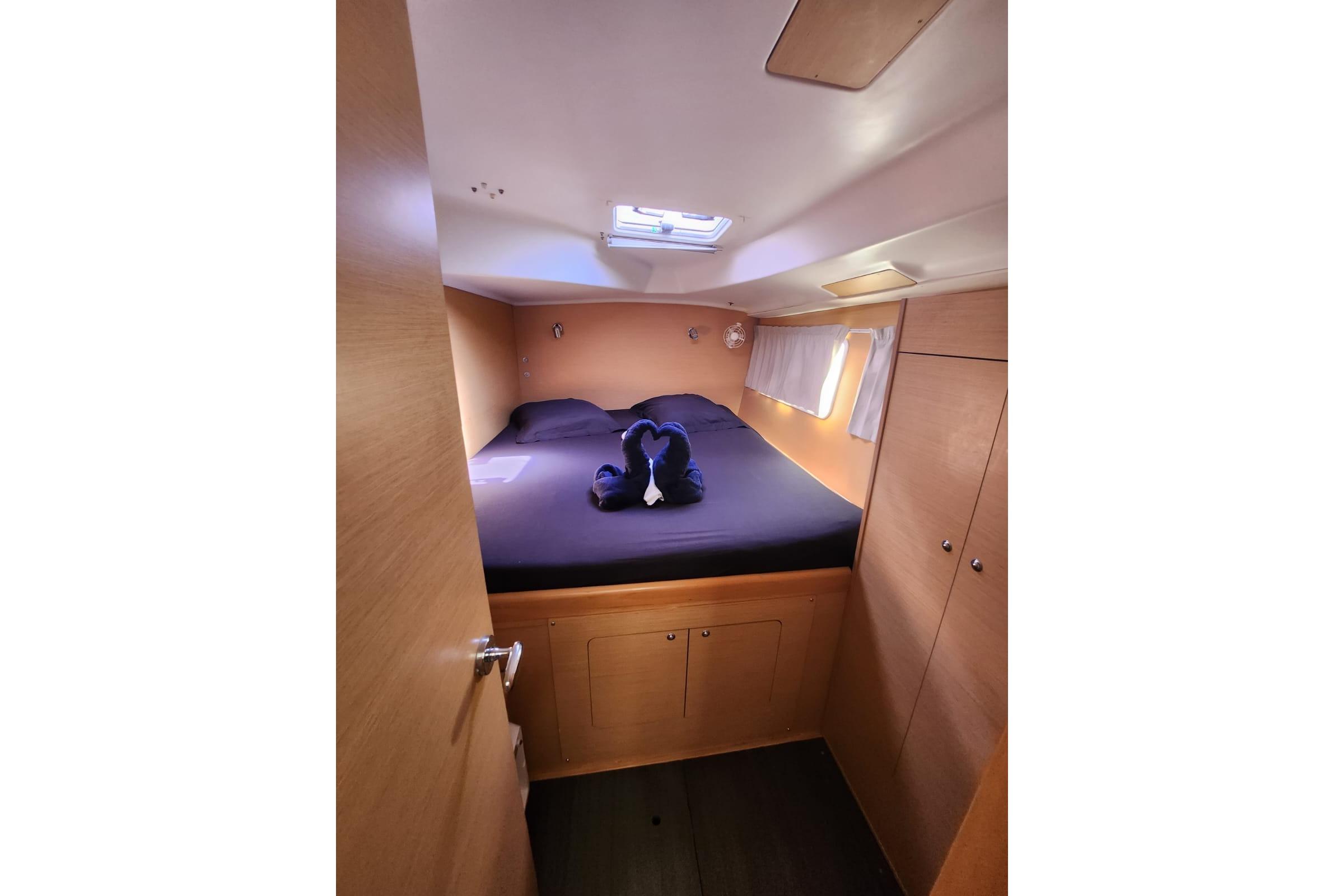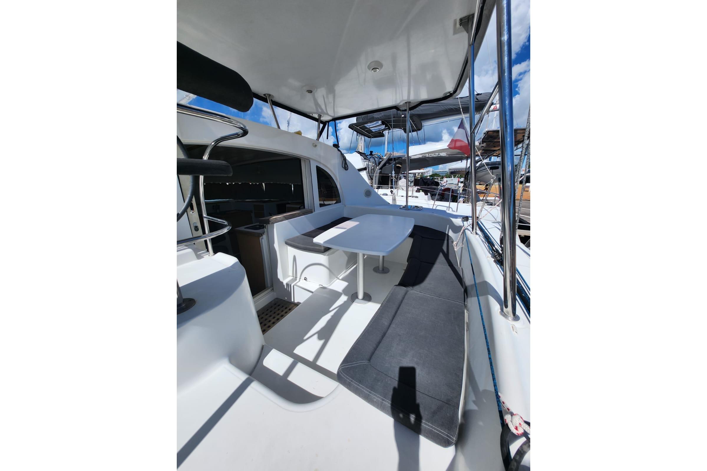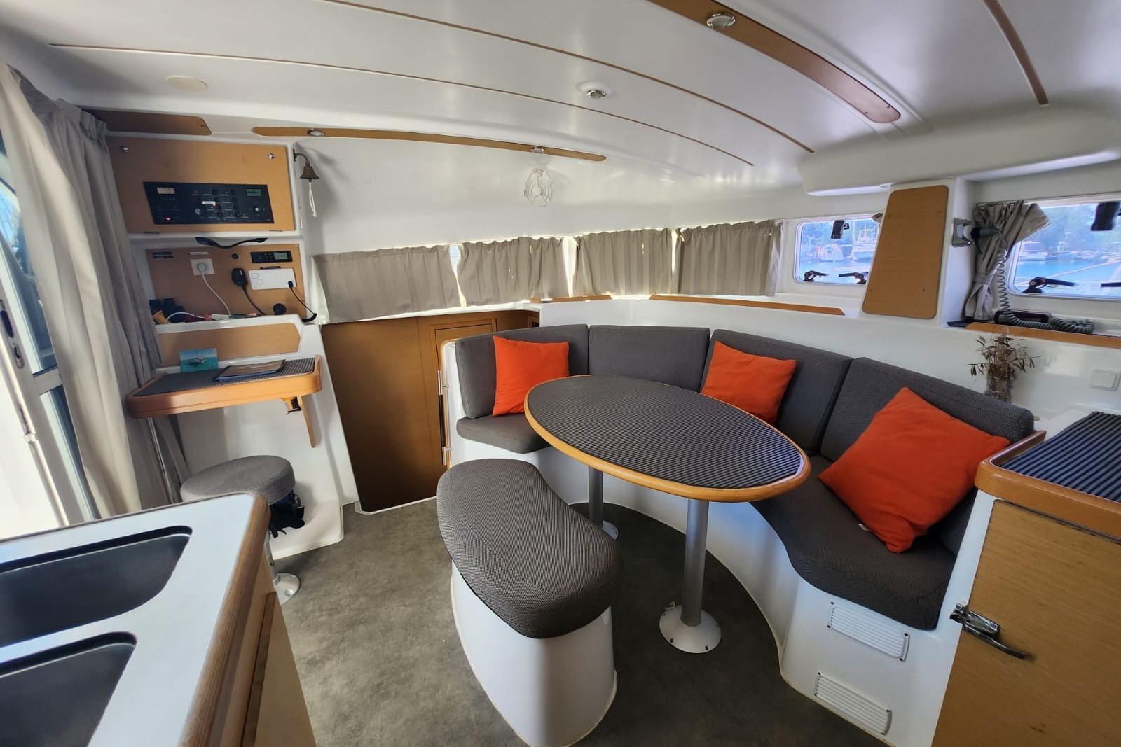 Lagoon 380, un best-seller reconnu dans sa catégorie. Il est rapide, facile à manœuvrer, sûr, et possède une légion de fans répartis à travers les océans du monde. Grâce à son gréement classique (GV + génois + gennaker + spi symétrique), Arcane est maniable et stable, même pour un équipage réduit. Sa configuration et son faible tirant d’eau permettent d’explorer sans contrainte les criques peu profondes ou les mouillages isolés. Les jupes arrière facilitent les baignades comme l’accès à l’annexe. Il séduit les navigateurs débutants comme confirmés.