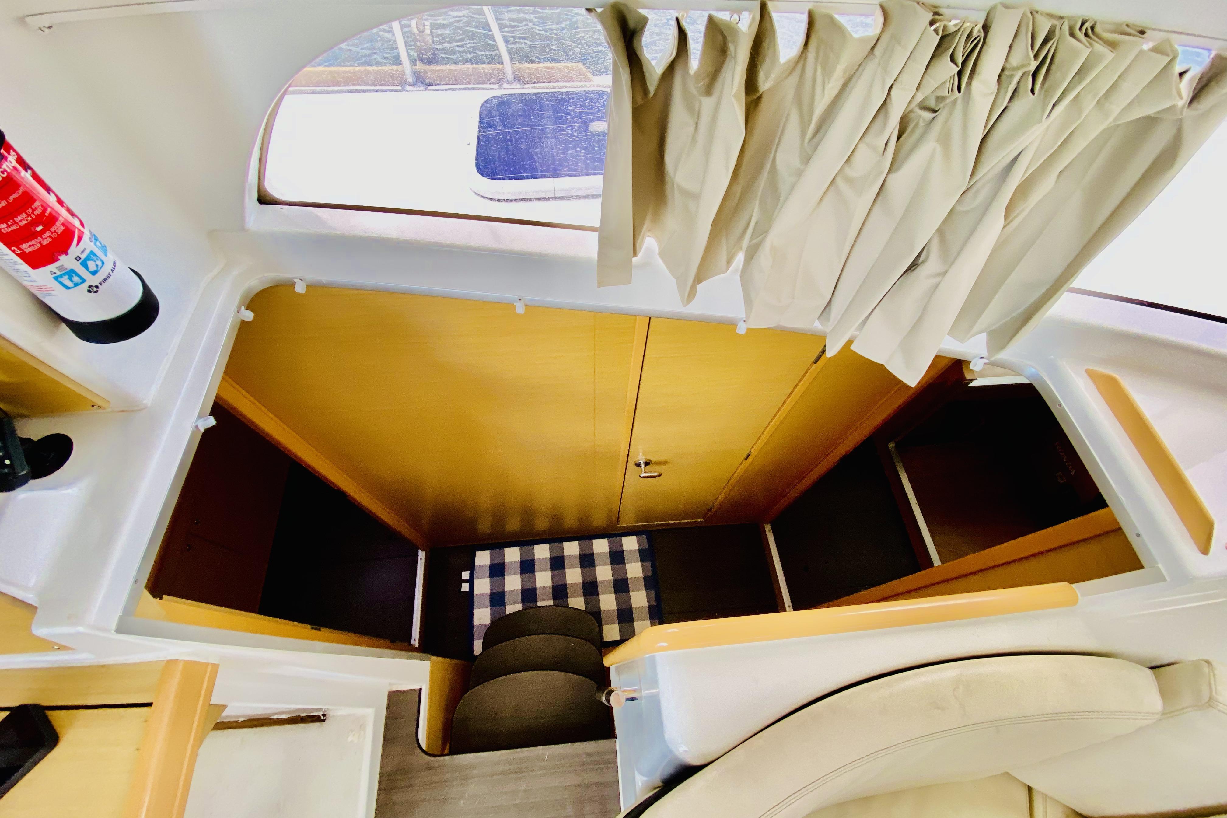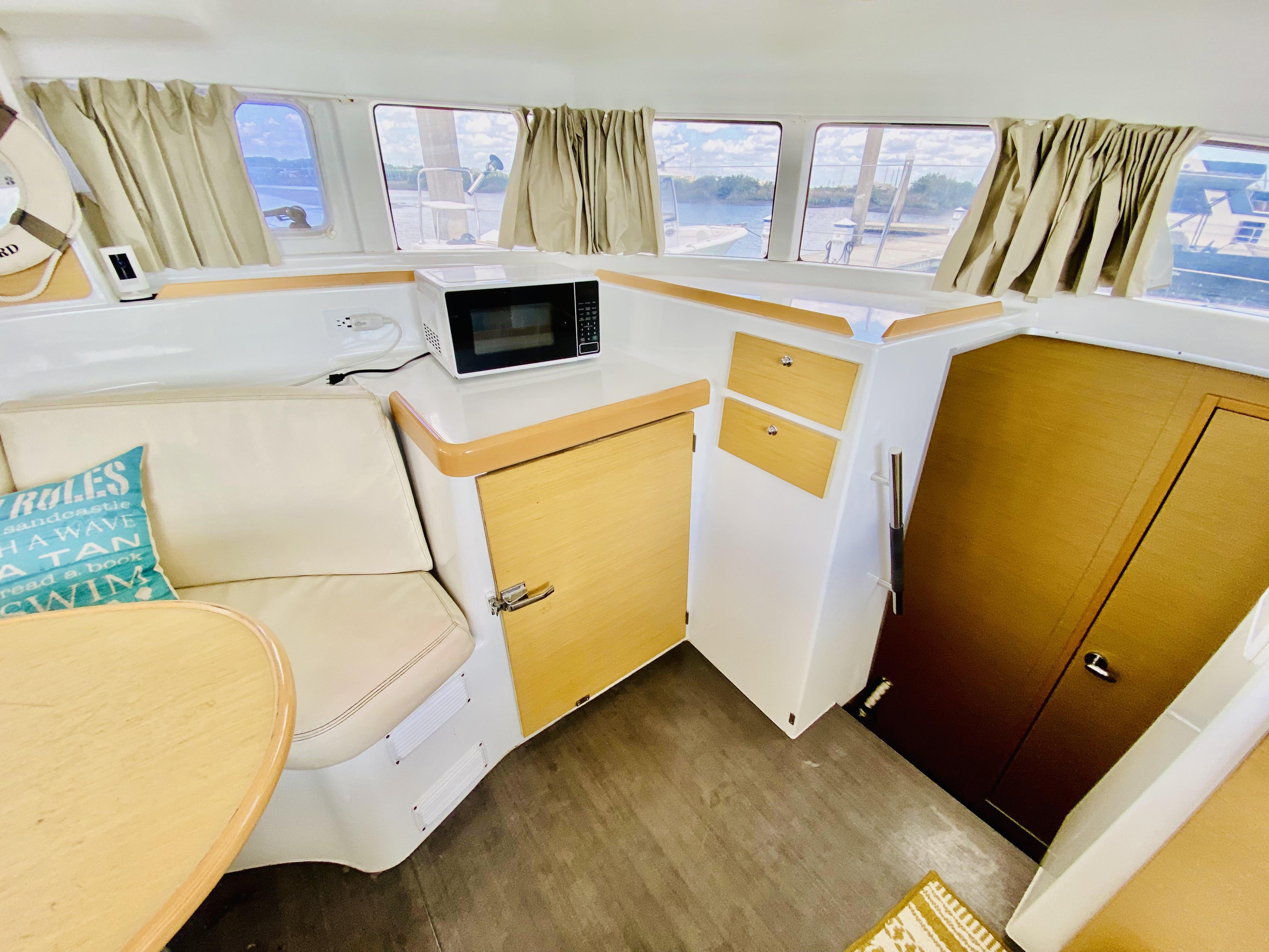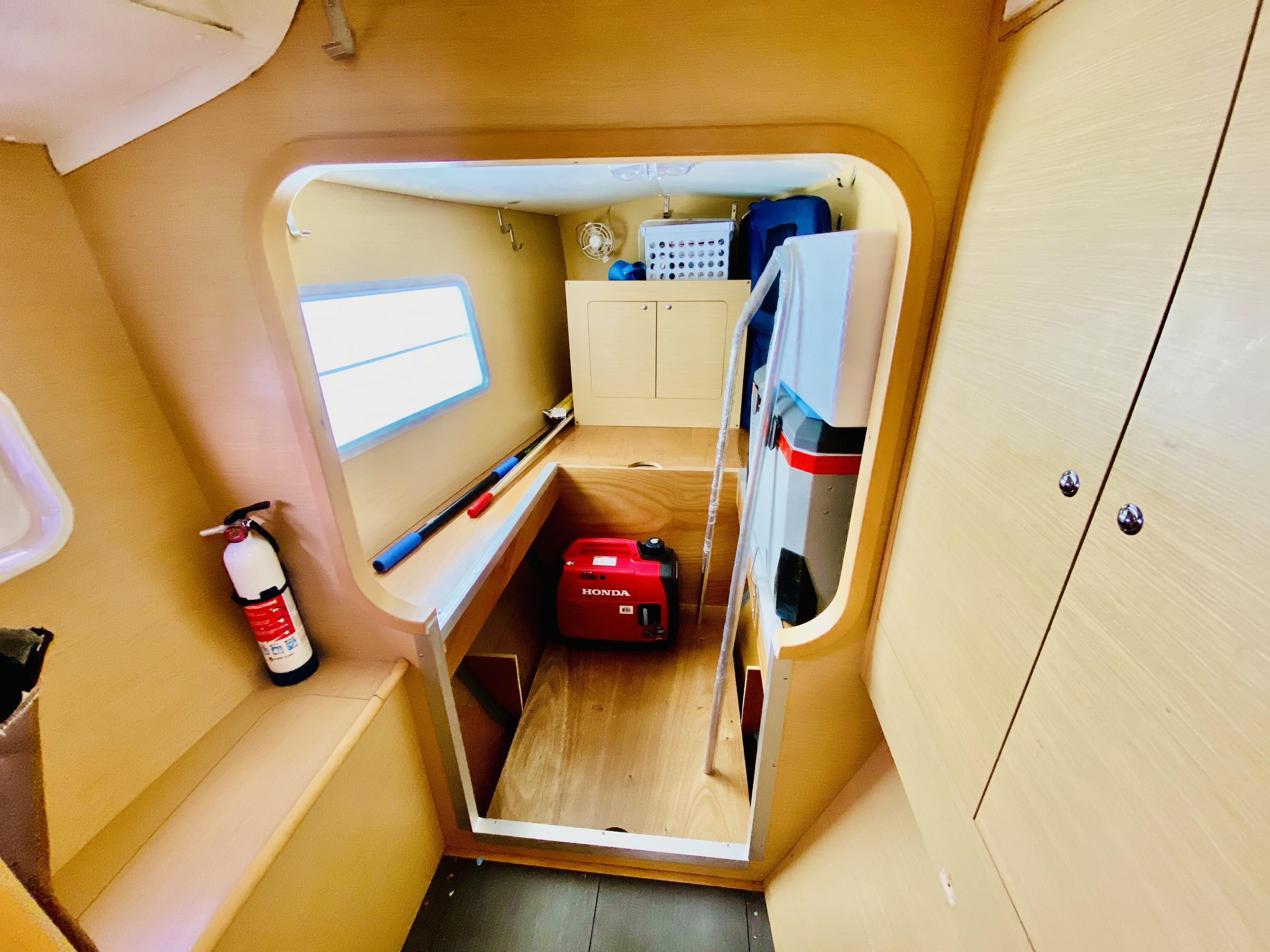 The interior of Finally Found is designed for both comfort and functionality, featuring Lagoons signature light-filled, open layout. The saloon is bright and inviting, with large vertical windows providing panoramic views and excellent ventilation. A well-equipped galley-up configuration keeps the cook connected to the social space, seamlessly integrating with the cockpit for effortless indoor-outdoor living. Originally a 4-cabin model, the port forward cabin has been thoughtfully converted into a dedicated workspace, offering a versatile room for storage, projects, or office use while still maintaining the boats spacious accommodations. The other cabins provide well-appointed berths with ample storage, making this layout ideal for long-term cruising, families, or guests. Warm wood finishes and an efficient use of space create a welcoming atmosphere that feels like home, whether at anchor or underway.