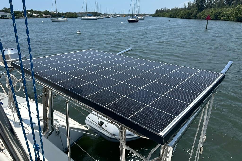 Victron remote monitoring system. 350 watts of solar on a beautiful custom stainless steel davit rack.