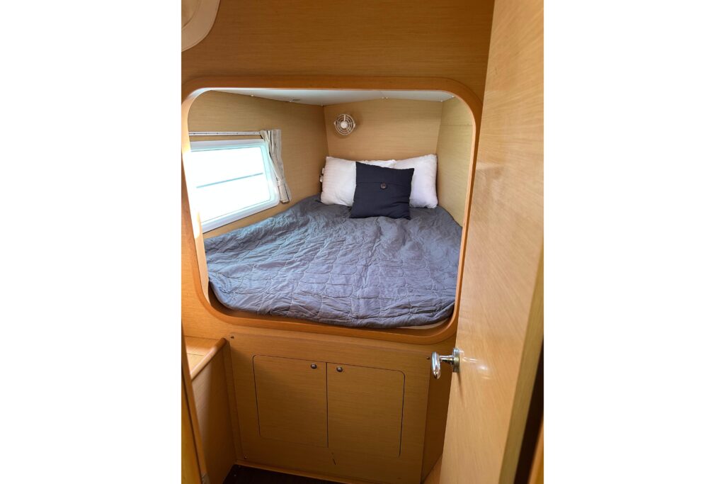 Starboard is the Master Hull, comprising of a large aft master cabin with queen sized bed, upgrqaded mattress (2021), cupboards and hanging closet. Mid hull is a library area, additional closet, and a storage cabinet.
