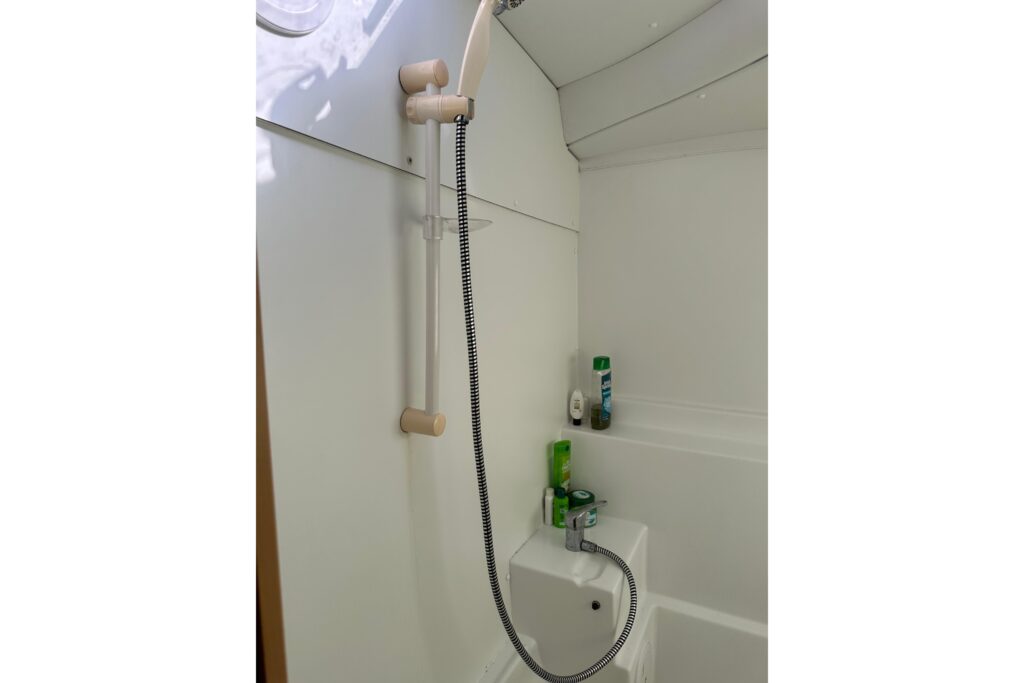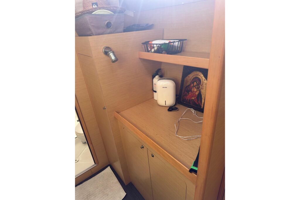 The master head/bathroom is forward of that, upgraded in 2021 to an electric flush top of the line Raritan toilet with sea/fresh flush switch. Forward of that is a gigantic separate shower room (also good for the biggest wet locker you can imagine). This is bigger than most shower spaces on 50 foot catamarans with great hot water.
