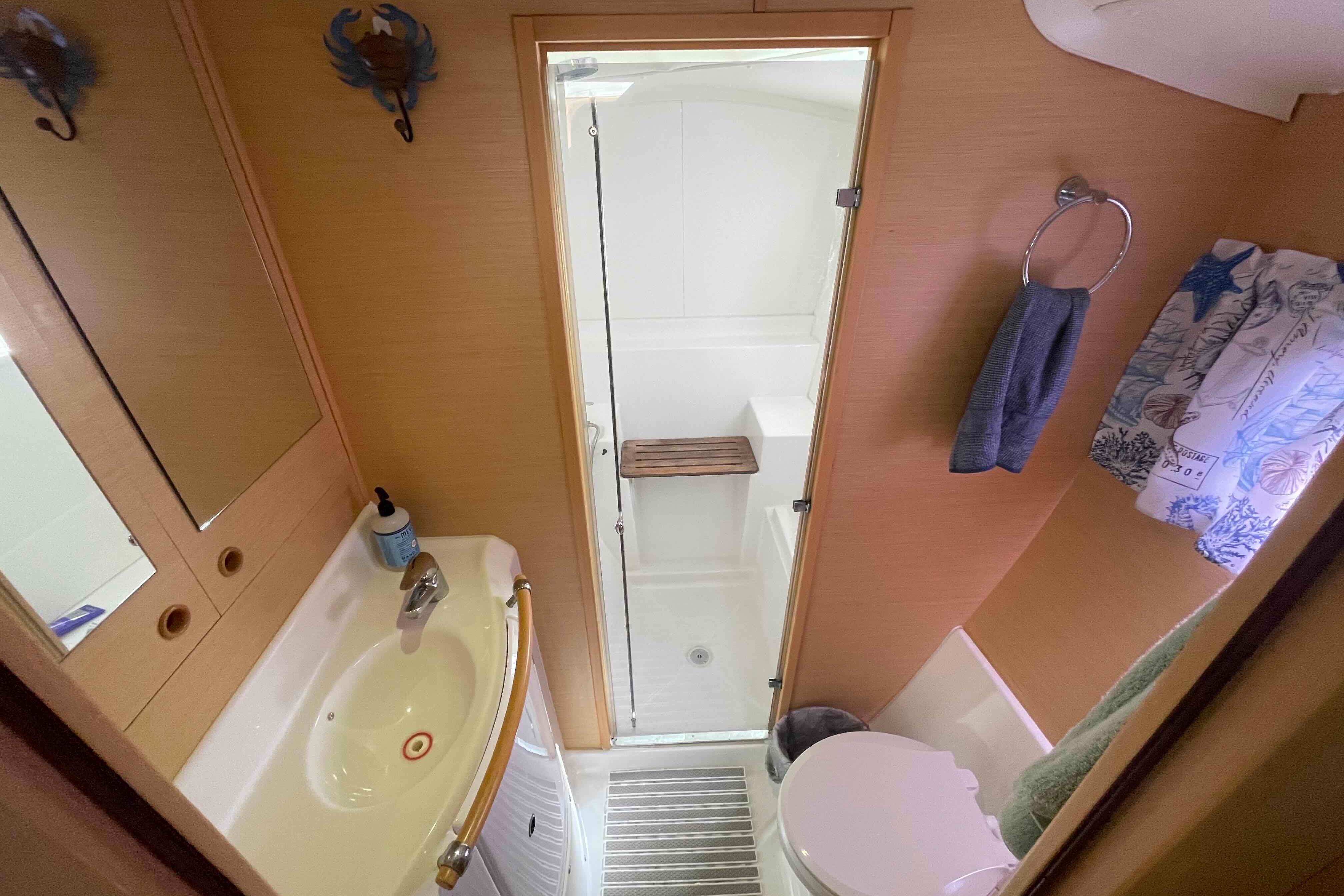 The Lagoon 380 has huge interior volume for a 38 footer. The panoramic salon and the galley connect directly with the cockpit. Seated around the salon table, while at the helm, or relaxing in the cockpit, everyone is part of the activities onboard. The owners version has 3 cabins with queen size berths and 2 heads, one on each side, with the starboard hull entirely dedicated to the owner’s suite, including a large fully enclosed shower. There are hanging closets and shelves throughout the cabin areas as well as large fixed panoramic windows in each cabin.