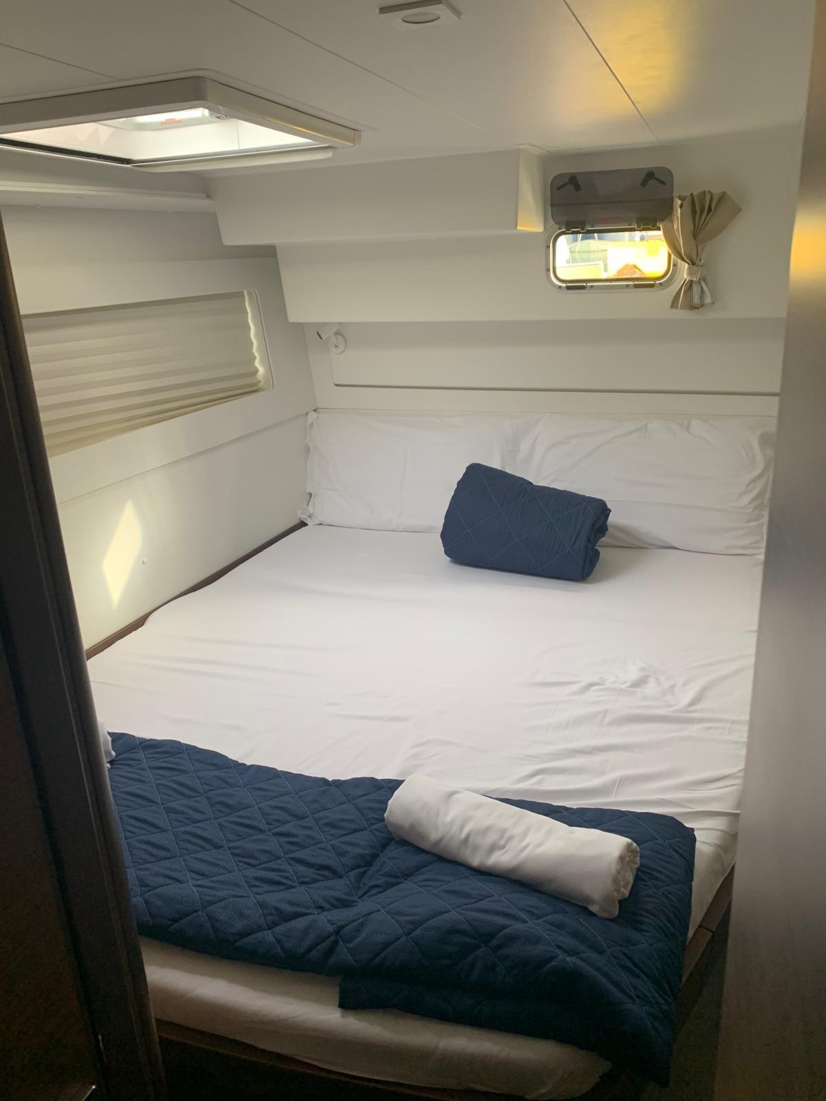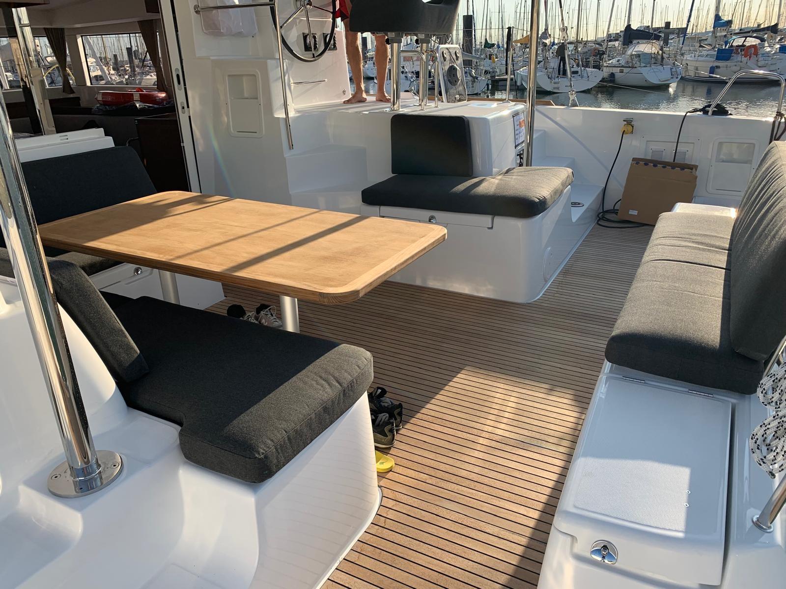 This Lagoon 40, which had a single owner, has 4 cabins plus two external cabins for crew and very optional: inverter, electric bathrooms, watermaker, windlass control in the wheelhouse, teak in the cockpit, large teak table instead of the standard composite, additional water tank, washable dinette, slats under the beds, fans, TV antenna, Highfield tender with aluminum keel....