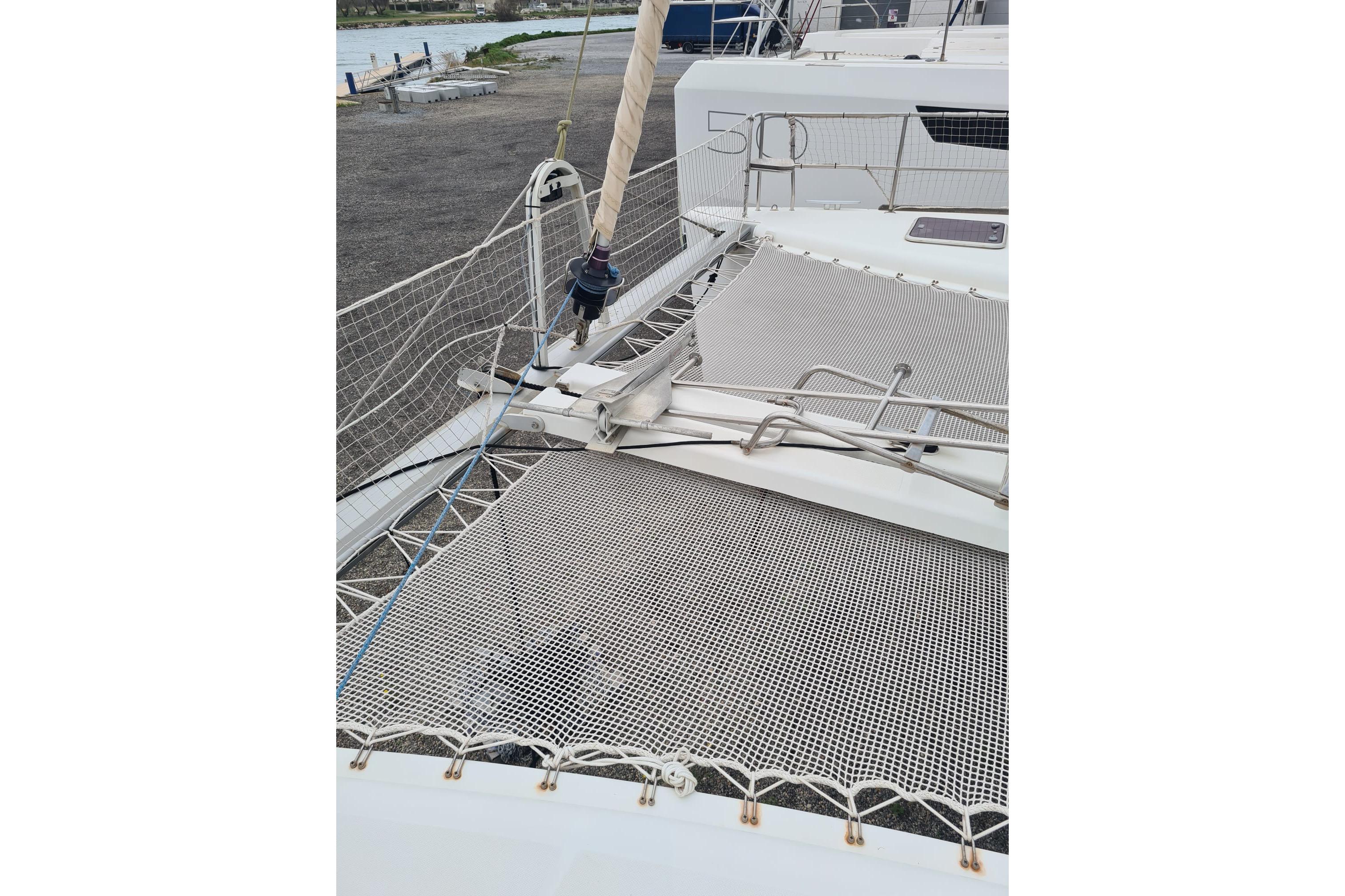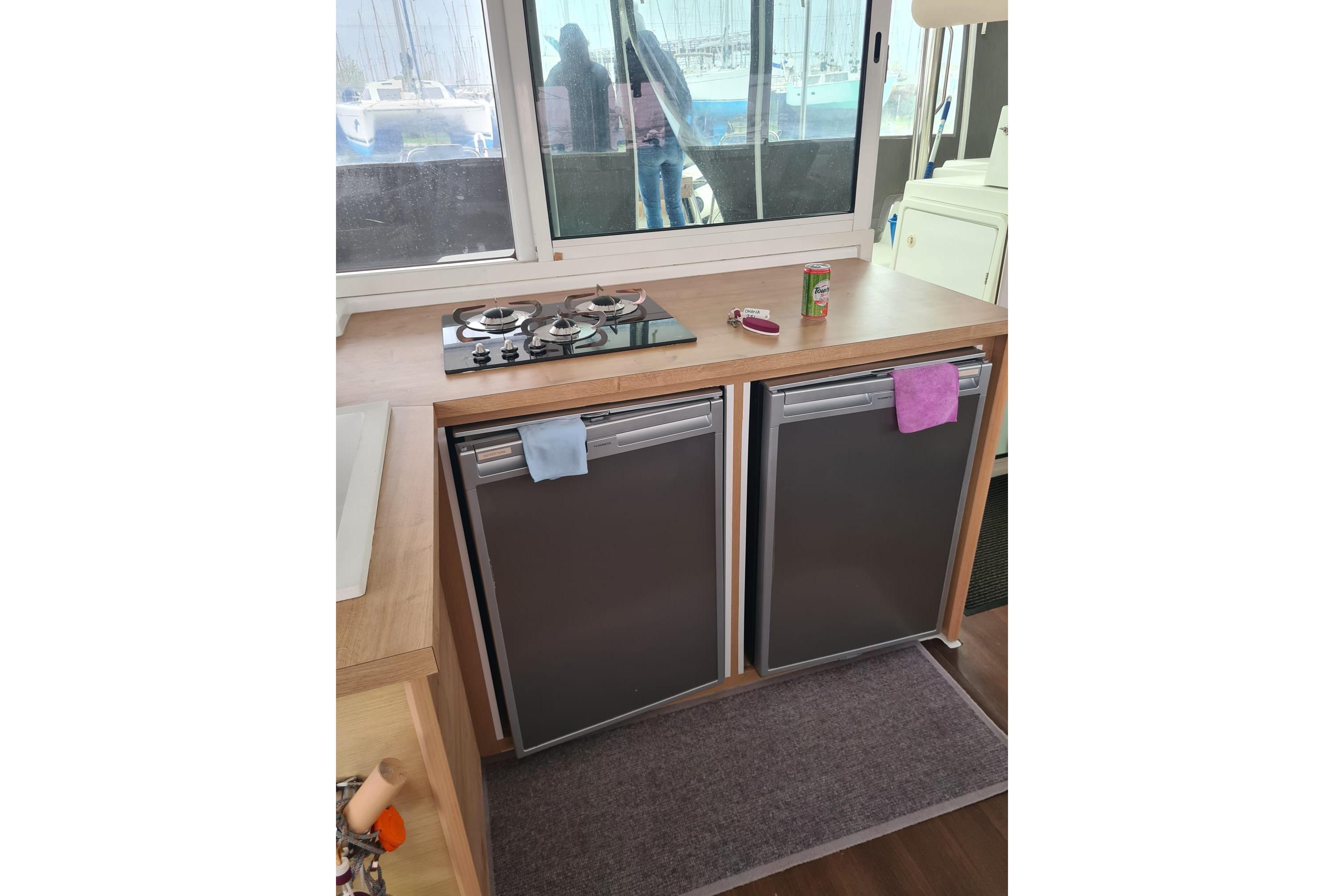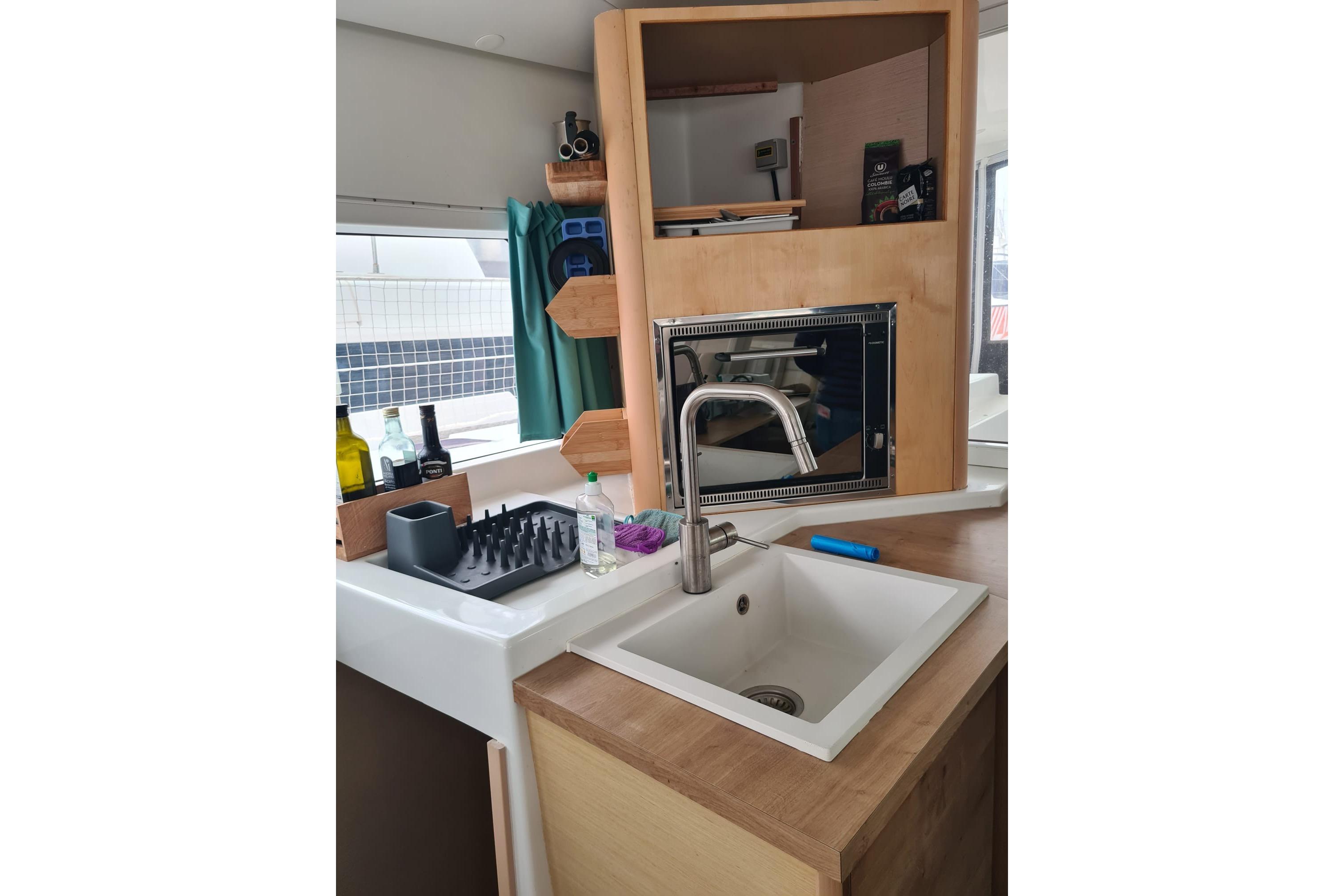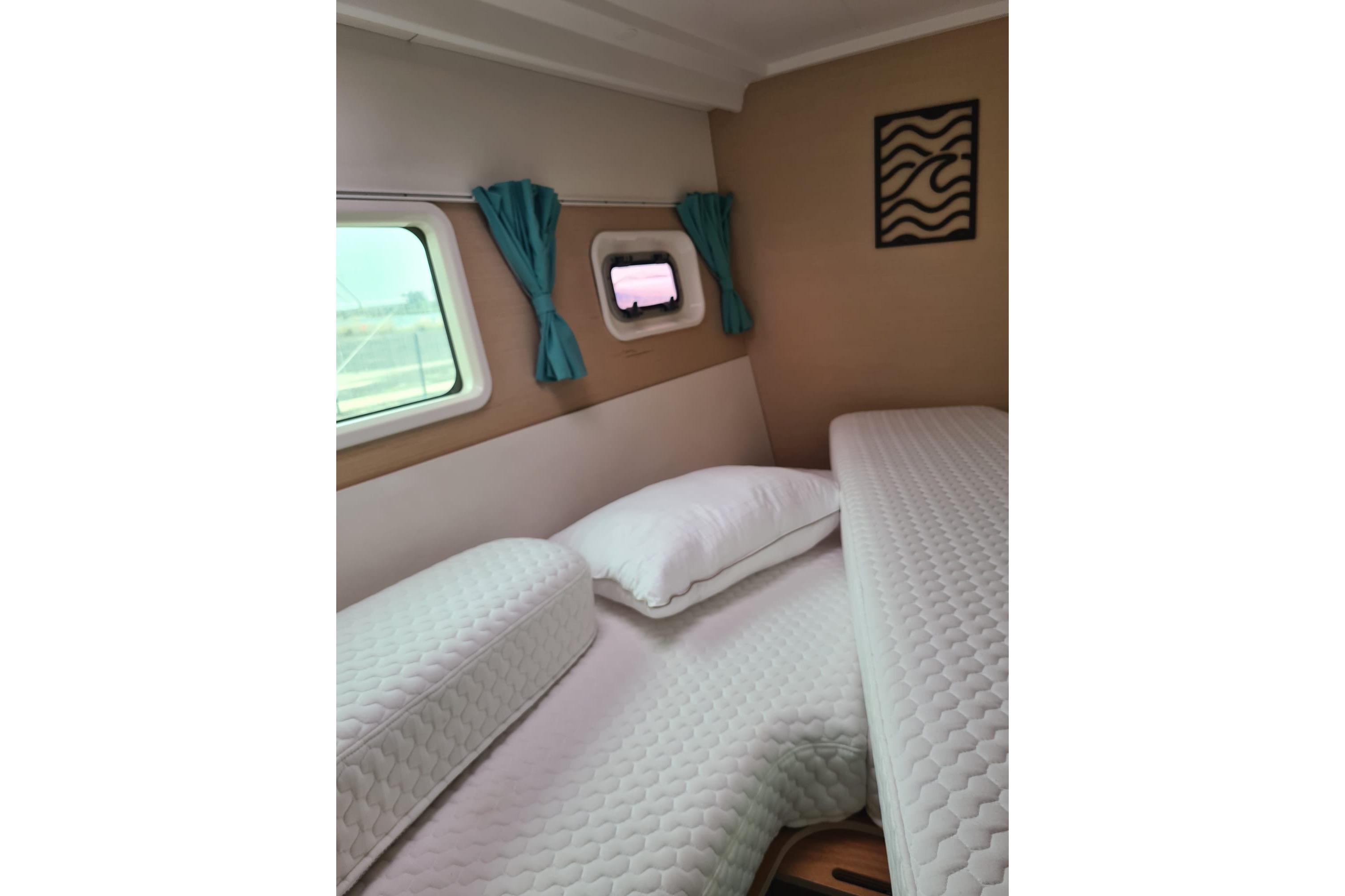 À bord, le catamaran propose 4 cabines doubles et 8 couchages, 2 cabines supplémentaires dans le salon sont possibles, ainsi que 4 salles de bain avec WC, offrant confort et intimité pour tous les passagers. La cuisine refaite inclut 2 frigos Dometic, gazinière 3 feux, four gaz, micro-ondes et évier résine, tandis que le cockpit et la sellerie ont été refaits à neuf, avec taud anti-UV et trampoline.