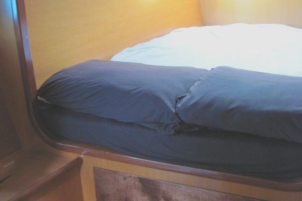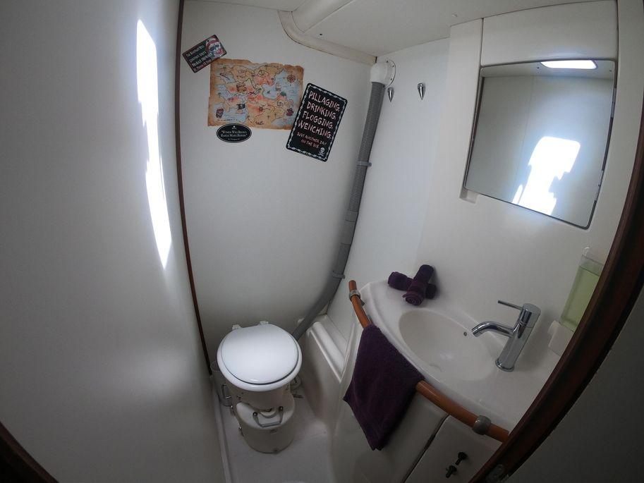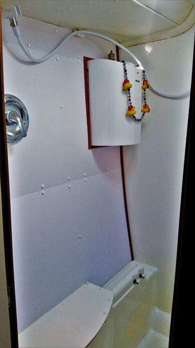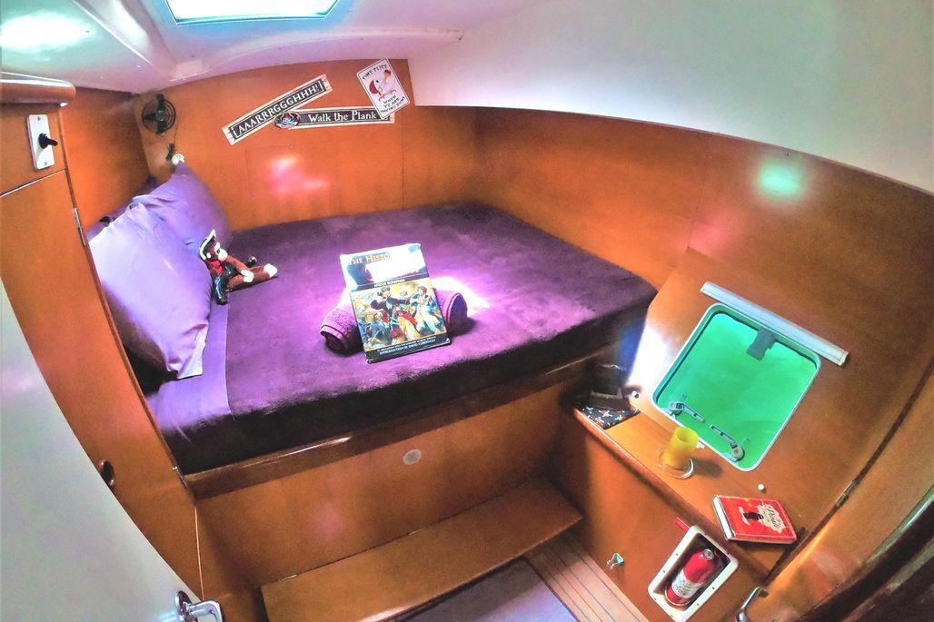 The 4 Cabin, 3 head layout promotes comfort for owner use and charters alike. A fourth head was converted to a stand up shower, to maximize comfort. A four-gallon hot water tank for the shower is heated exclusively by solar. There is also a single fore peak storage area on port with a large hatch to accommodate bicycles. The starboard forepeak can be configured to offer a single berth and head.