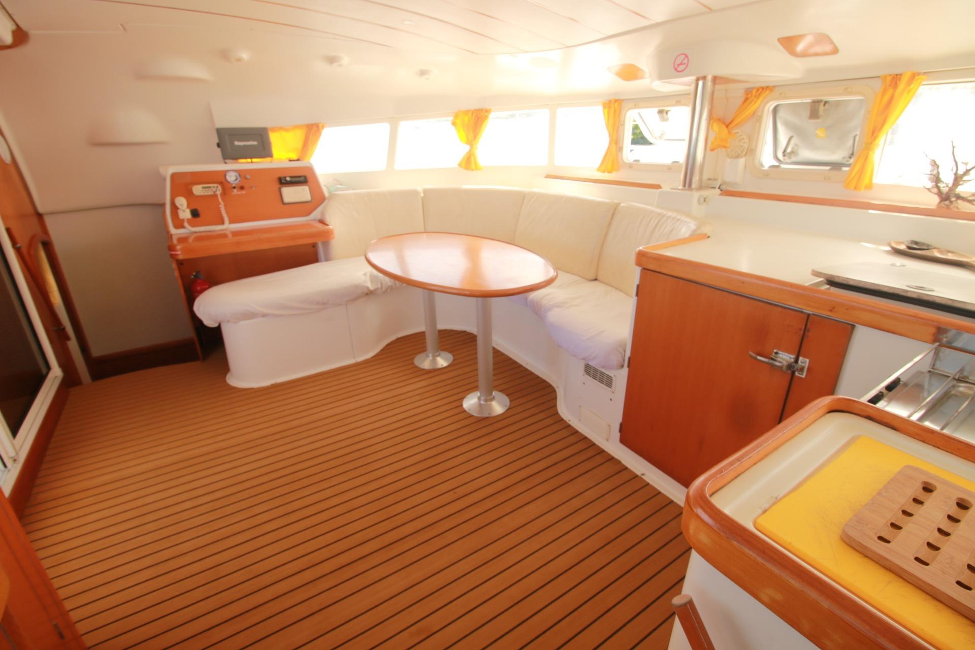 Catamaran Lagoon 410 de 2003, en version charter 4 cabines / 4 salles d’eau, reconnu pour sa robustesse, sa stabilité et ses volumes généreux.