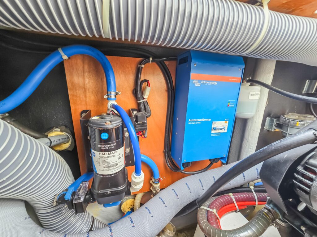 The spacious interior boasts a modern design, offering ample accommodations ideal for a liveaboard couple or family. Each stateroom is equipped with its own air conditioning unit, ensuring supreme comfort for everyone onboard. With a built-in watermaker producing up to 37 gallons per hour, you can enjoy long showers and a constant supply of fresh water throughout your journey. Powering these systems is a carefully integrated setup, including over 2,000 watts of solar, which effortlessly keeps the 1,040 Ah house battery bank charged. Even on cloudy days, the 11kW generator provides a reliable backup for all your needs.