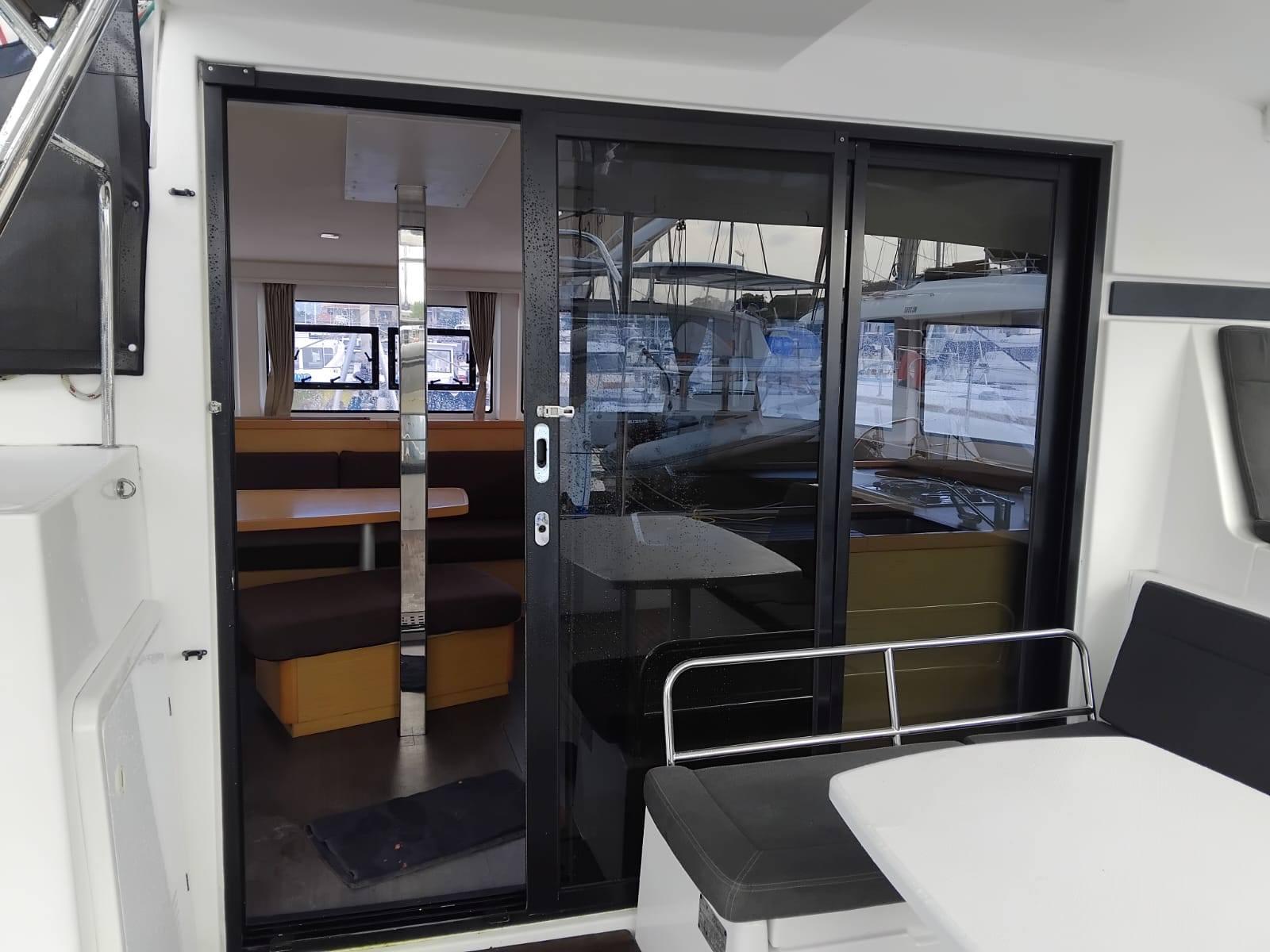 Le bateau est configuré en version 4 cabines doubles, chacune avec sa salle d’eau privative, garantissant confort et intimité à bord. Il bénéficie d’un agencement moderne, d’une grande luminosité intérieure et d’un cockpit spacieux très apprécié en navigation comme au mouillage.