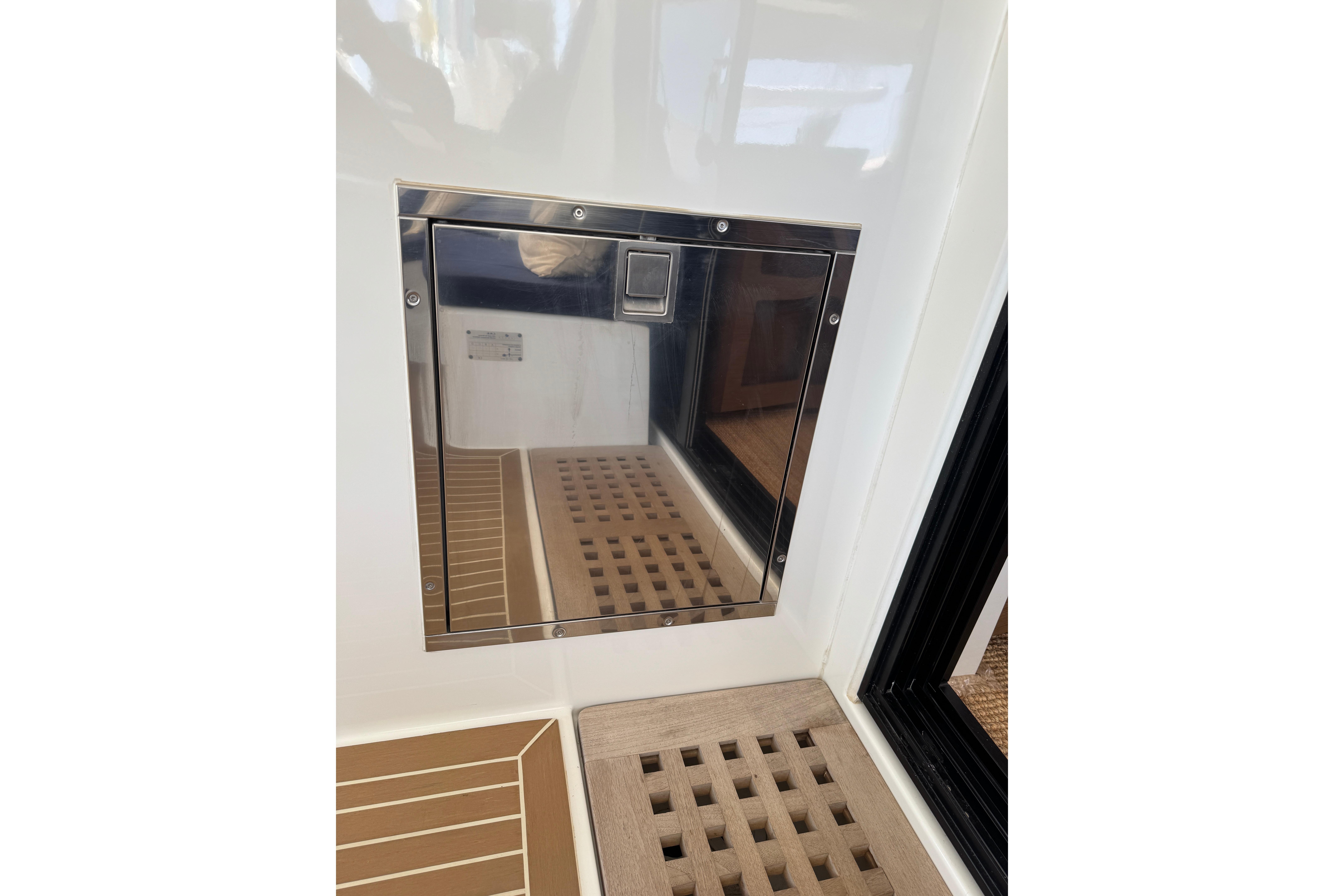 A small staircase from each pontoon leads up to the central grand salon. Once again, a space filled with light from the surrounding large windows on the sides and facing the front of the boat and the large sliding glass doors leading out to the aft deck. The saloon accommodates a large comfortable sofa group, navigation area, and the galley. In the galley you will find a 3-burner gas stove and oven, a fridge, a freezer and spacious cabinets for storage. From the grand salon, the sliding glass doors lead out to the aft deck where you find several relaxing seating areas and a sofa seating up to 6 people with a fixed table and a fridge for cold drinks. The aft deck floor is updated with Flexiteek that is both durable and easy to maintain. The whole aft deck is covered with a fixed hard top roof and can be fully enclosed with covers on all sides. Also located by the aft deck are the davits for hoisting and securely holding the dinghy when not used. Above the davits are the 1050W solar panels that also cover and protect the dinghy.