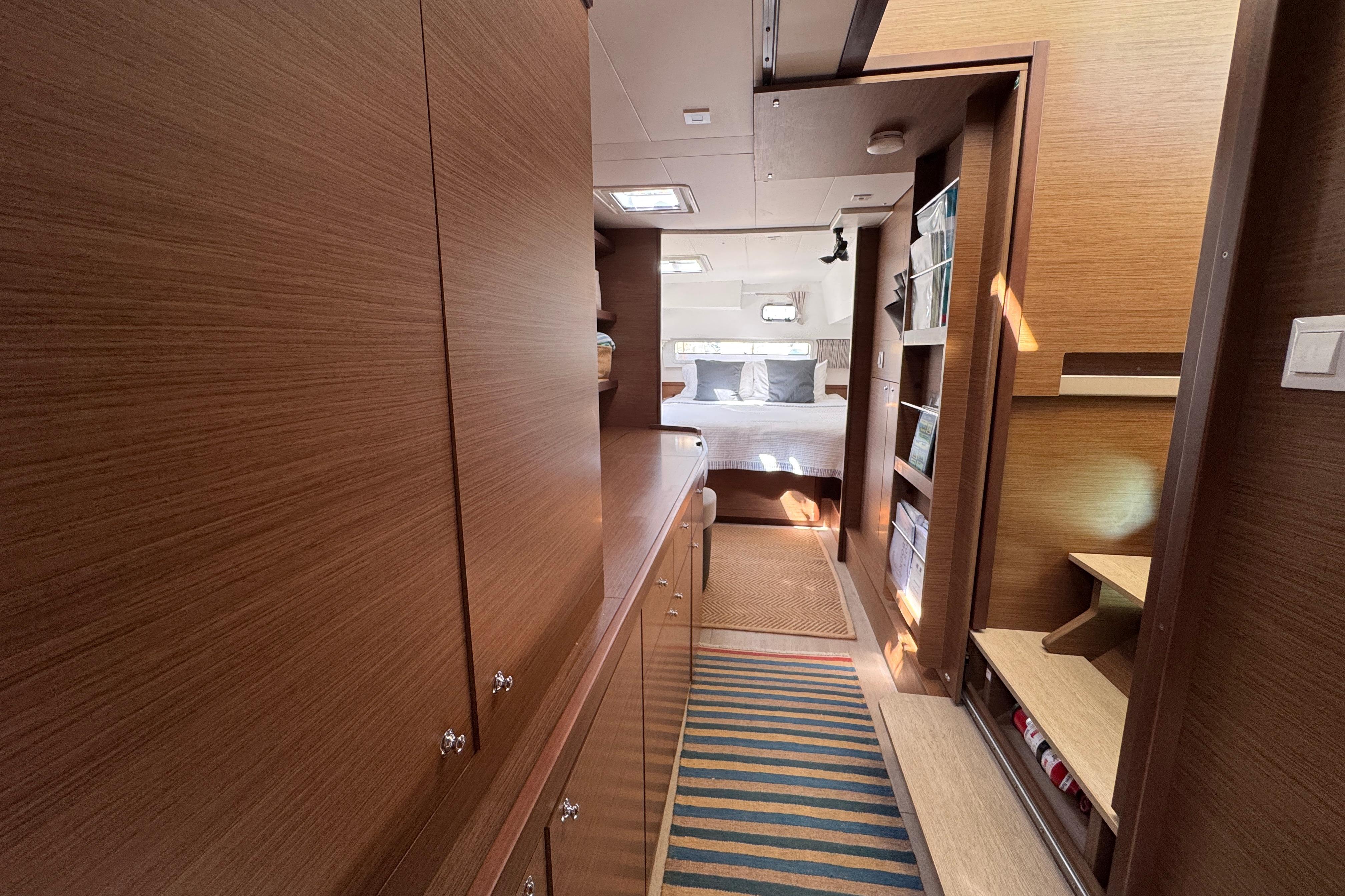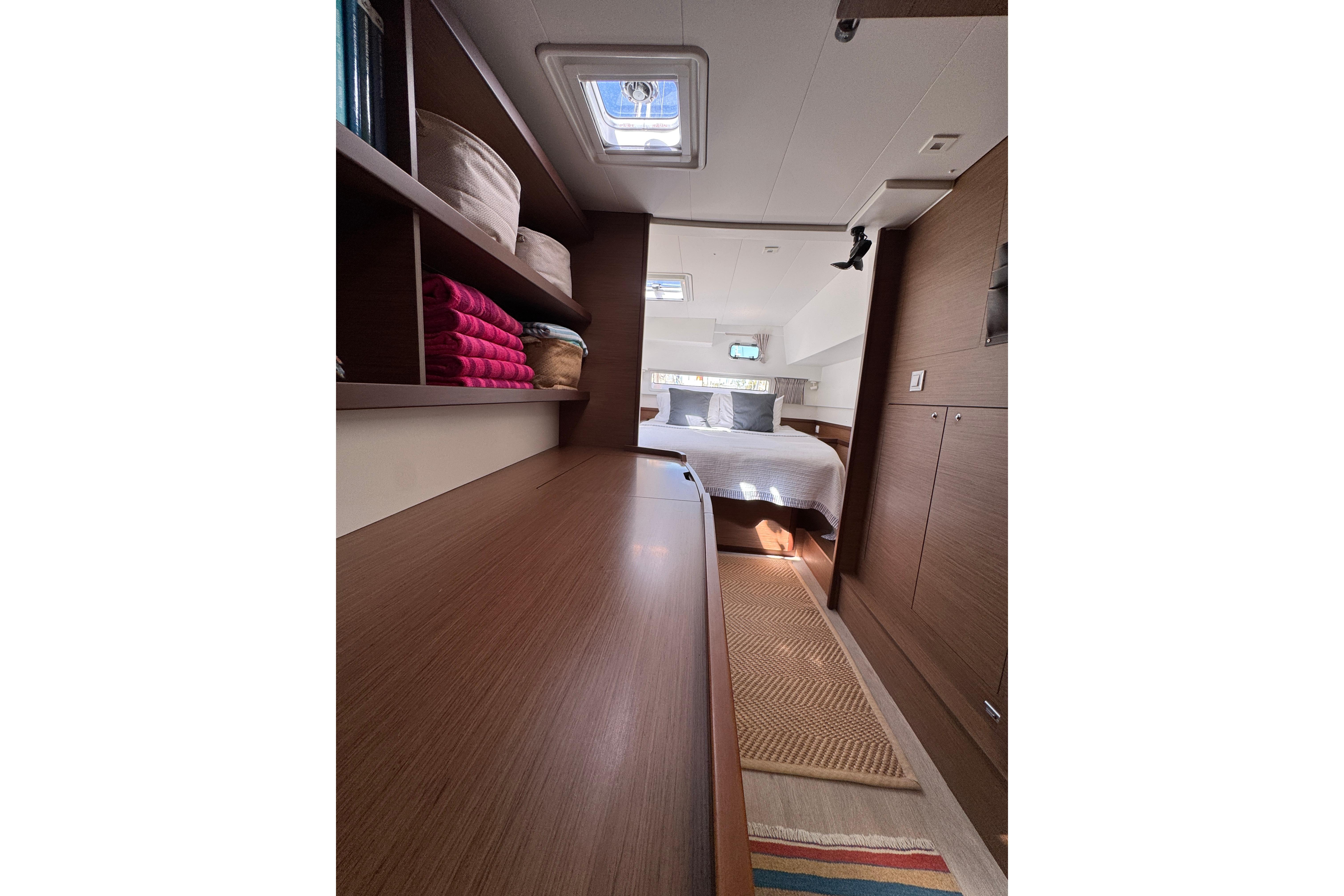 This Lagoon 42 is meticulously maintained and in perfect condition!  An absolute top-class yacht equipped with everything you need to sail in comfort and style. The spacious and generous areas are ideal for family sailing and for inviting friends along. The execution of this owner’s version consists of 3 double bed cabins, each with its own private head. The master cabin is located in the starboard pontoon with an airy sleeping section and plenty of light from windows all around. Directly adjacent is a storage and office area where the washing machine is located. In the forward end of the pontoon is the head with an electric toilet, washing basin, a separate shower and again, plenty of storage space. The other two cabins are located at each end of the port side pontoon. Both with good storage and adjacent head.