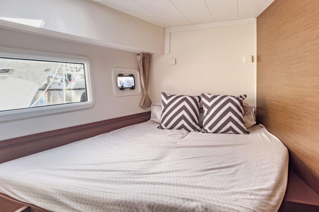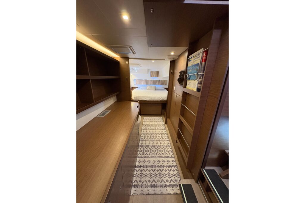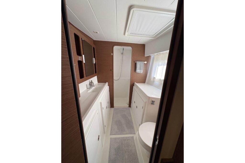 3 cabins and what cabins! Island double beds for the aft cabins and beds with side access for the forward cabins, the aft cabins benefit from a bathroom with a separate shower, very large windows in the cabins offer excellent illumination and magnificent views of the surroundings, the vertical glazing in the coachroof provides saloon illumination: a well-lit, comfortable environment that is perfectly balanced between the galley and saloon areas, the U-shaped galley, fully fitted with broad work surfaces and extensive storage space, is oriented towards the external cockpit.