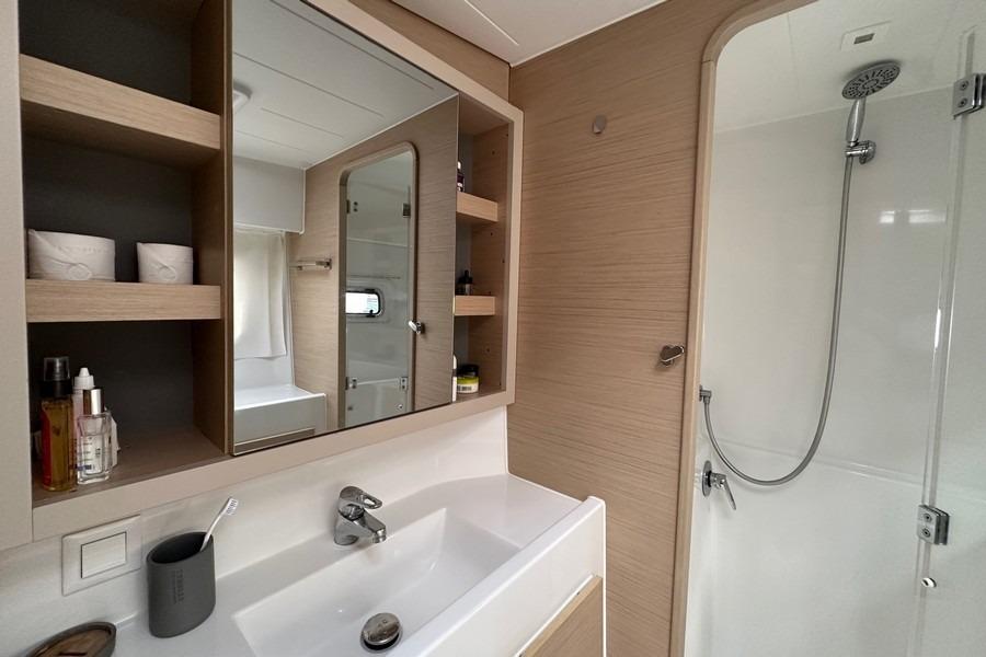 The owners version layout, combined with the fitted forepeaks, offers the best balance of comfort, space and flexibility. The starboard hull features a magnificent owner’s suite with a lounge area, dedicated desk, large private bathroom and a washing machine. The port hull follows the classic layout with two spacious guest cabins and two bathrooms. The two forepeaks, each fitted with a berth, provide additional guest accommodation or flexible storage/utility space. This custom layout was developed by our team directly from Lagoon’s plans. We also carried out the lithium and solar installation in 2025, giving the boat exceptional autonomy—meaning the generator is only required for air conditioning.