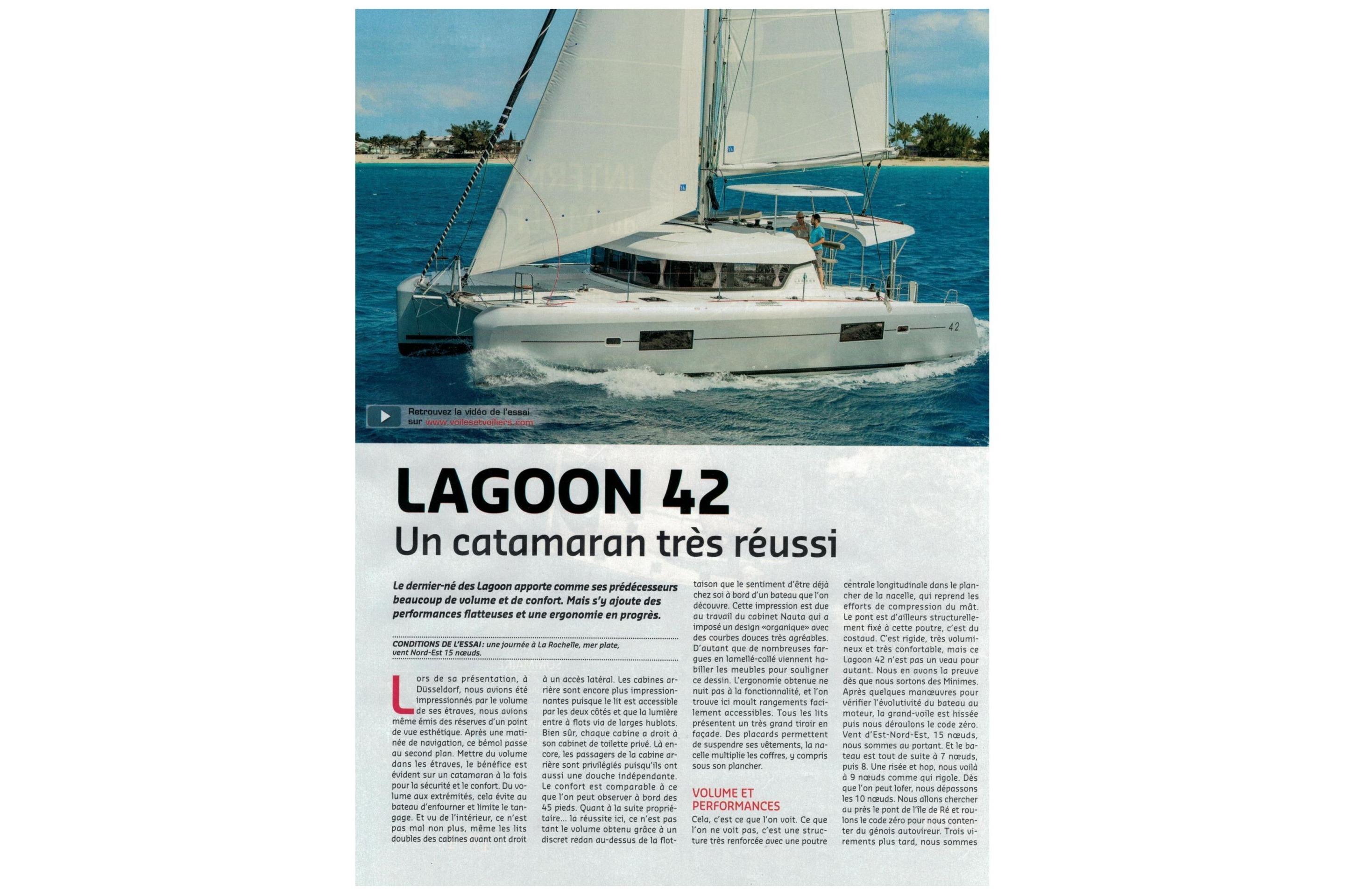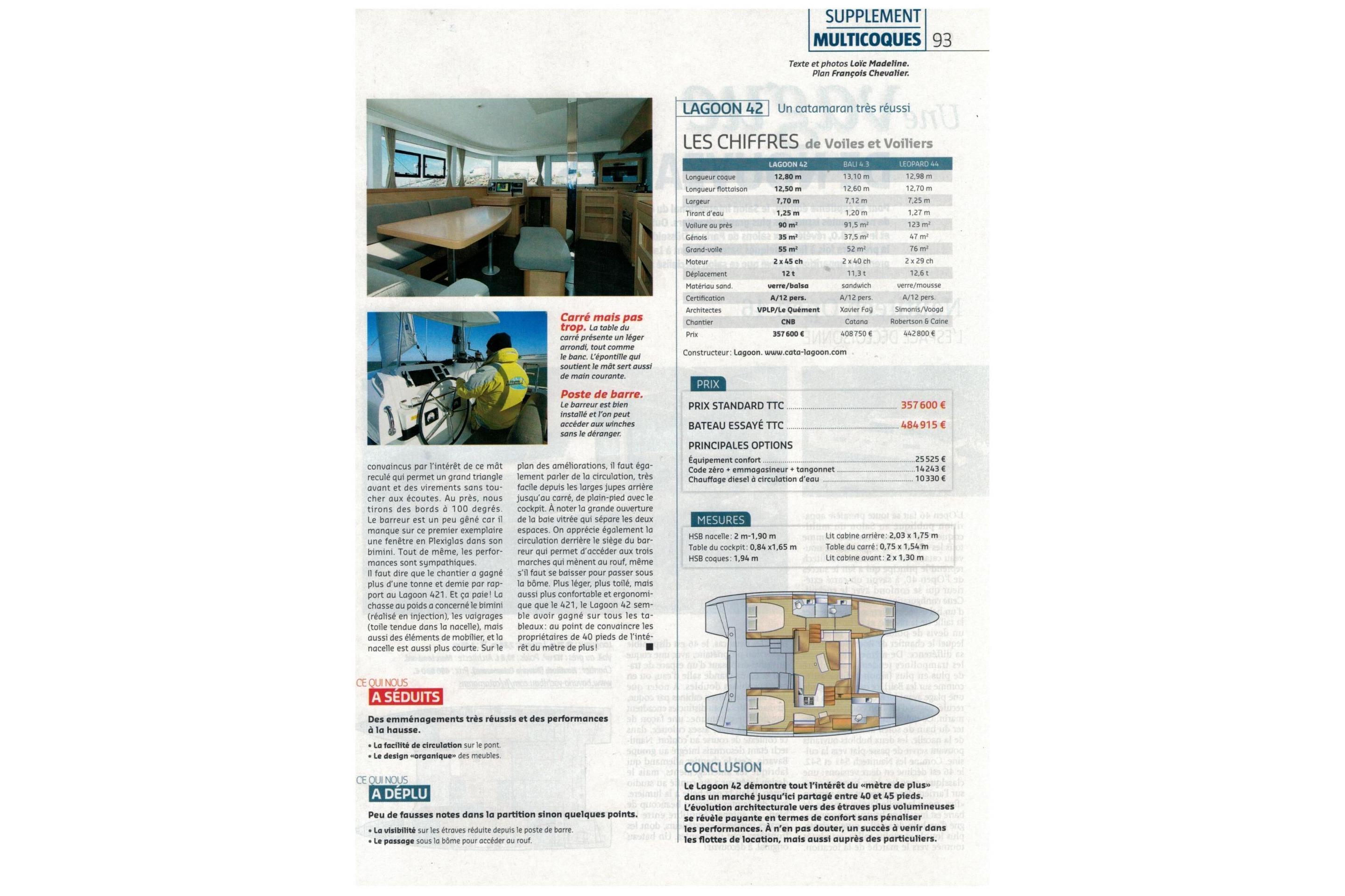 Lagoon 42, un magnifique catamaran de 2016, en version 4 cabines, mesurant une longueur totale de 12,80 mètres. Fabriqué en fibre de verre durable, ce navire possède un design de coque élégant et efficace, garantissant à la fois stabilité et performance sur l'eau.