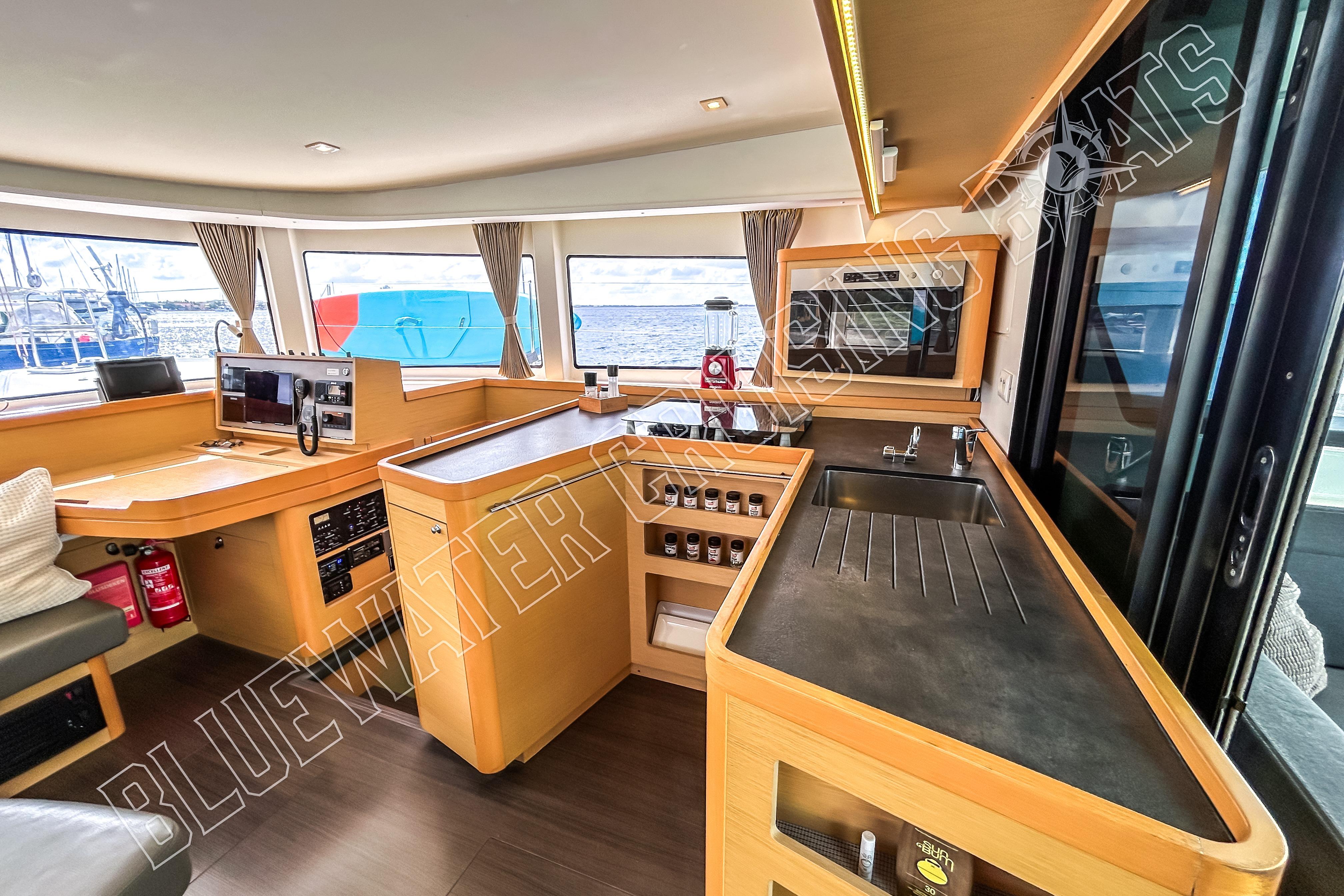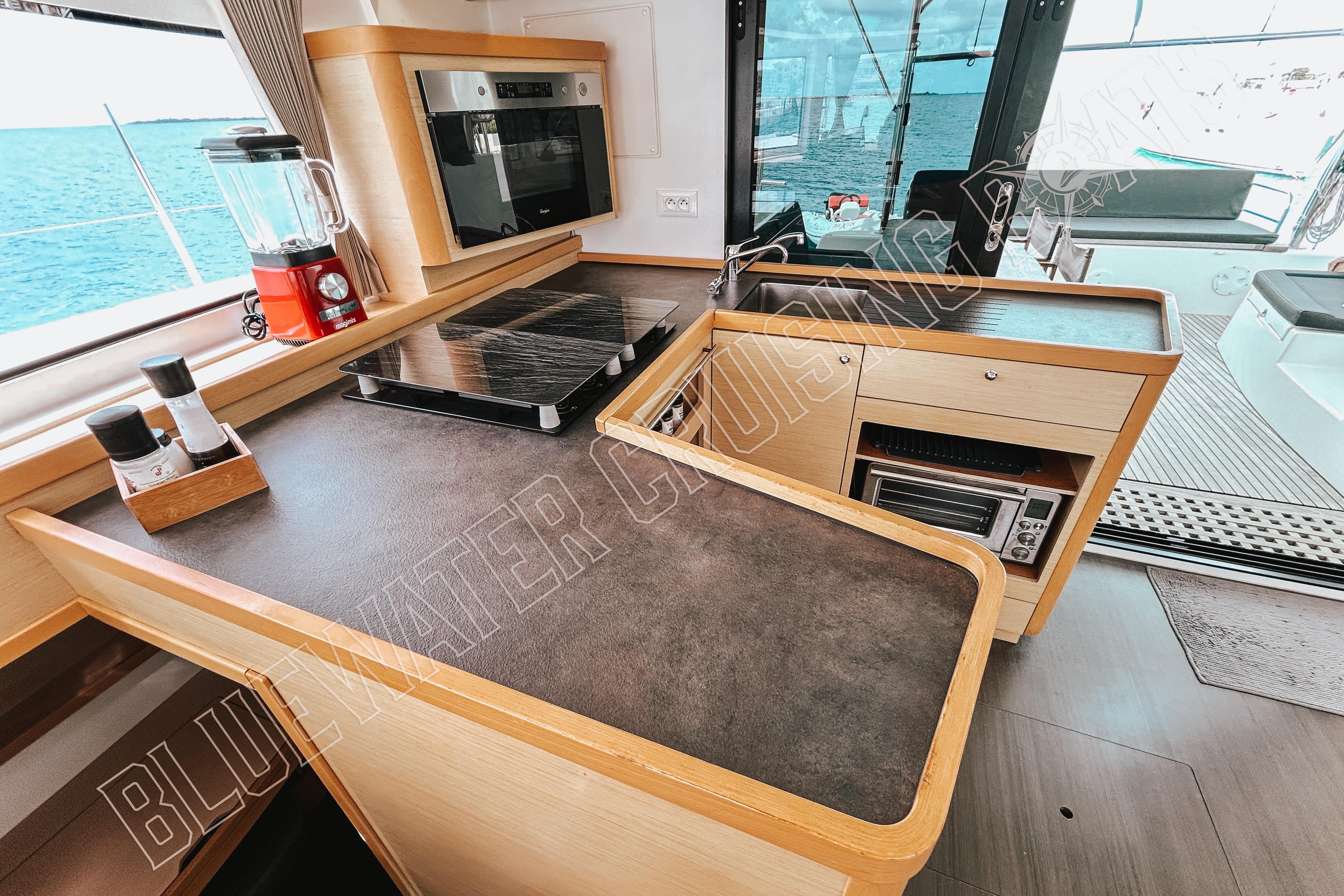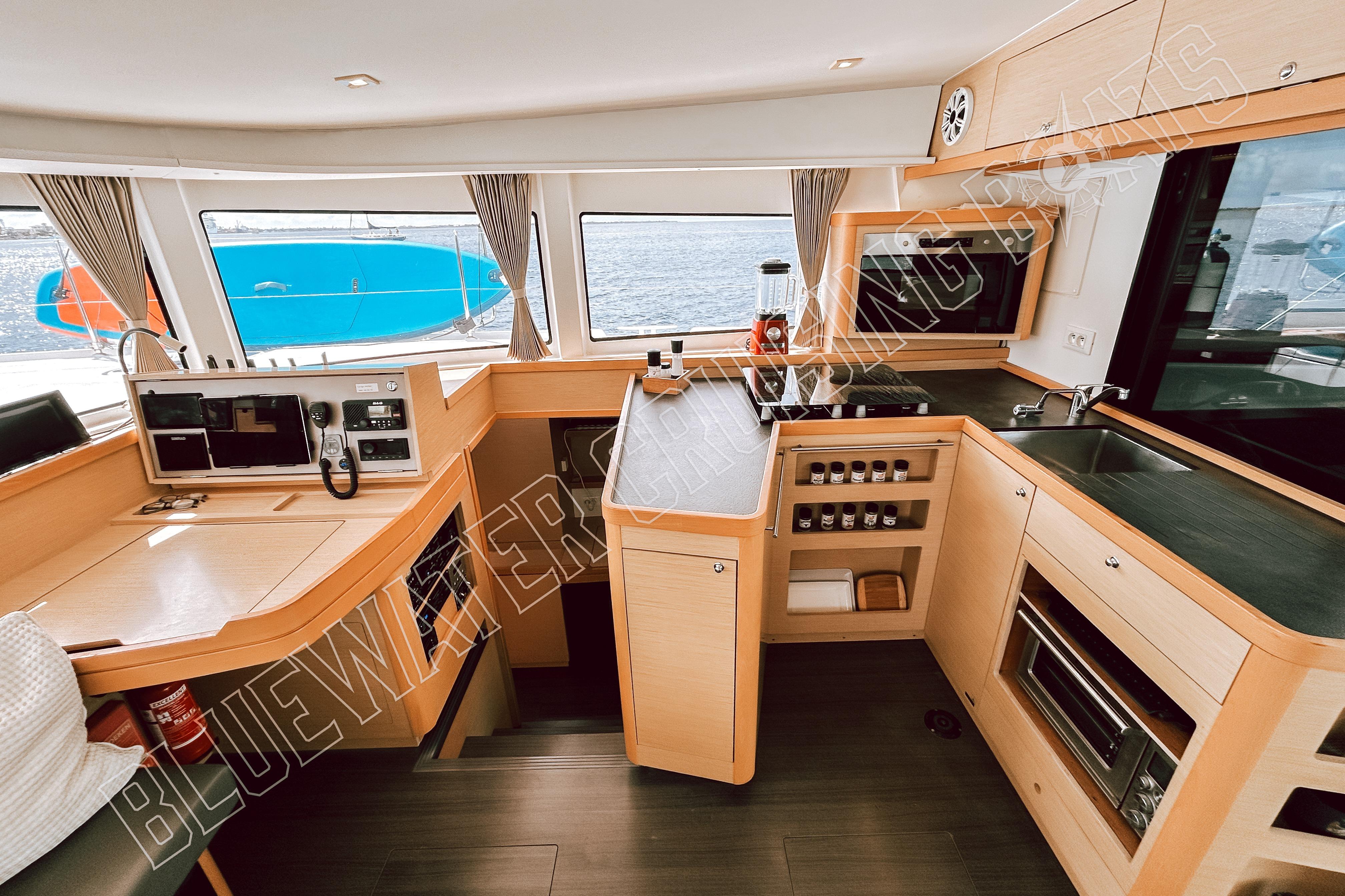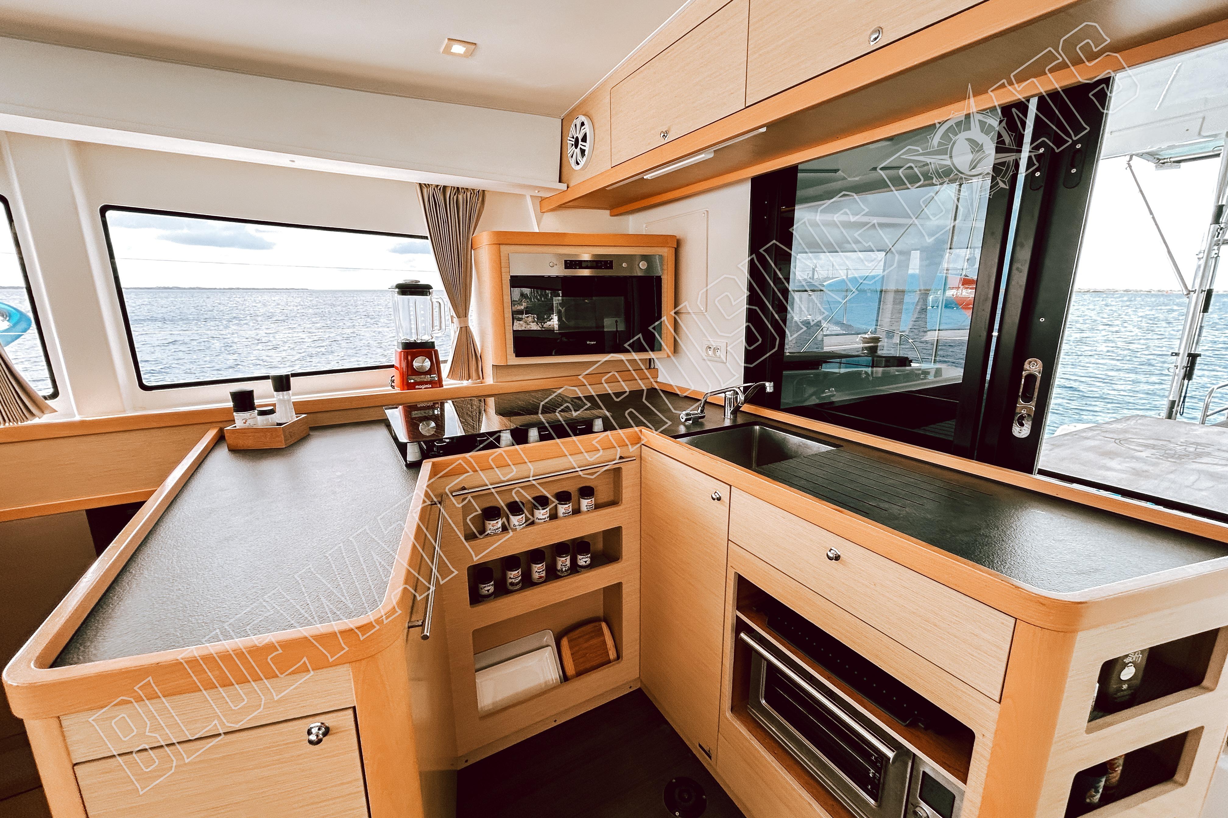 Large sliding door opens saloon/galley to cockpit, blending indoor and outdoor living
