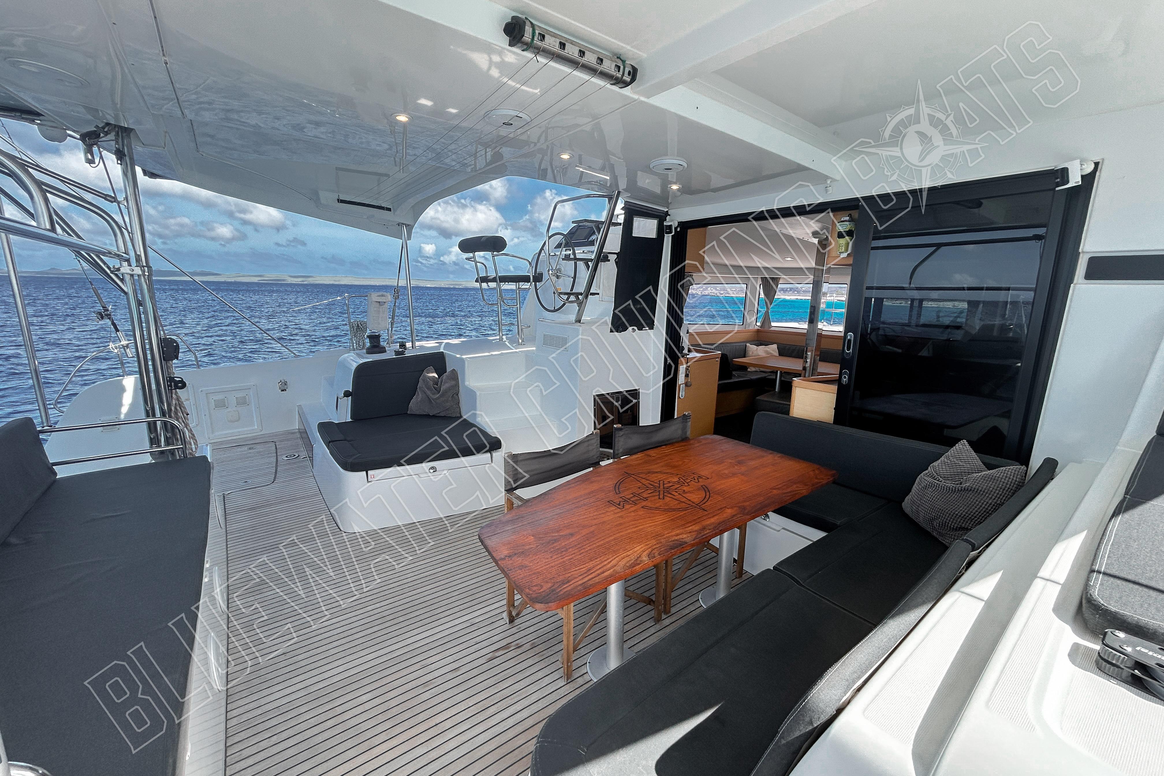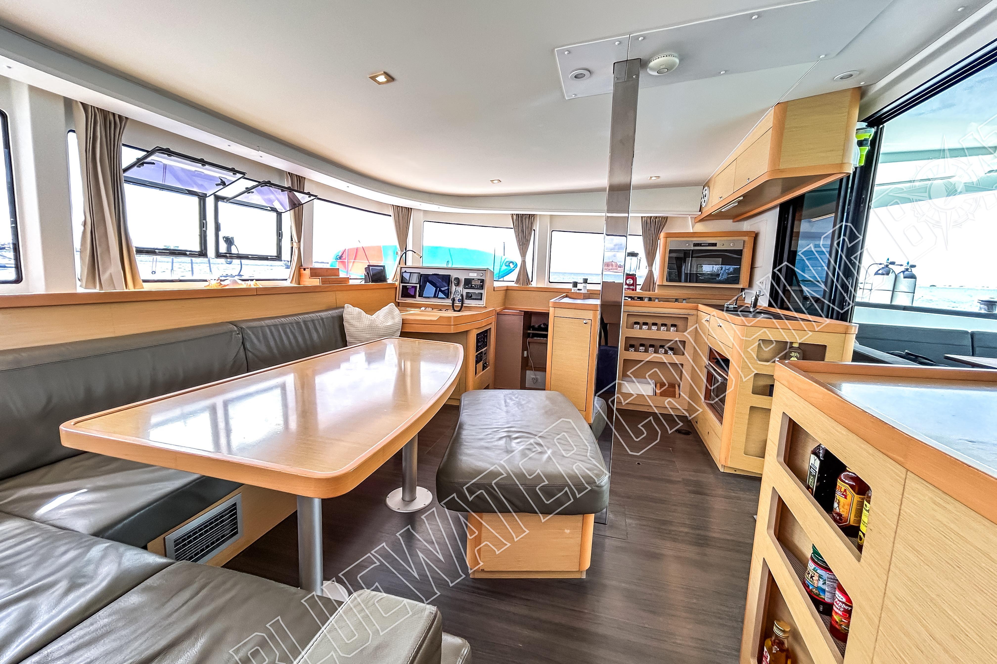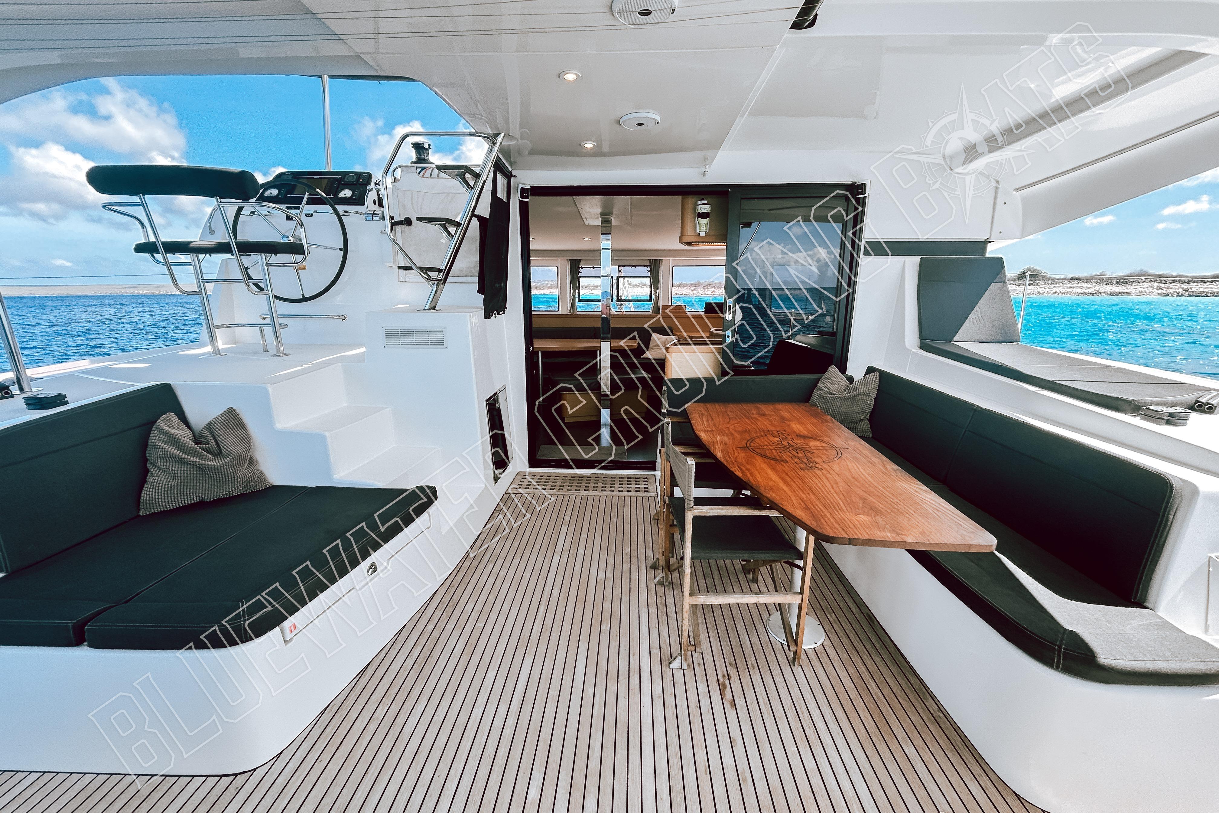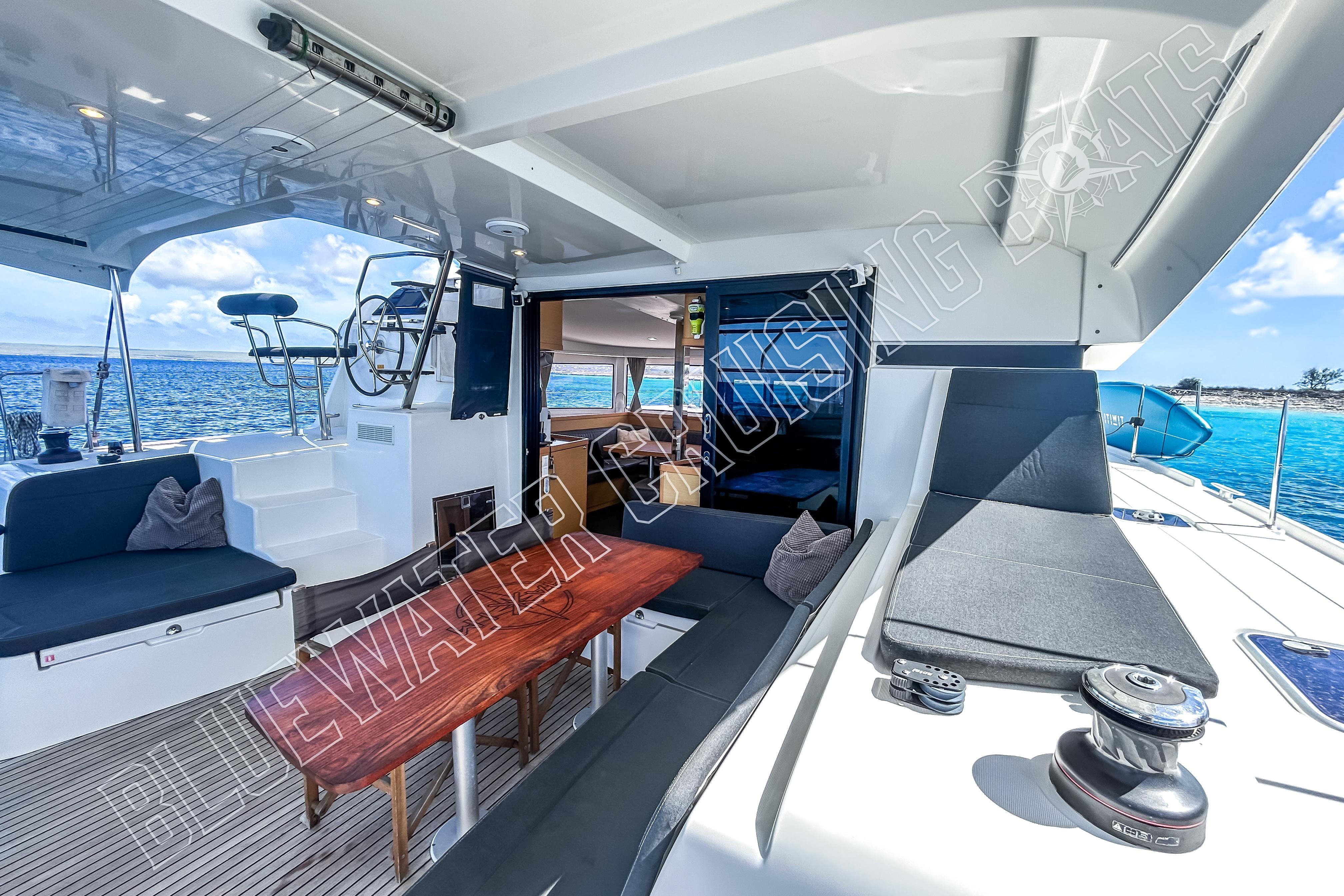 Large sliding door opens saloon/galley to cockpit, blending indoor and outdoor living