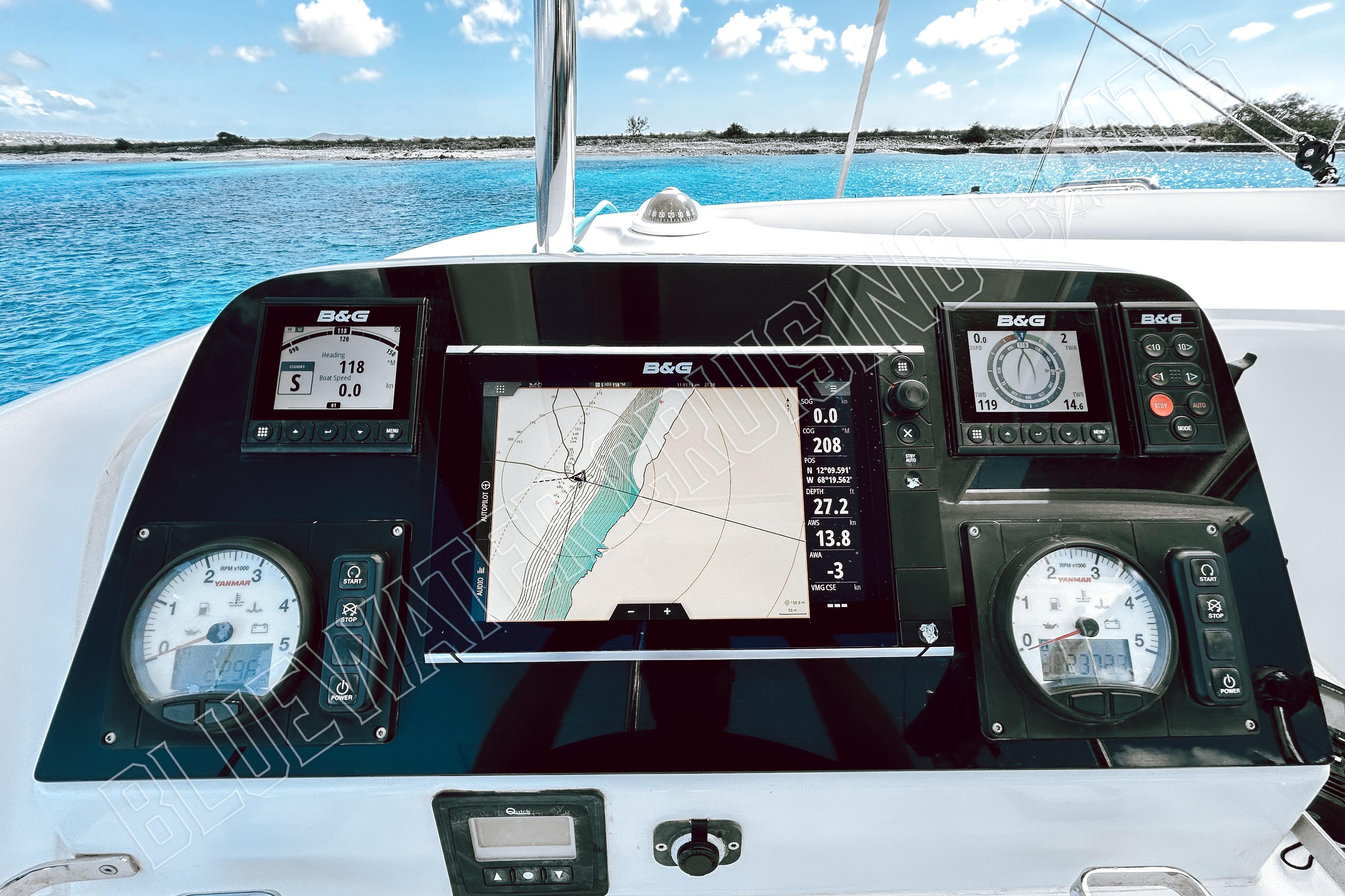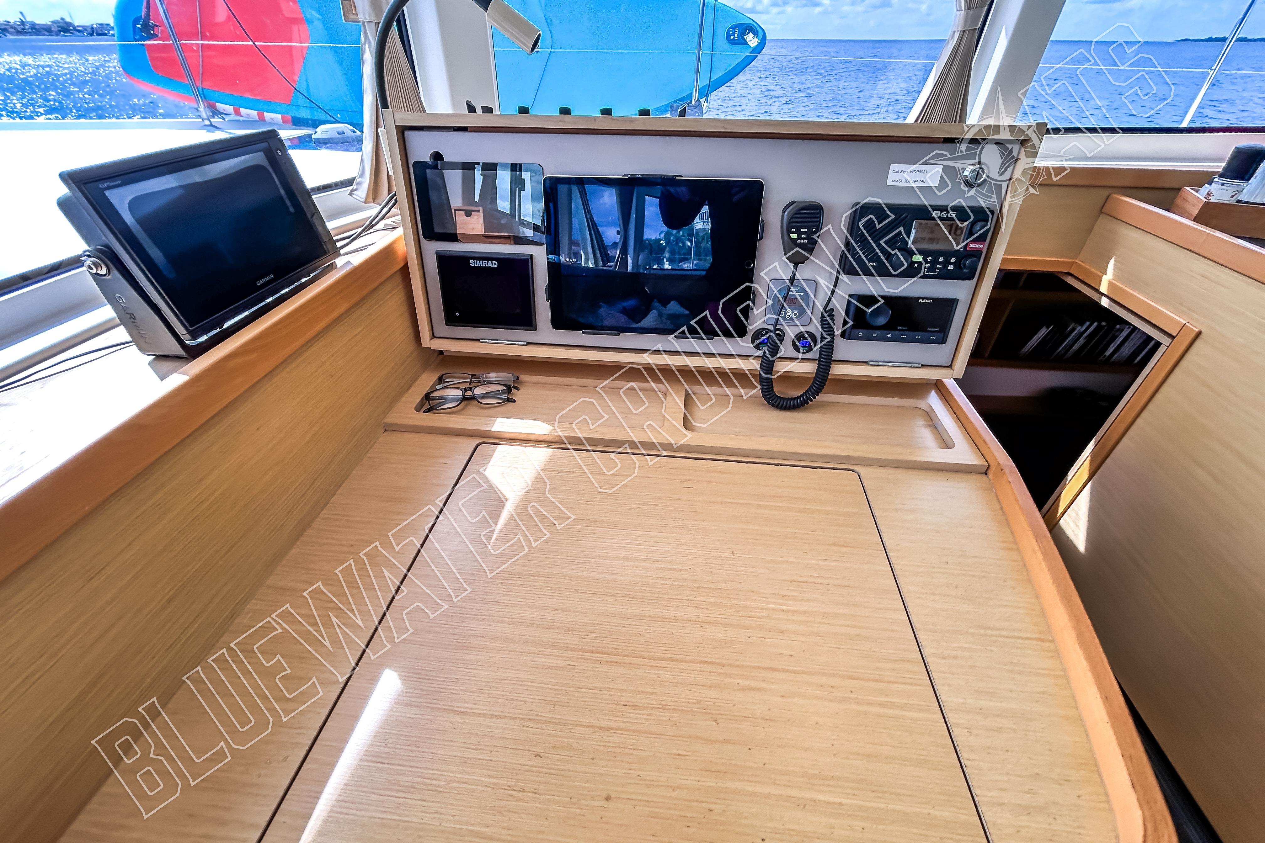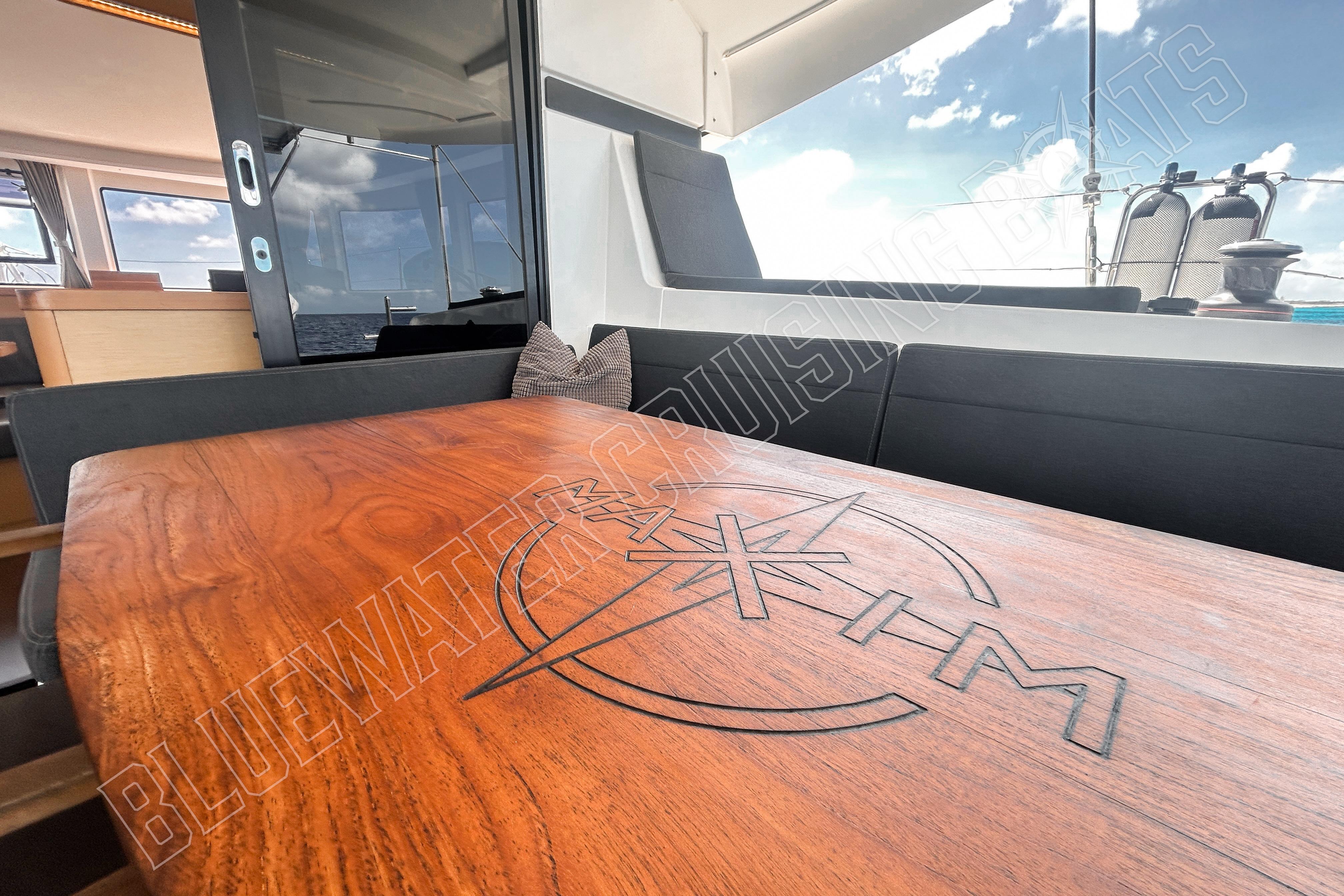 The sport deck helm aboard MAXIM is a true command center, thoughtfully elevated for panoramic visibility and easy communication with the cockpit and crew. Accessed by a set of steps leading up from the teak-floored cockpit, the helm offers ergonomic seating and intuitive access to sail controls and winches, ensuring a comfortable and responsive sailing experience. From the helm, a few steps further lead up to the aft cockpit roof, where a spacious sun pad invites relaxation and several solar panels provide efficient, eco-friendly power generation. The cockpit itself is a social hub, featuring elegant teak flooring, generous bench seating for guests, and a stunning custom laser-engraved cockpit table for memorable alfresco dining. A large sliding door seamlessly connects the cockpit with the light-filled saloon and galley inside, creating an open, fluid space ideal for entertaining or unwinding. At the helm, a full suite of B&G navigation electronics puts state-of-the-art sailing technology at your fingertips, making every voyage aboard MAXIM safe, enjoyable, and effortless.
