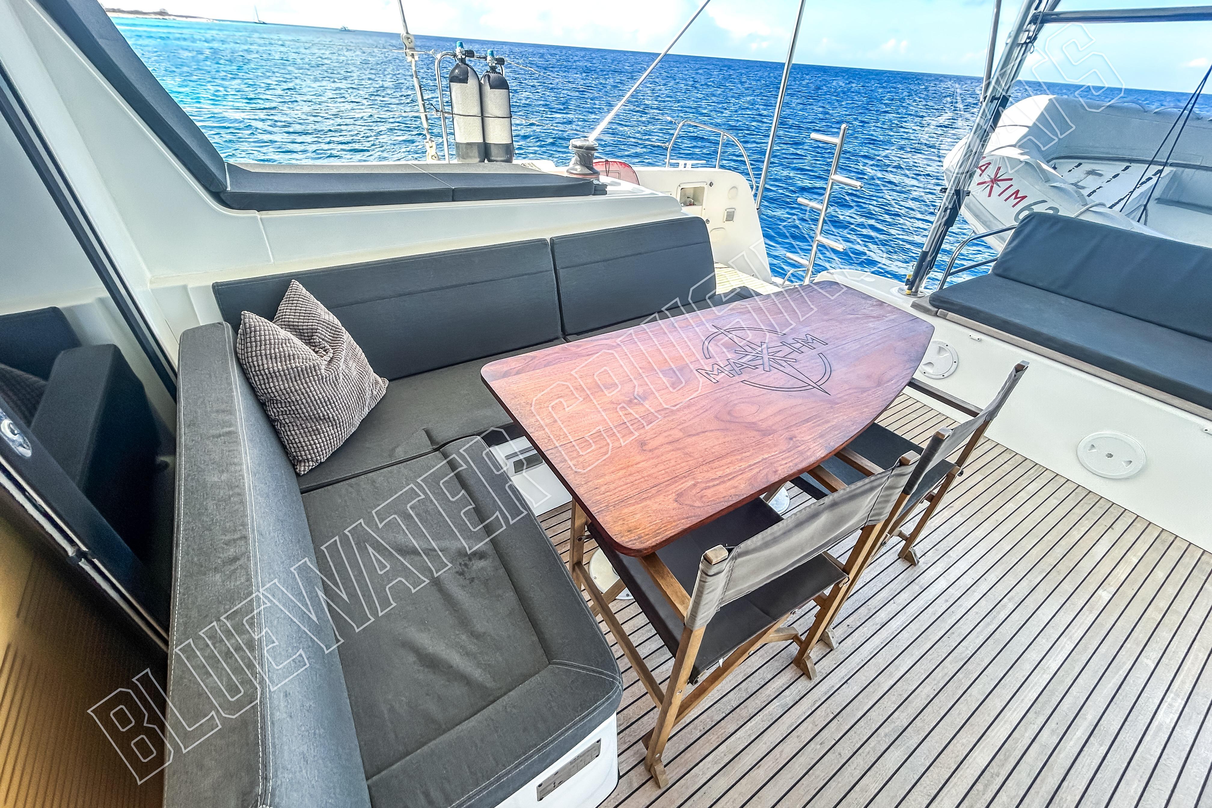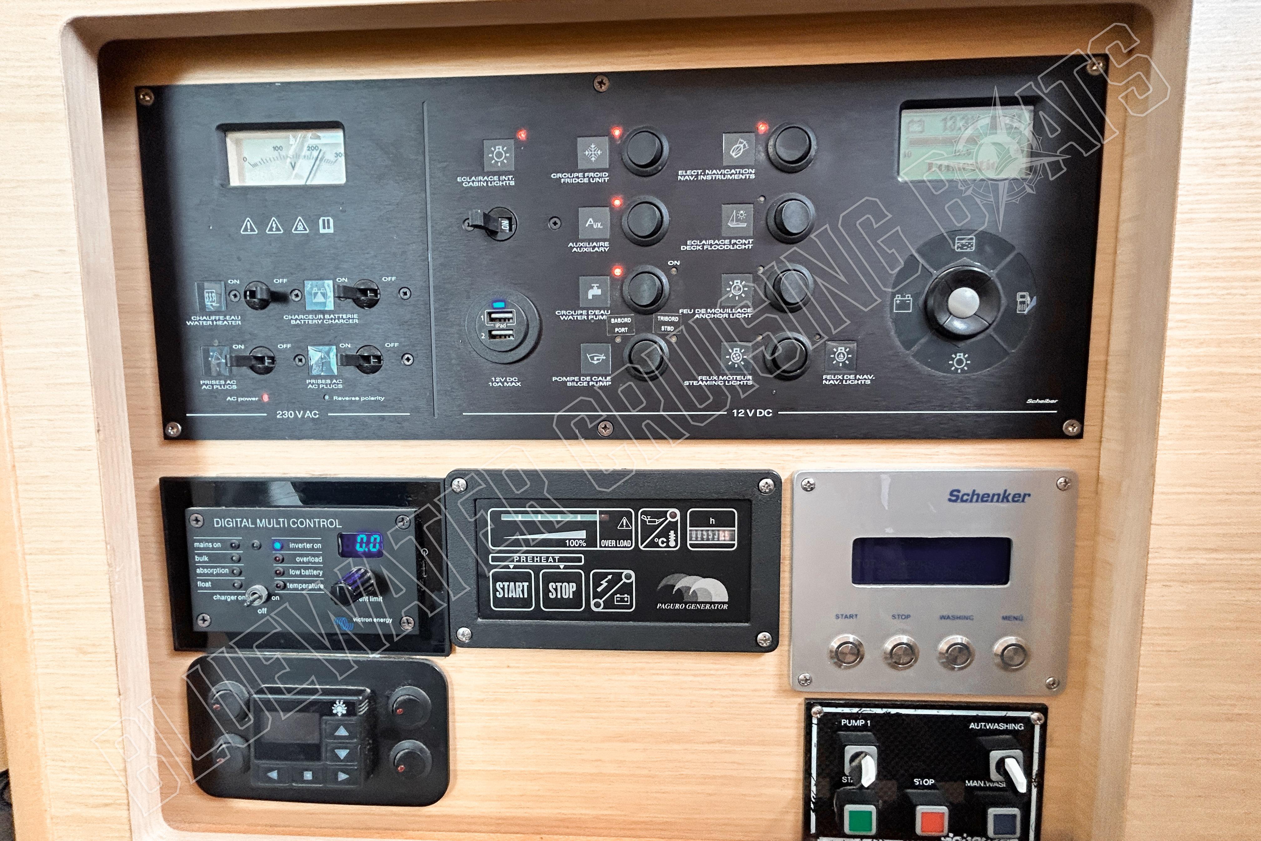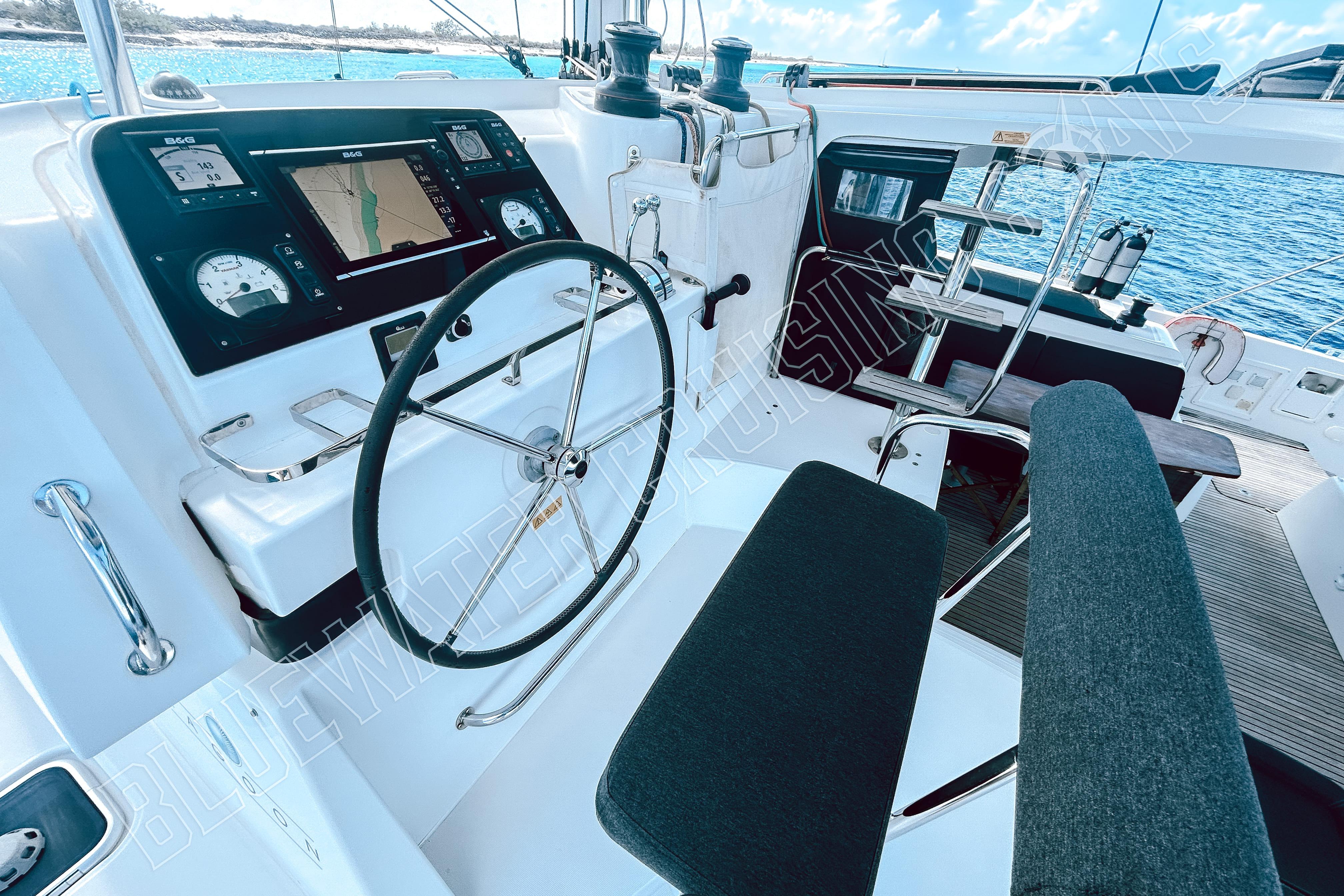 The sport deck helm aboard MAXIM is a true command center, thoughtfully elevated for panoramic visibility and easy communication with the cockpit and crew. Accessed by a set of steps leading up from the teak-floored cockpit, the helm offers ergonomic seating and intuitive access to sail controls and winches, ensuring a comfortable and responsive sailing experience. From the helm, a few steps further lead up to the aft cockpit roof, where a spacious sun pad invites relaxation and several solar panels provide efficient, eco-friendly power generation. The cockpit itself is a social hub, featuring elegant teak flooring, generous bench seating for guests, and a stunning custom laser-engraved cockpit table for memorable alfresco dining. A large sliding door seamlessly connects the cockpit with the light-filled saloon and galley inside, creating an open, fluid space ideal for entertaining or unwinding. At the helm, a full suite of B&G navigation electronics puts state-of-the-art sailing technology at your fingertips, making every voyage aboard MAXIM safe, enjoyable, and effortless.