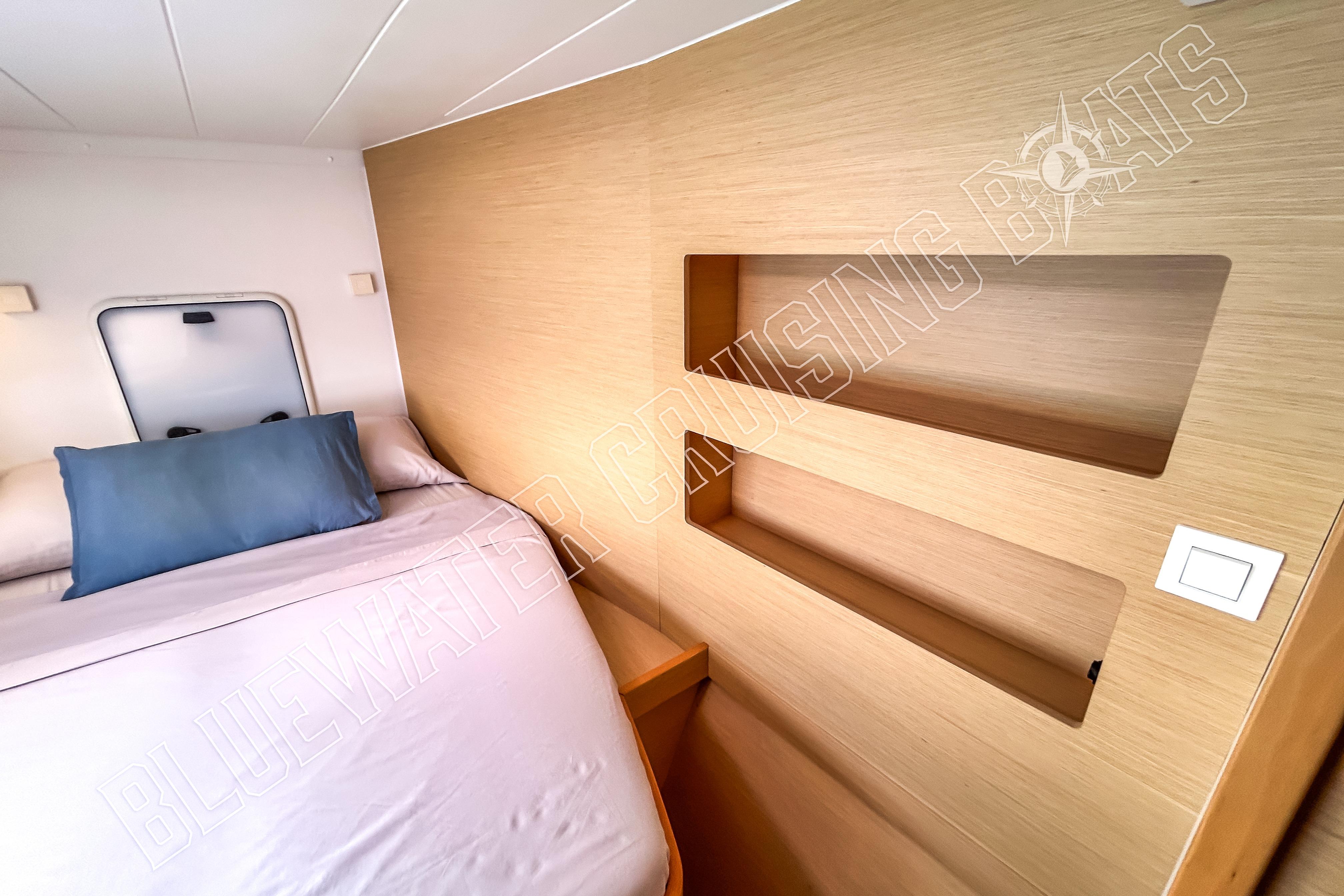The aft guest stateroom in the portside hull of MAXIM is designed to offer comfort and privacy for visiting friends or family. This well-appointed cabin features a spacious double berth, ample natural light from large hull windows and an overhead hatch, and generous storage options including a hanging locker and shelving. Contemporary finishes and quality materials create a relaxing, welcoming atmosphere, while integrated reading lights and ventilation ensure comfort day or night. With direct access to a nearby guest head and shower, the forward guest stateroom is a perfect retreat for extended stays at sea.