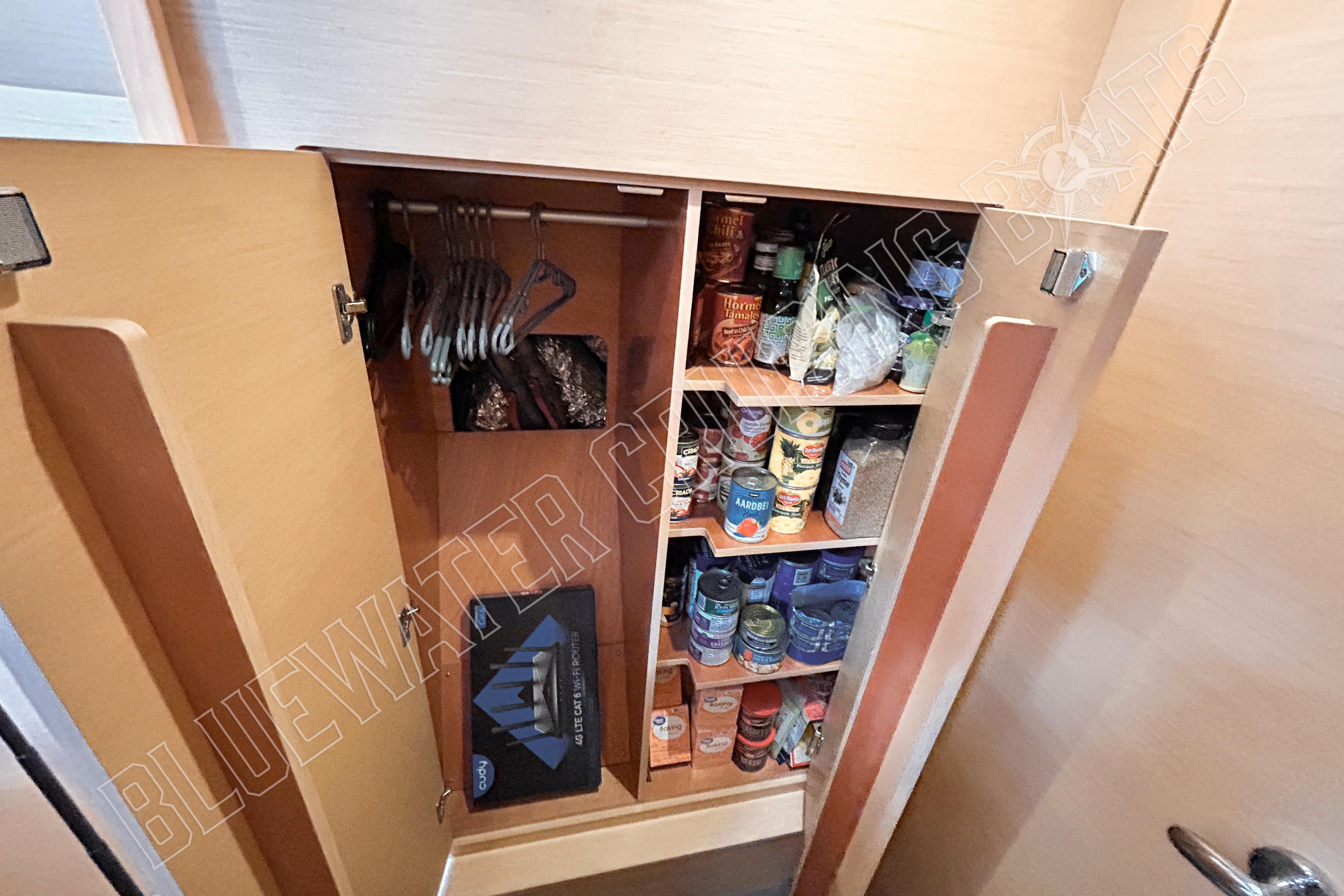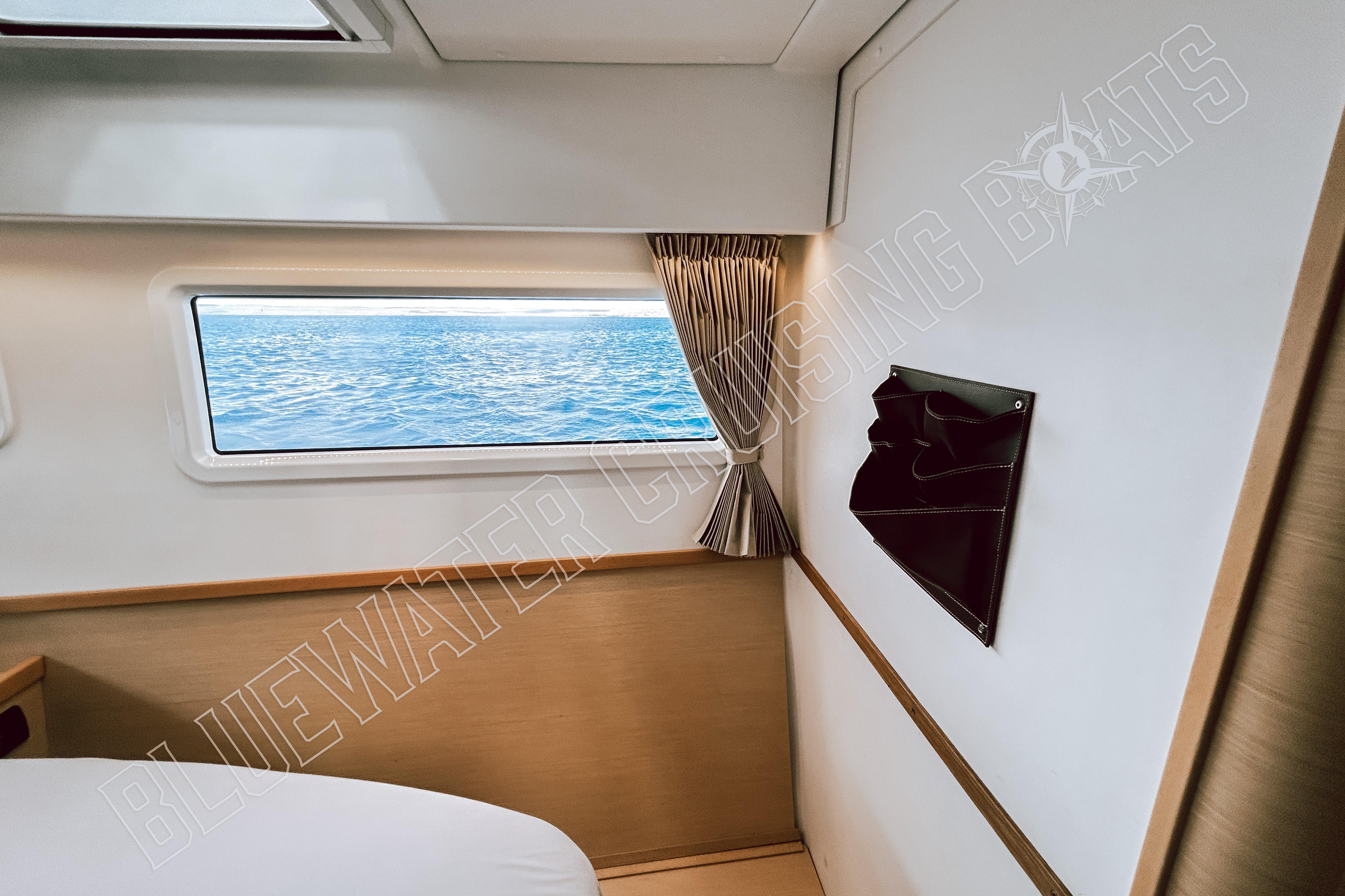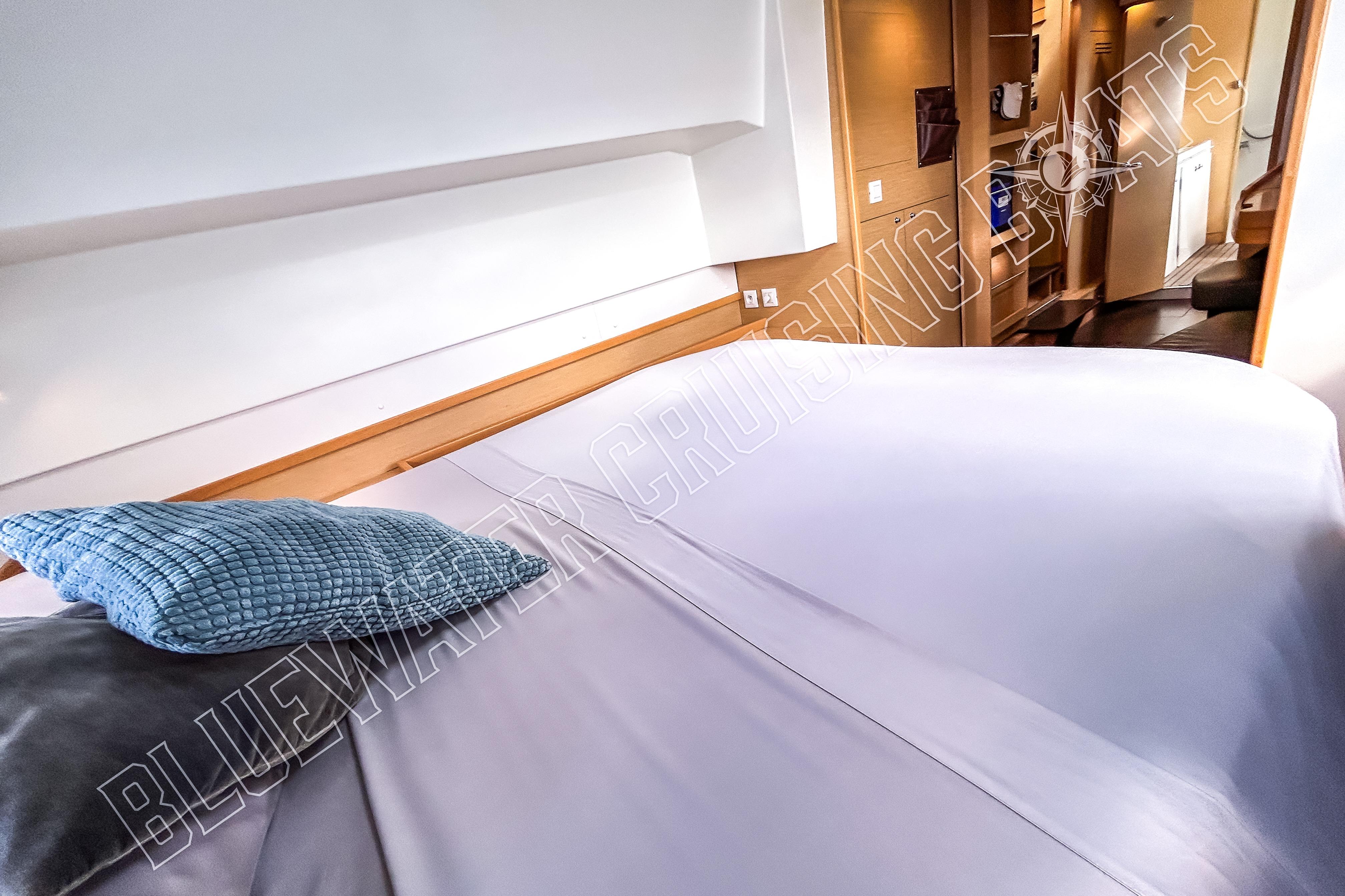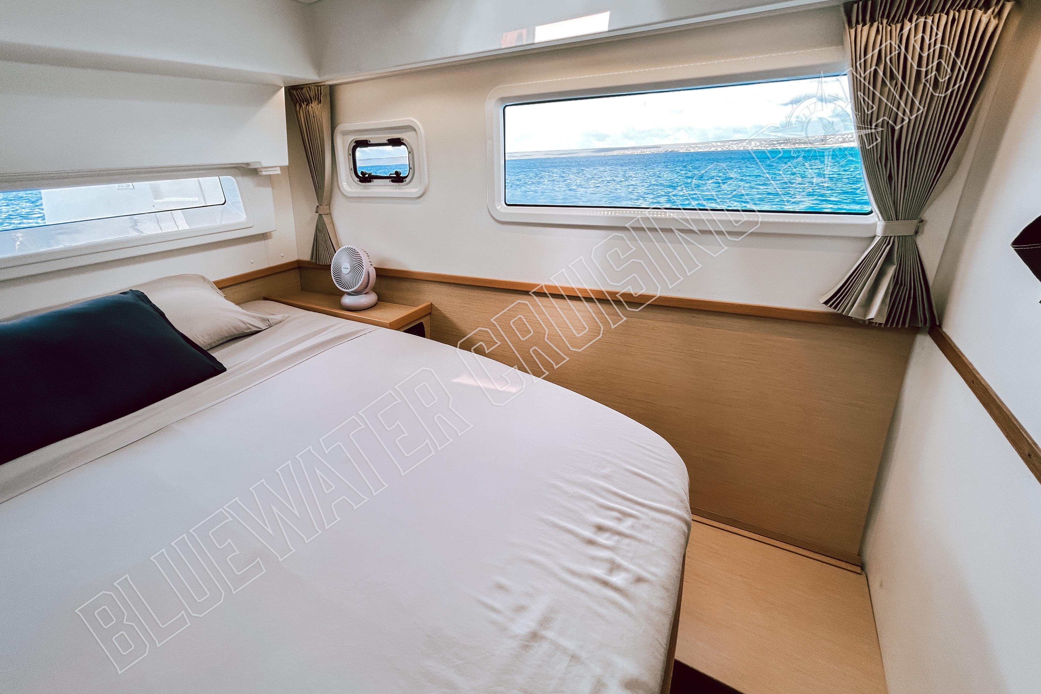 Occupying the entire starboard hull, the master suite aboard MAXIM offers an impressive retreat designed for ultimate comfort and privacy. The spacious stateroom features a luxurious island queen berth with panoramic hull windows that fill the space with natural light and provide stunning views. Ample storage is seamlessly integrated, including a large hanging locker, drawers, and additional shelving, ensuring plenty of room for extended stays. A dedicated vanity or work desk adds versatility, while elegant finishes and soft lighting create a serene, inviting atmosphere. Forward, the private en suite bath boasts a large separate shower, contemporary vanity with sink, and an electric flush toilet, all enhanced by top-quality fixtures and abundant ventilation. The master suite’s thoughtful layout and refined details make it a true sanctuary aboard MAXIM, perfect for relaxing after a day at sea.