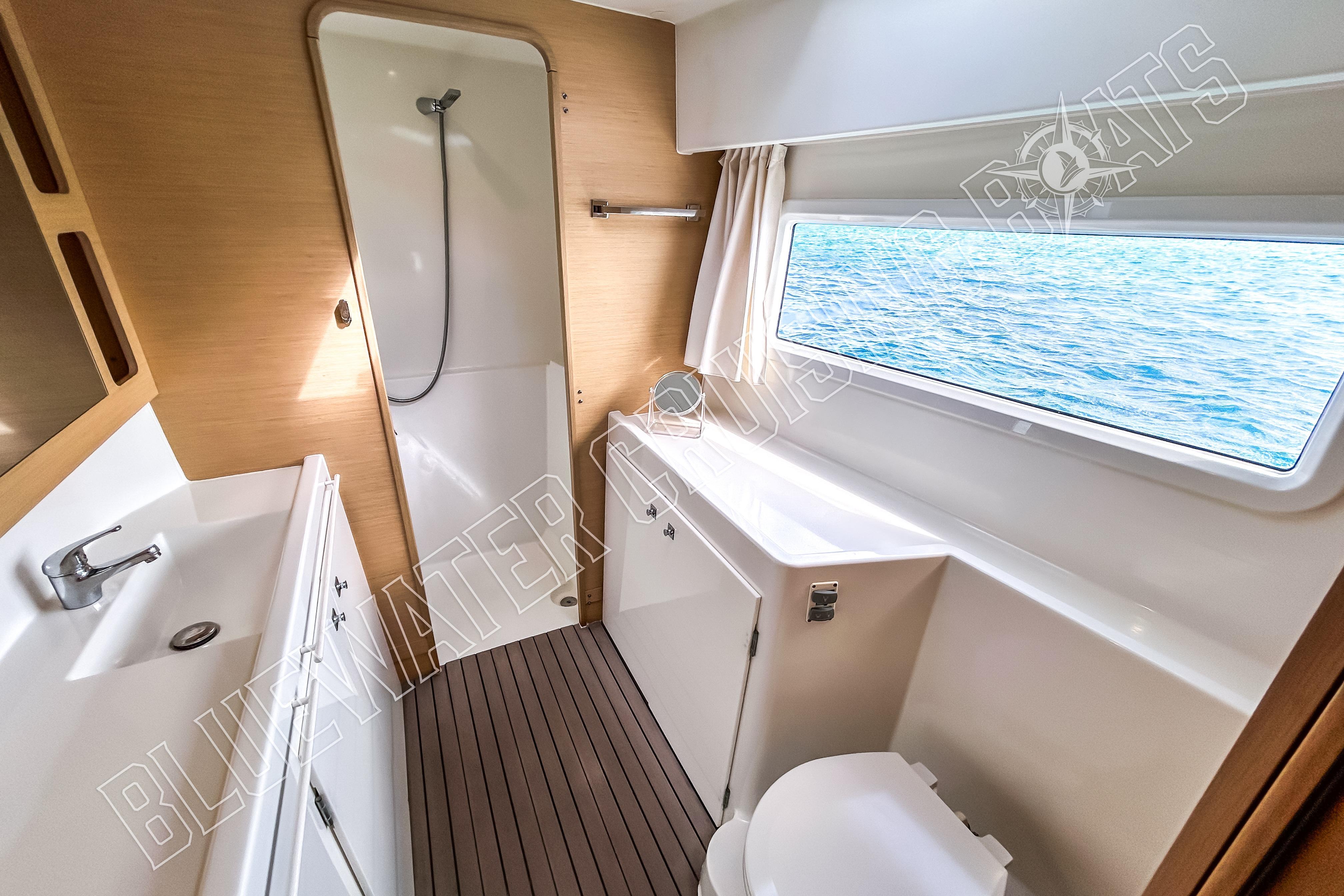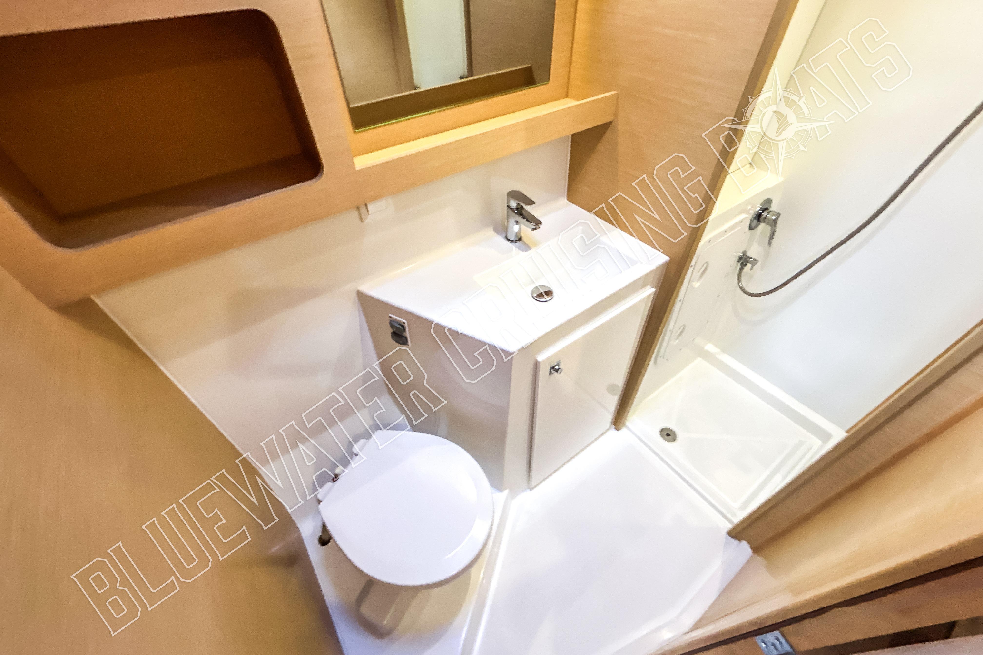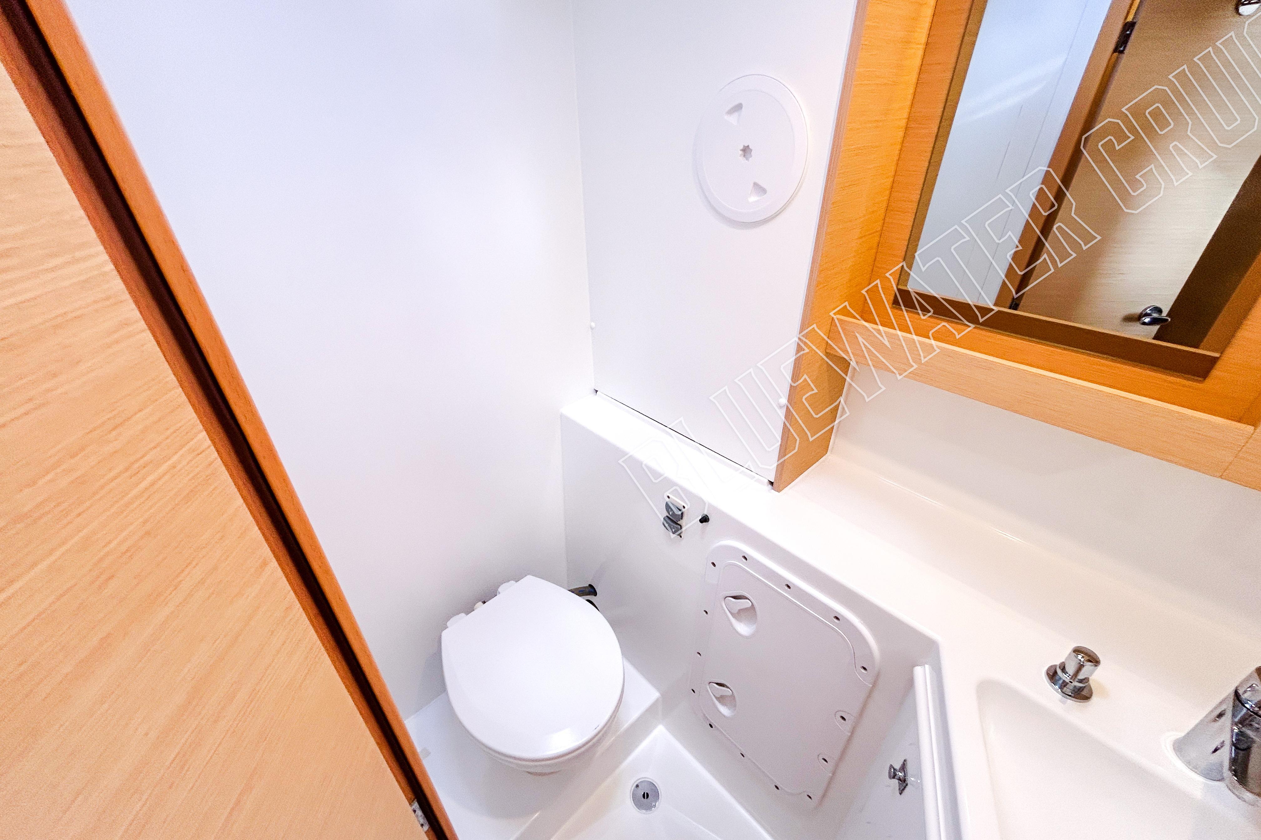 Adjacent to the forward guest stateroom in the portside hull, the forward guest head aboard MAXIM is designed with practicality in mind, featuring a wet head layout where the shower and toilet share the same space. This compact yet functional bathroom includes a contemporary vanity with sink, an electric flush toilet, and modern fixtures, all enhanced by natural light and ventilation. Thoughtful storage and clean finishes create a comfortable environment, making it easy for guests to freshen up and enjoy their time aboard. The wet head provides convenient access and privacy for those staying in the forward cabin, ensuring a pleasant cruising experience.