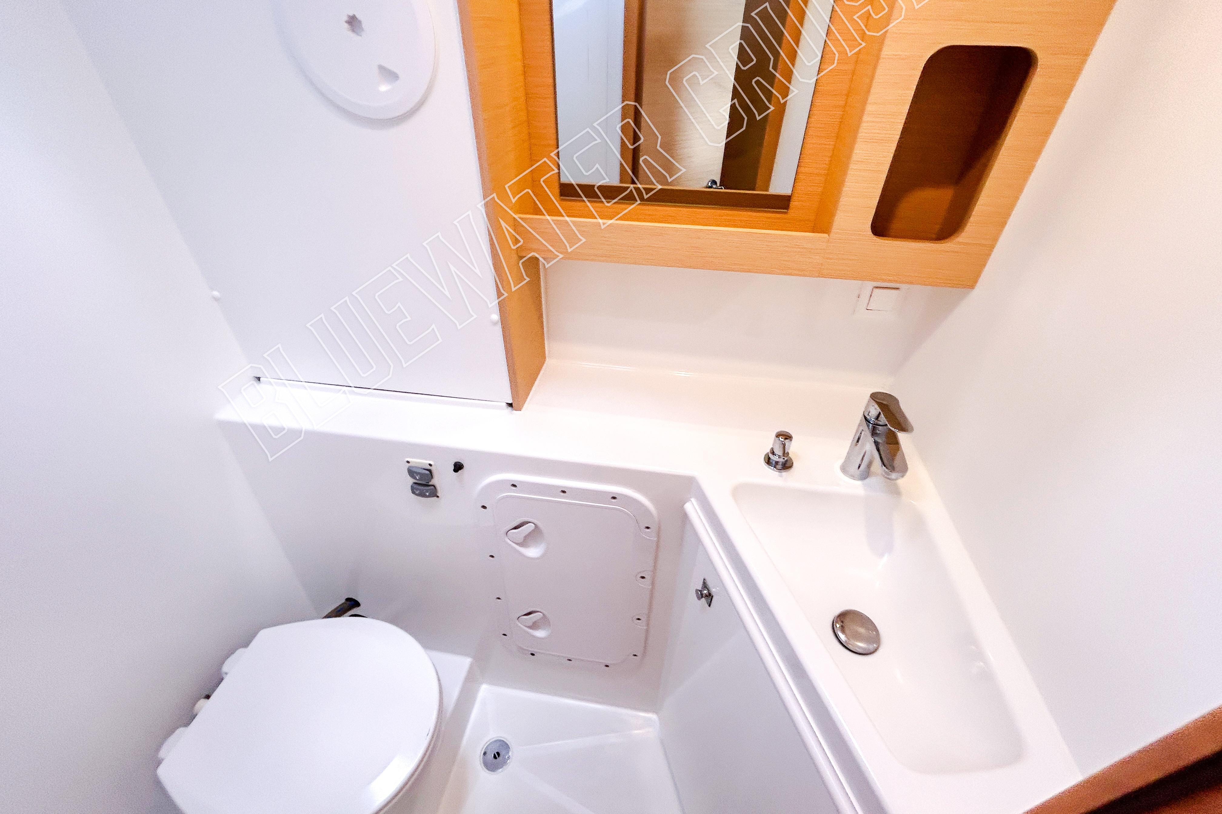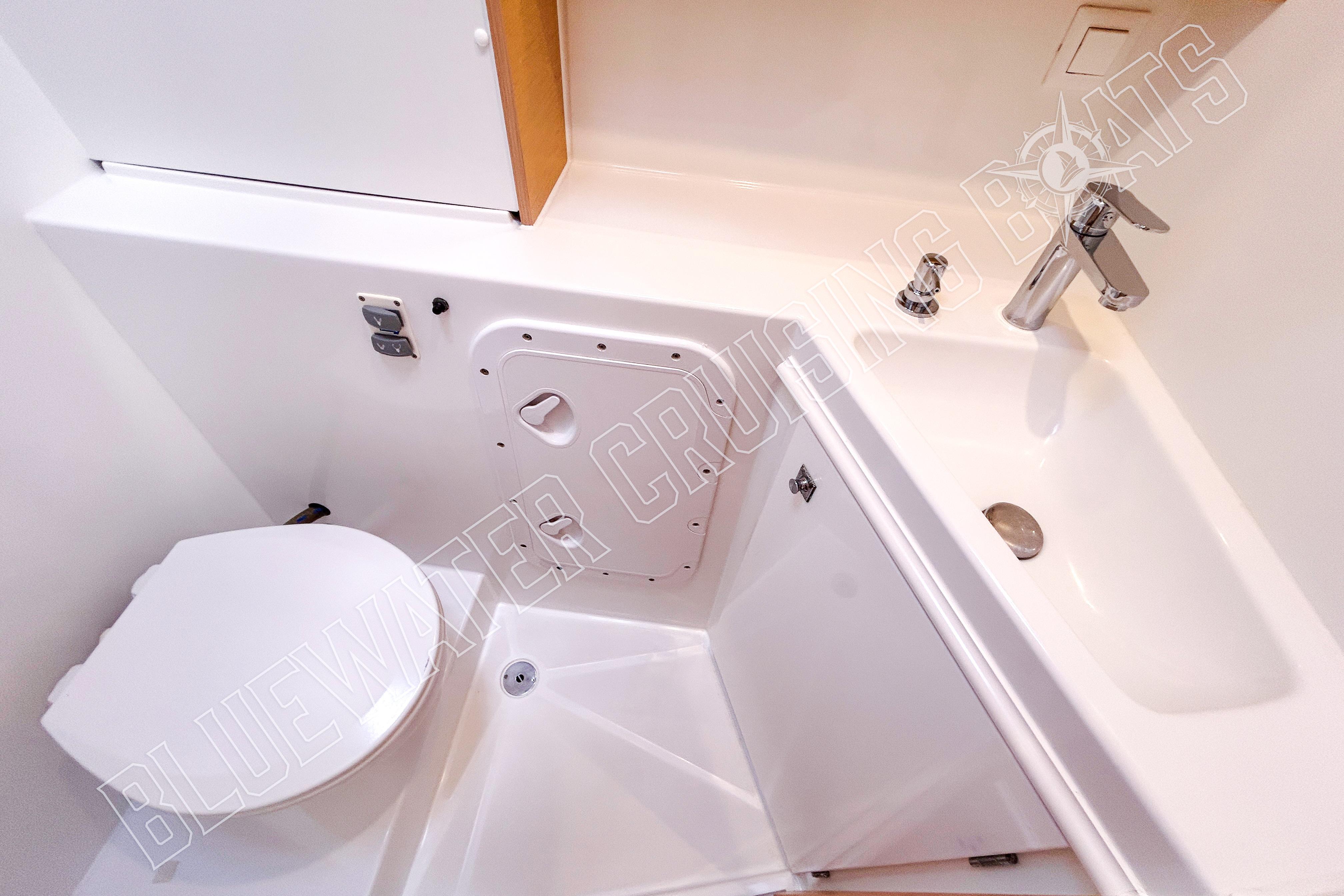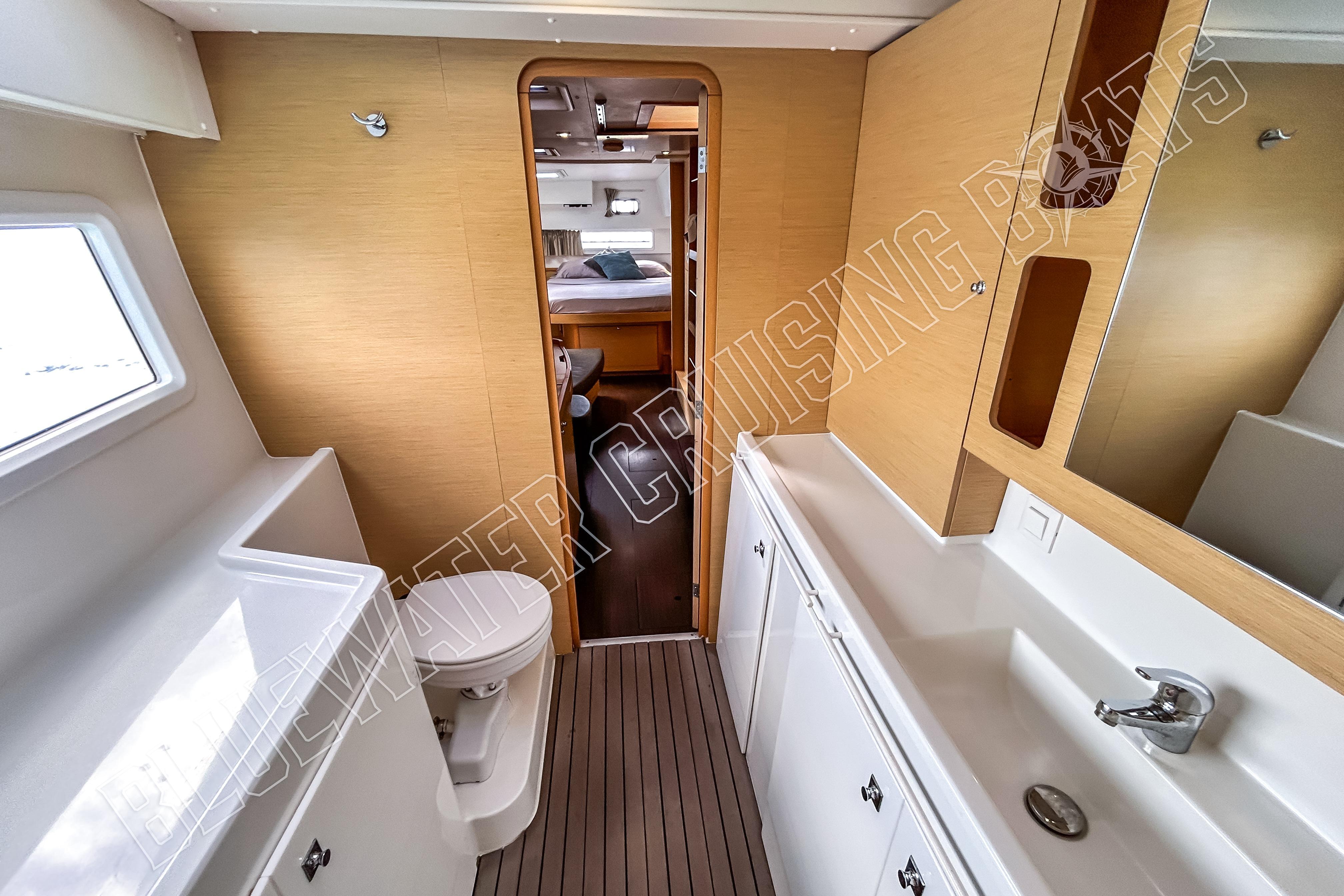 Adjacent to the forward guest stateroom in the portside hull, the forward guest head aboard MAXIM is designed with practicality in mind, featuring a wet head layout where the shower and toilet share the same space. This compact yet functional bathroom includes a contemporary vanity with sink, an electric flush toilet, and modern fixtures, all enhanced by natural light and ventilation. Thoughtful storage and clean finishes create a comfortable environment, making it easy for guests to freshen up and enjoy their time aboard. The wet head provides convenient access and privacy for those staying in the forward cabin, ensuring a pleasant cruising experience.