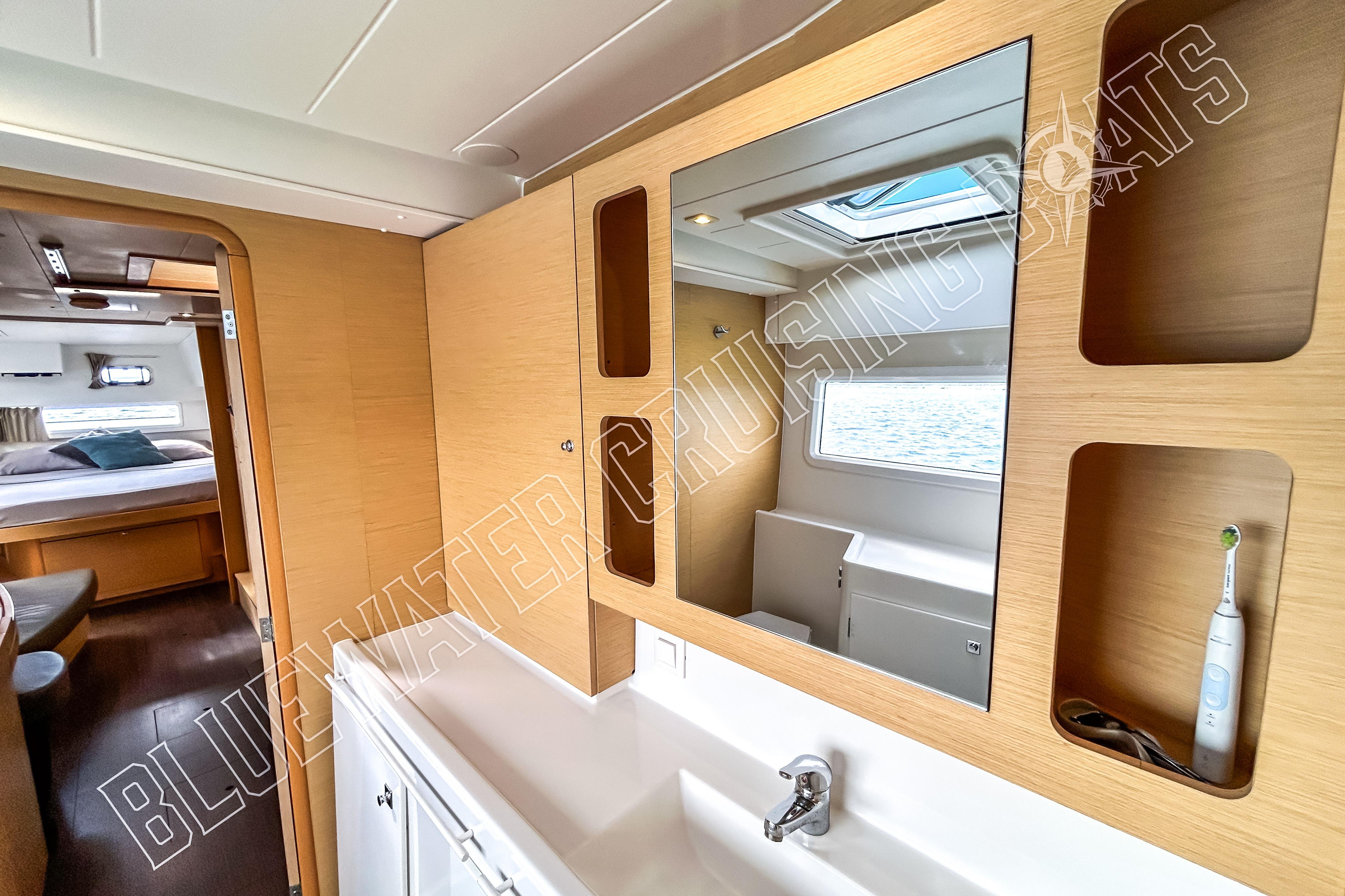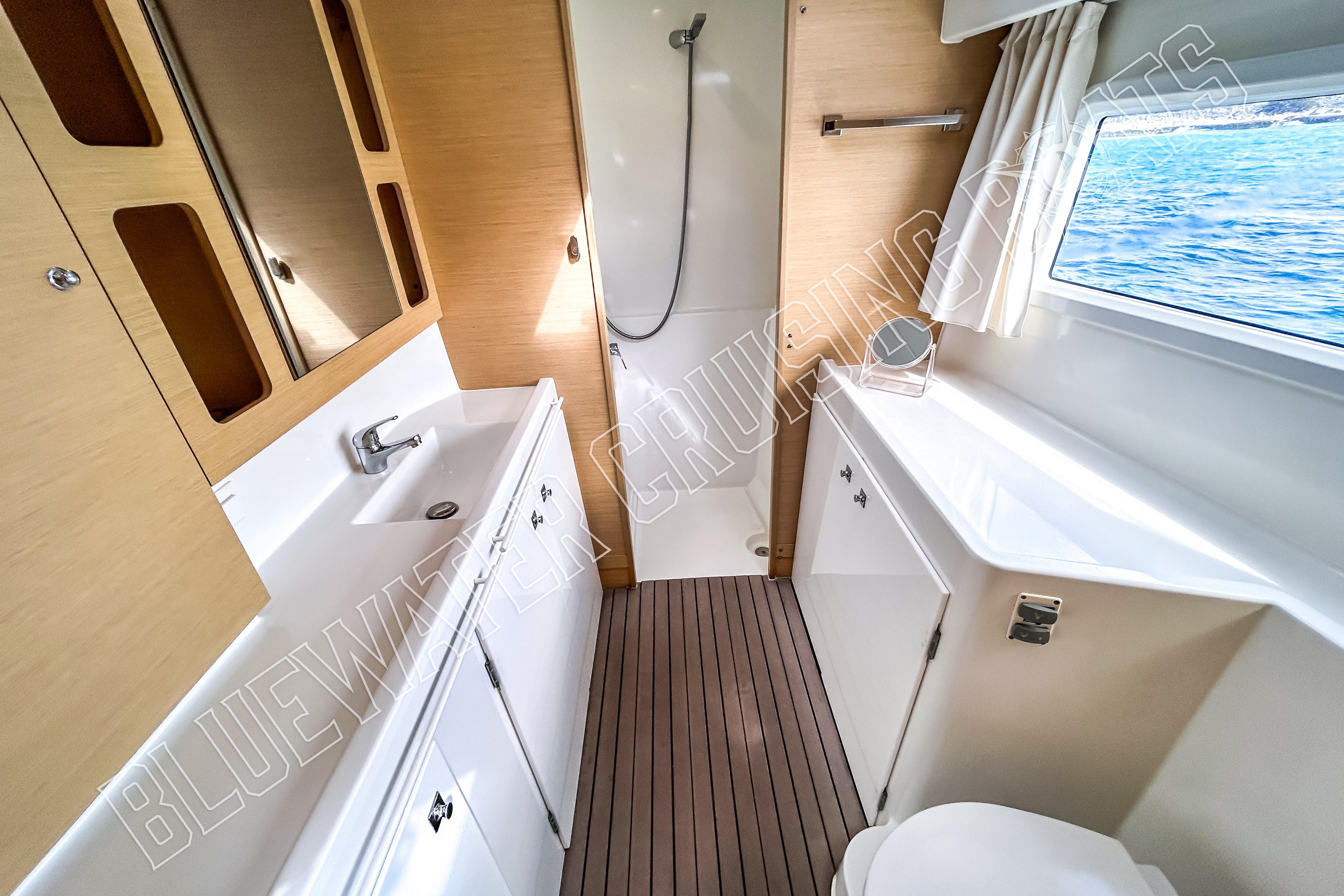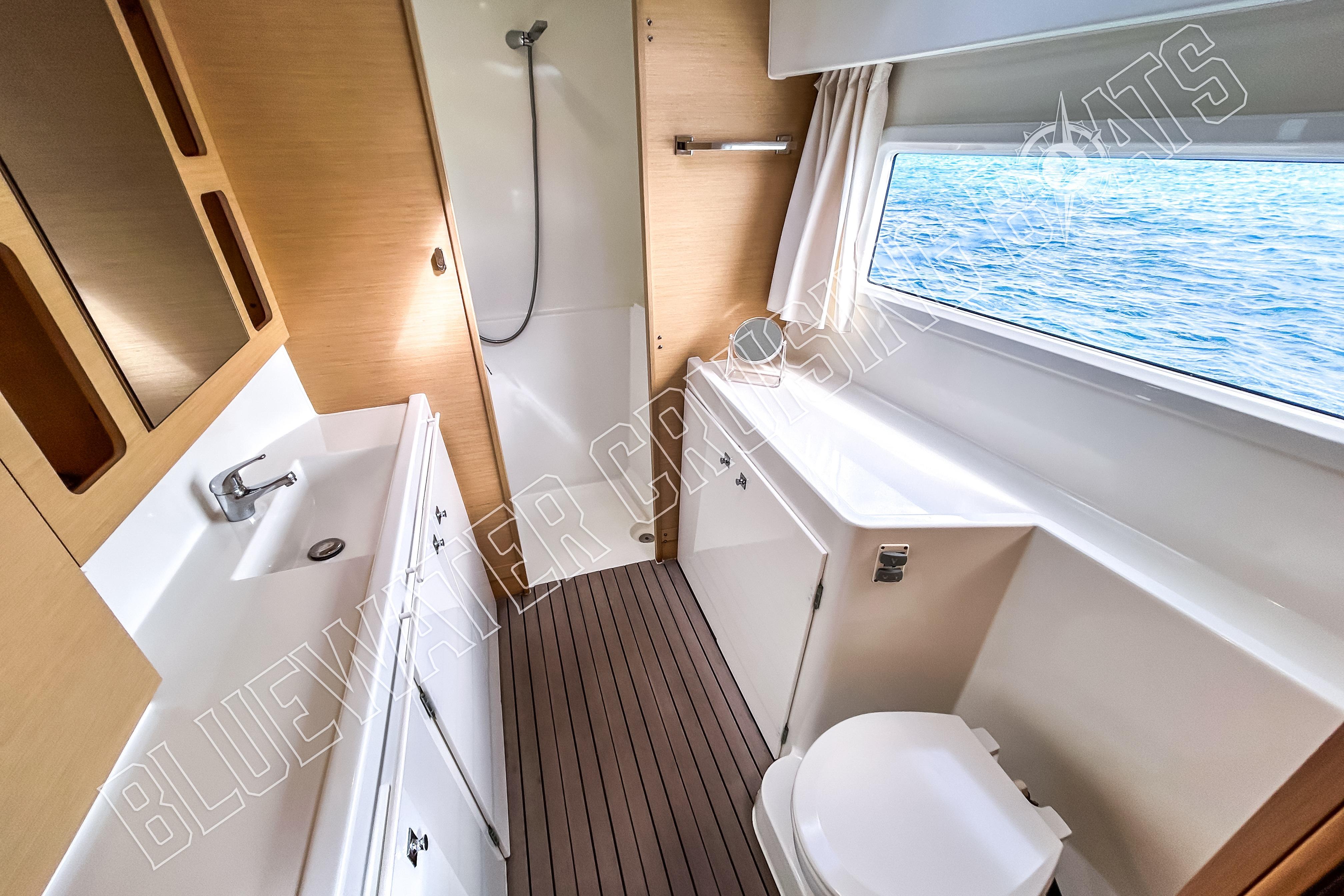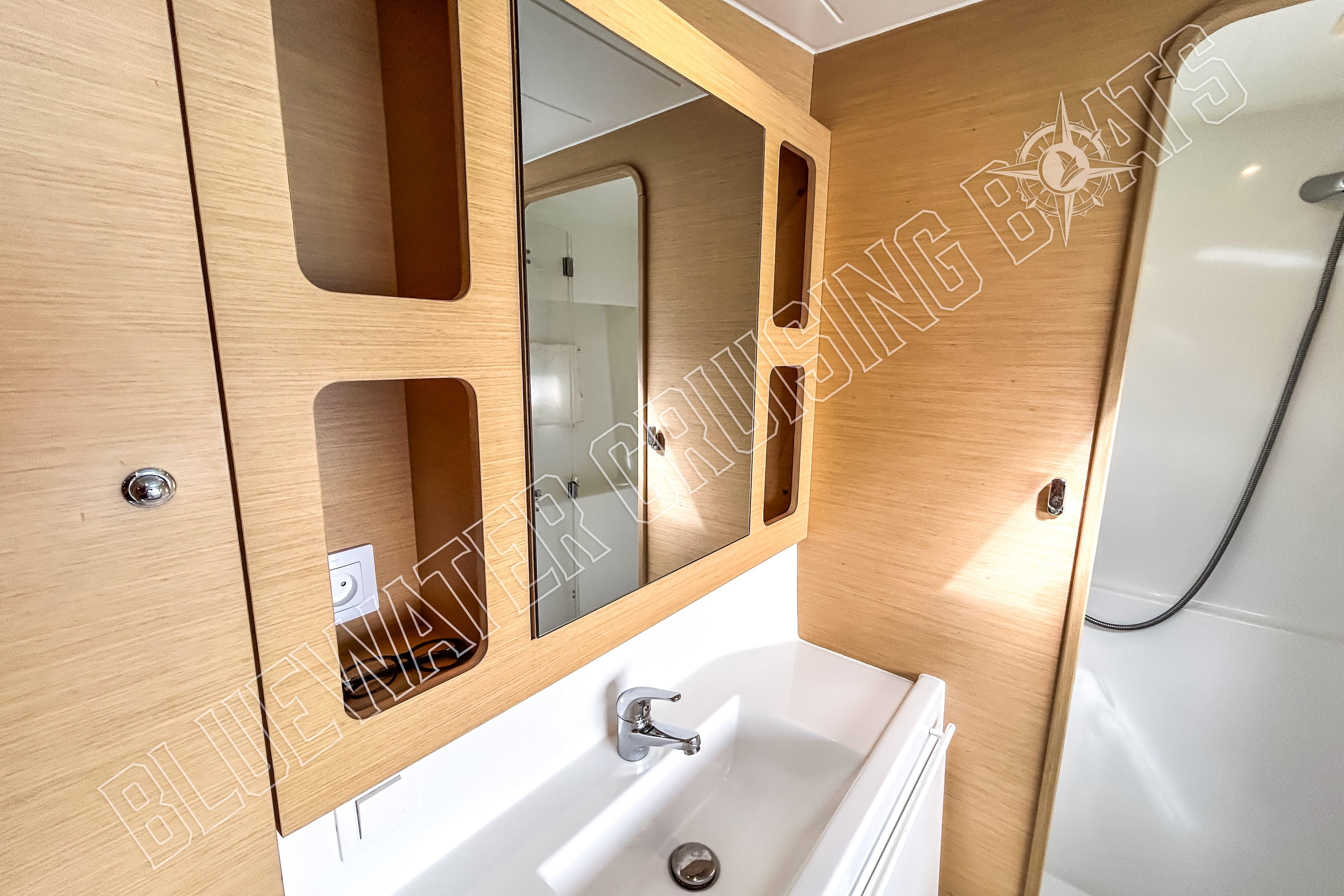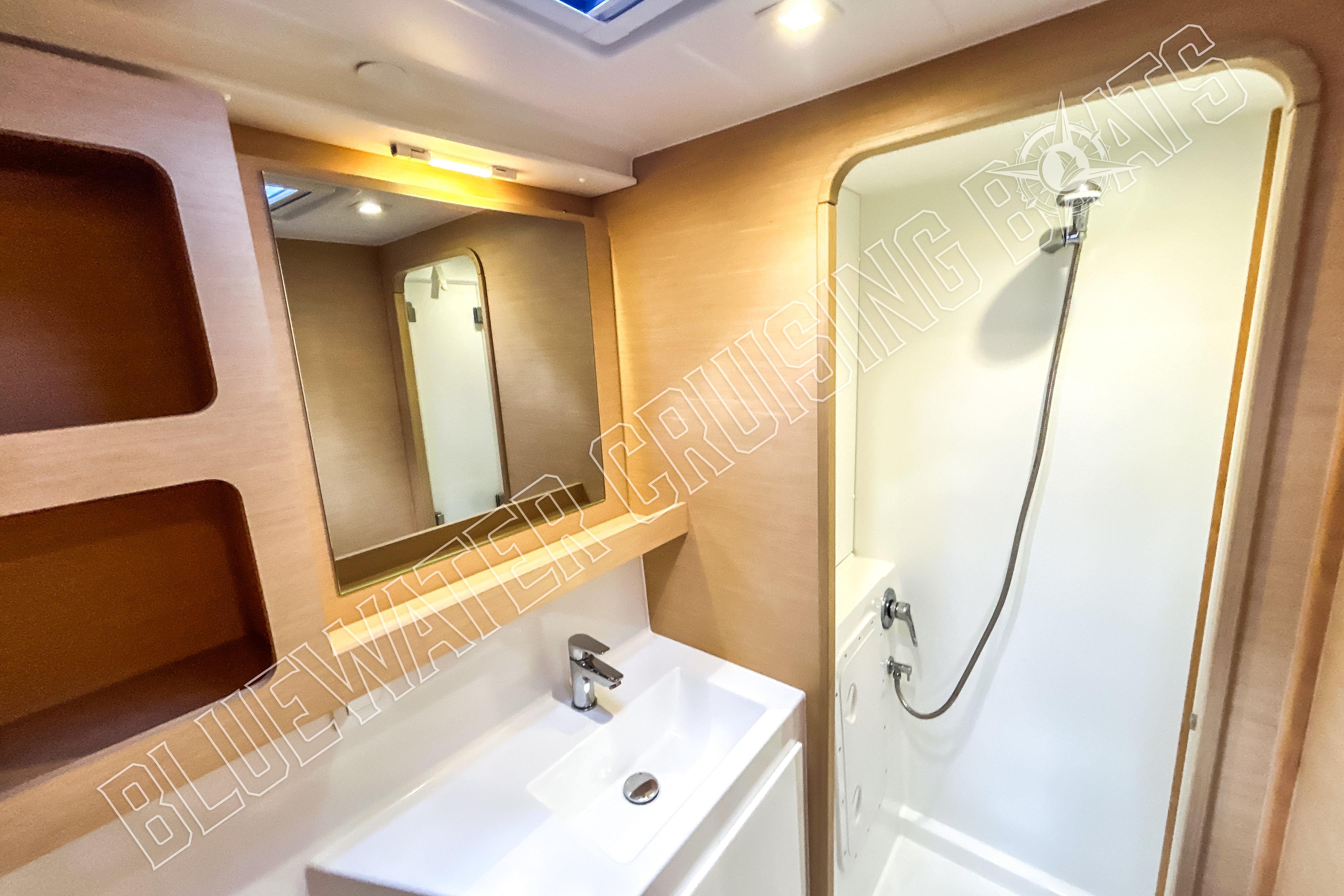 Adjacent to the aft guest stateroom in the portside hull, the guest head aboard MAXIM is thoughtfully designed for convenience and comfort. This private bathroom features a modern electric flush toilet, a separate walk-in shower with glass partition, and a stylish vanity with sink and storage. A large mirror and contemporary finishes provide a clean, airy feel, while ample ventilation and lighting ensure a pleasant experience. With easy access from the stateroom and practical amenities throughout, this guest head offers all the comforts of home, making life on board relaxed and enjoyable for guests.