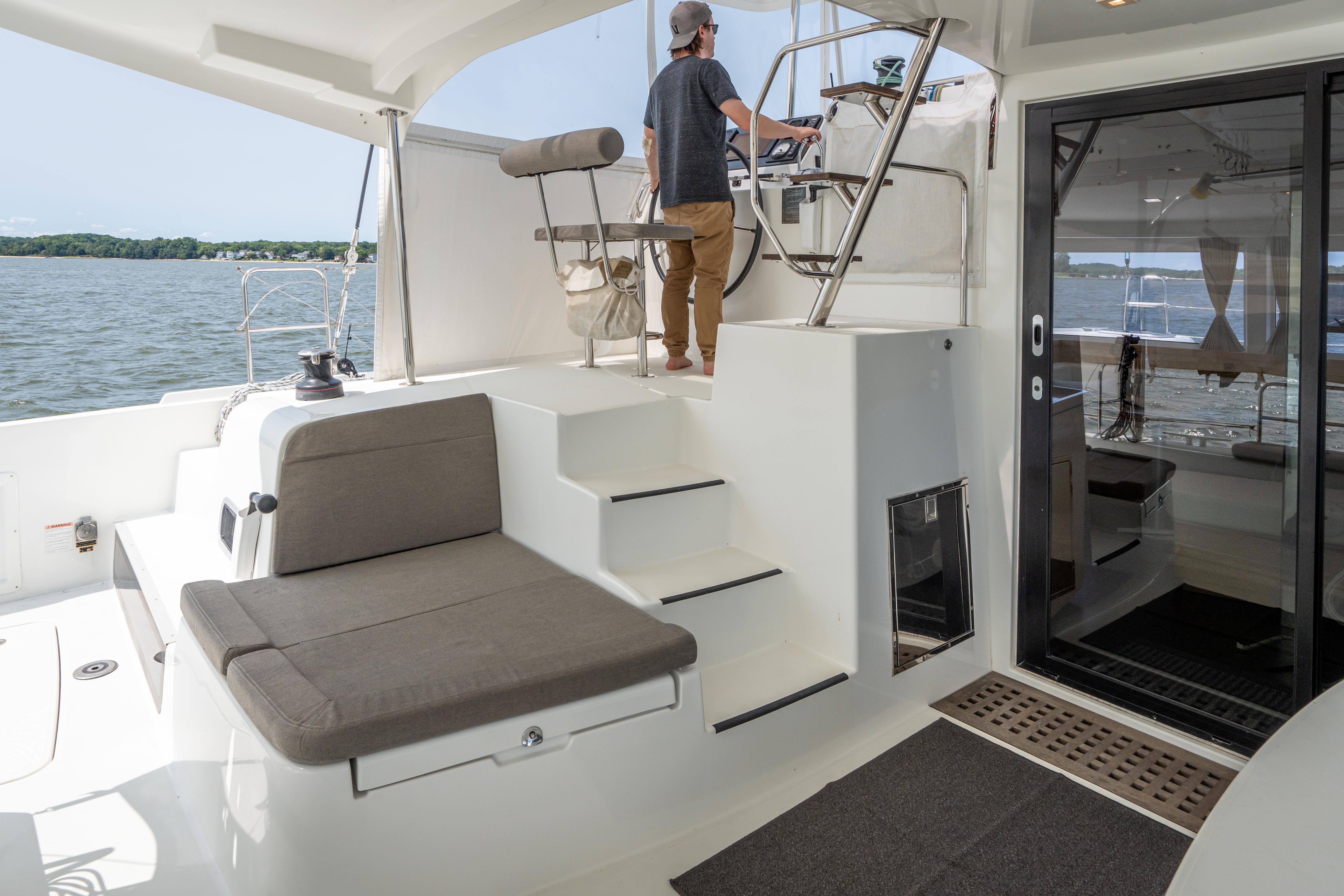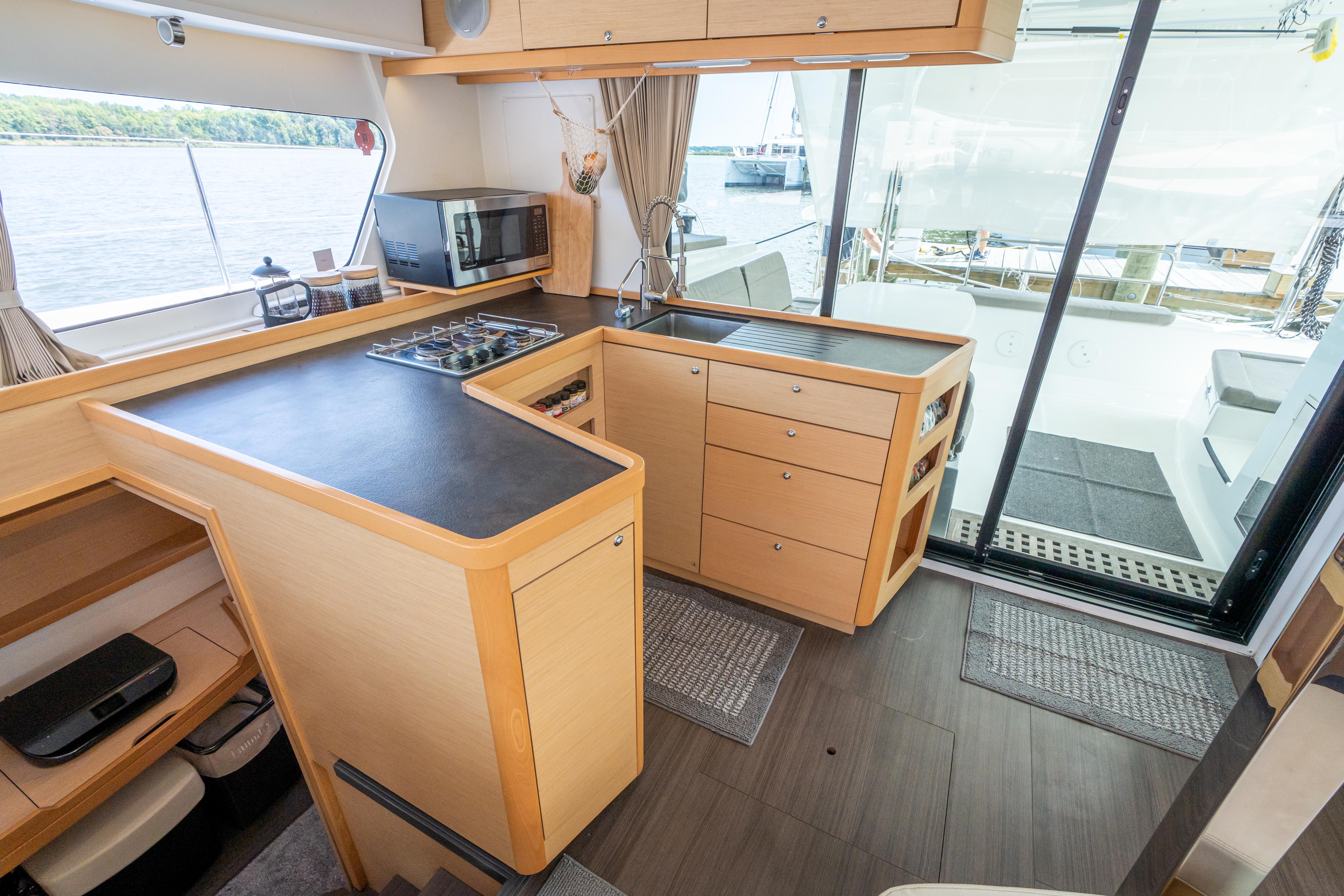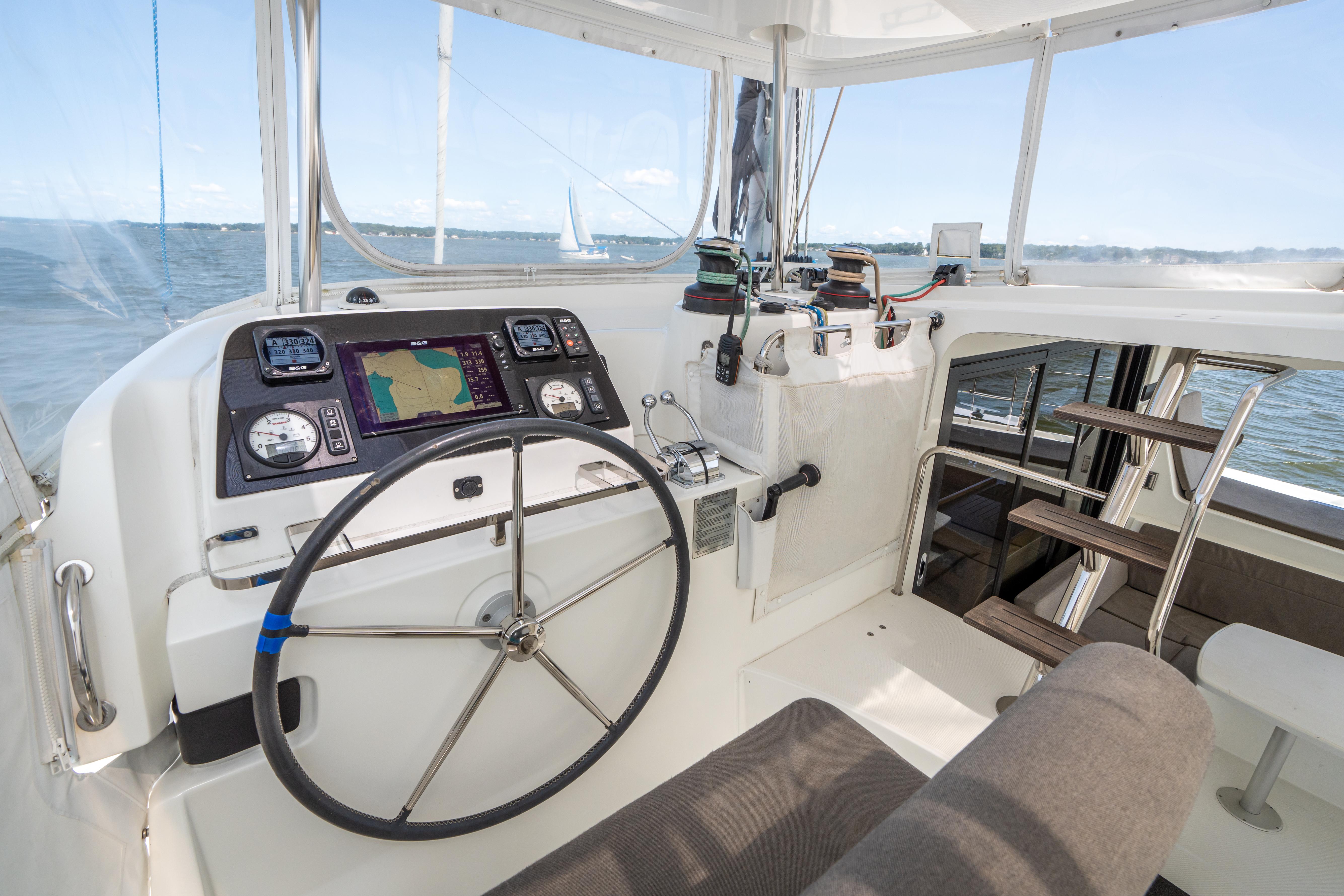 The helm is conveniently located at mid-height, offering good visibility while maneuvering and protection while sailing. You will always feel connected with the crew by being able to communicate easily with guests in the cockpit and galley.