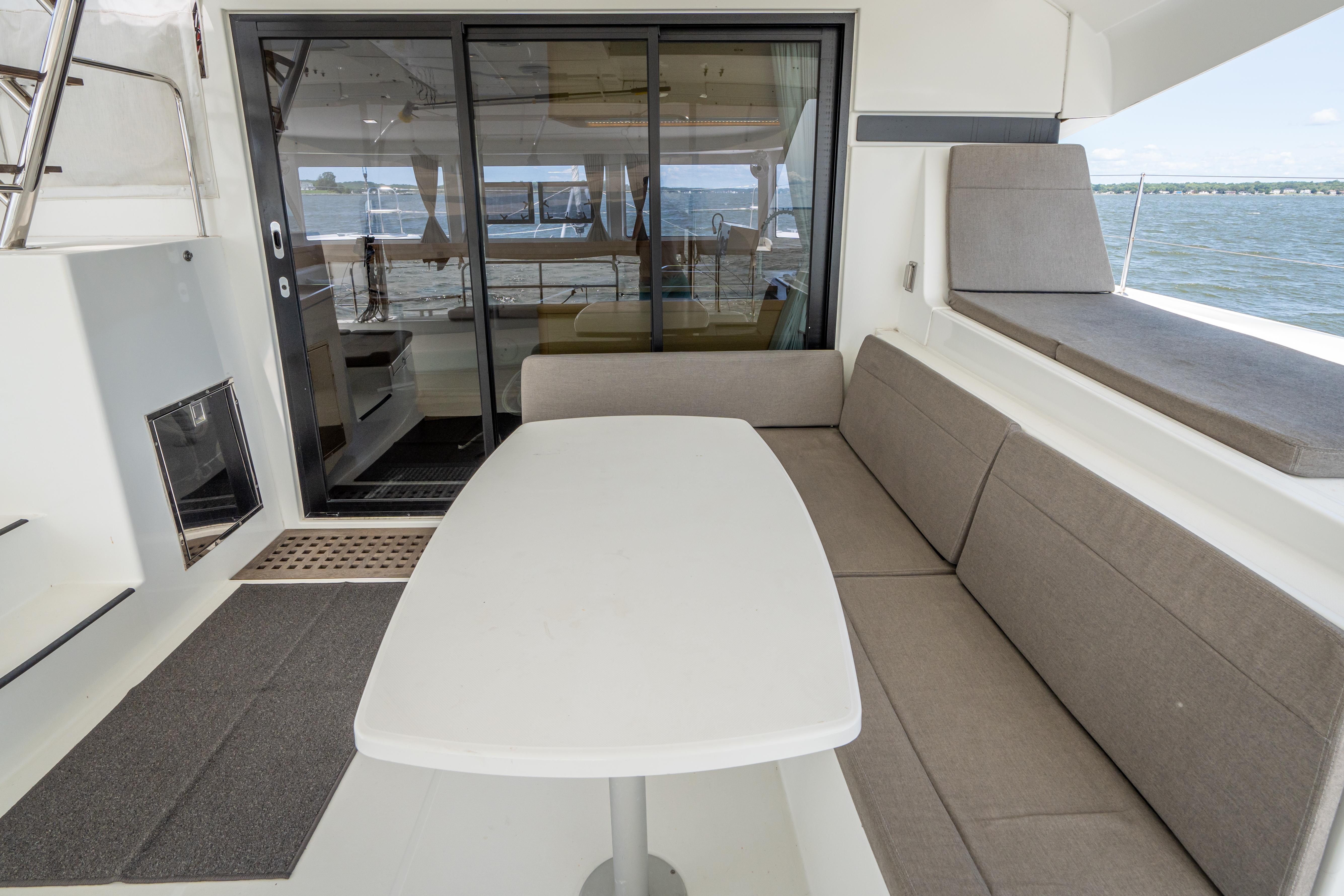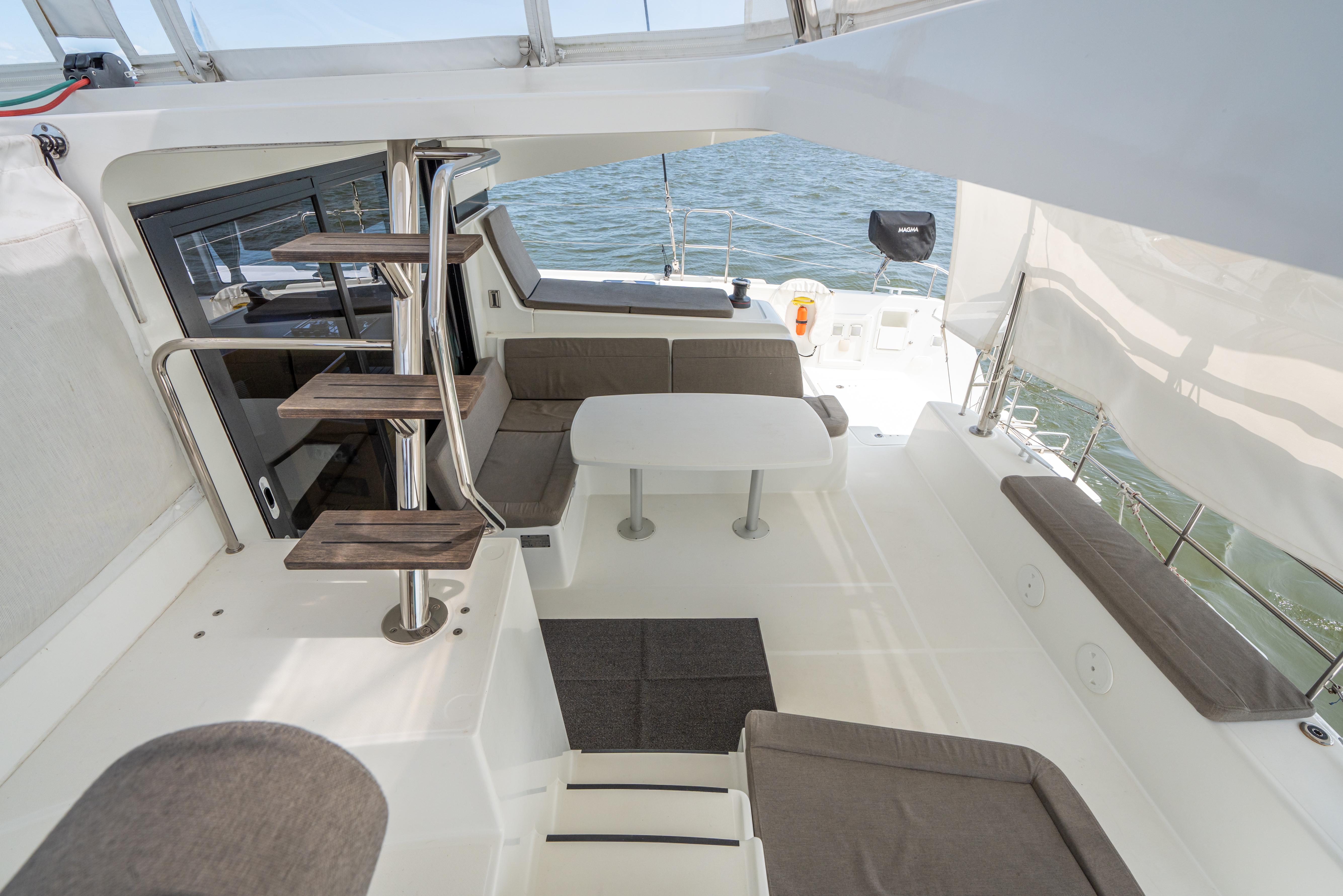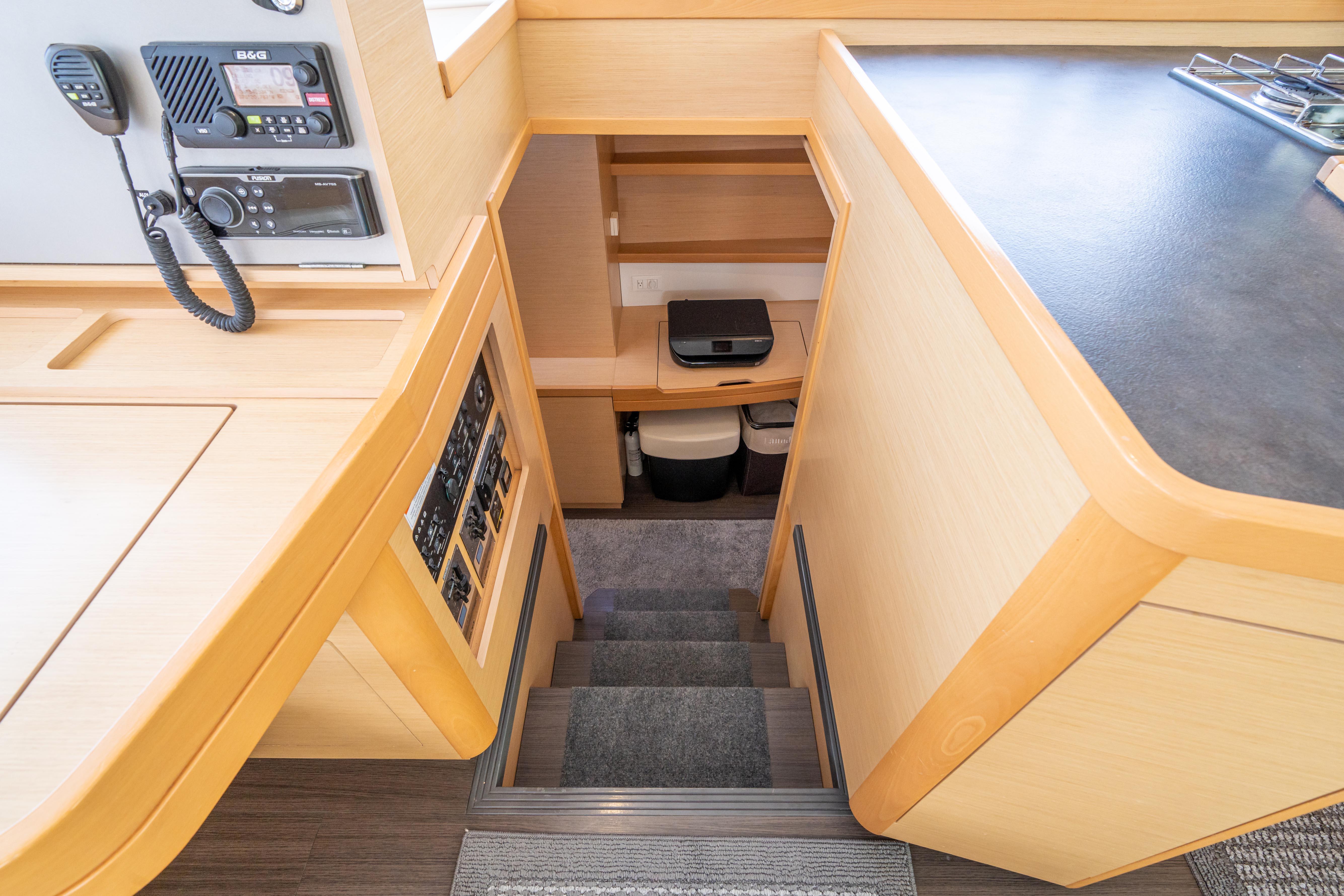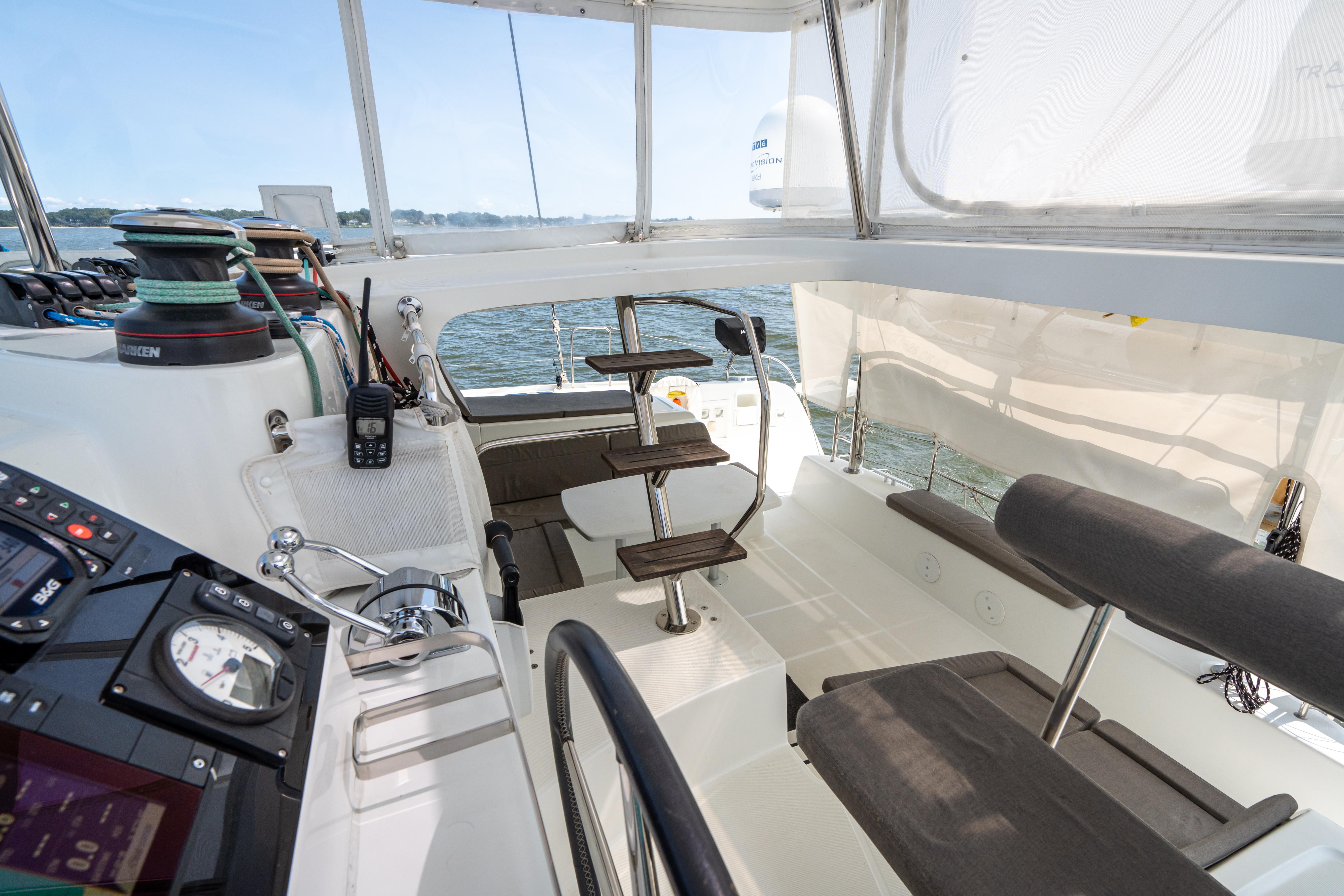 The helm is conveniently located at mid-height, offering good visibility while maneuvering and protection while sailing. You will always feel connected with the crew by being able to communicate easily with guests in the cockpit and galley.