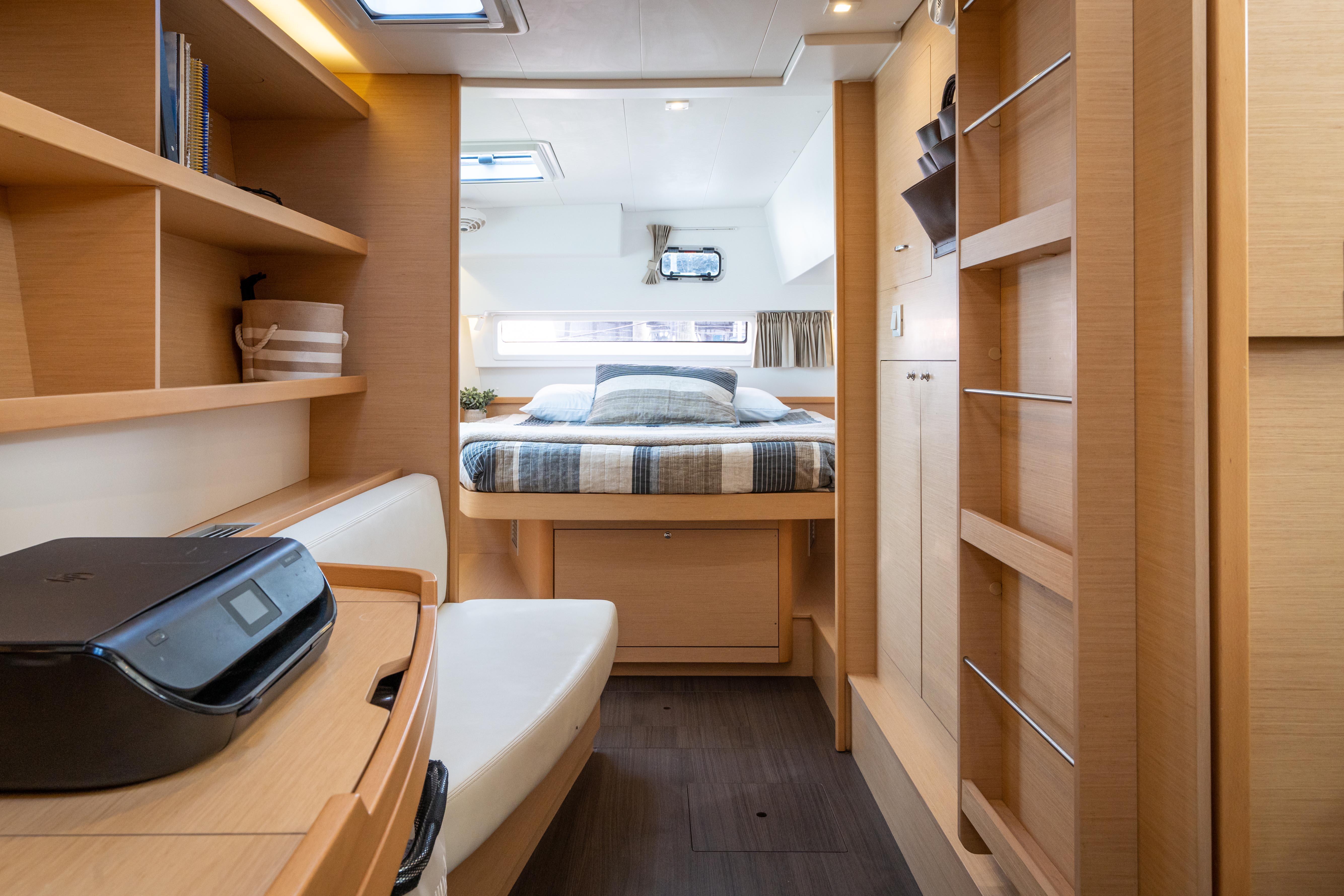 Starboard: owners cabin with the entire starboard hull dedicated to the private master stateroom. The head forward takes up nearly a third of the hull length, and has a huge shower with a nicely-appointed bathroom. Moving aft theres a desk, and an island bed which is low for easy access. Large hull windows mean the captain can do a quick visual of the surroundings from his or her berth.
