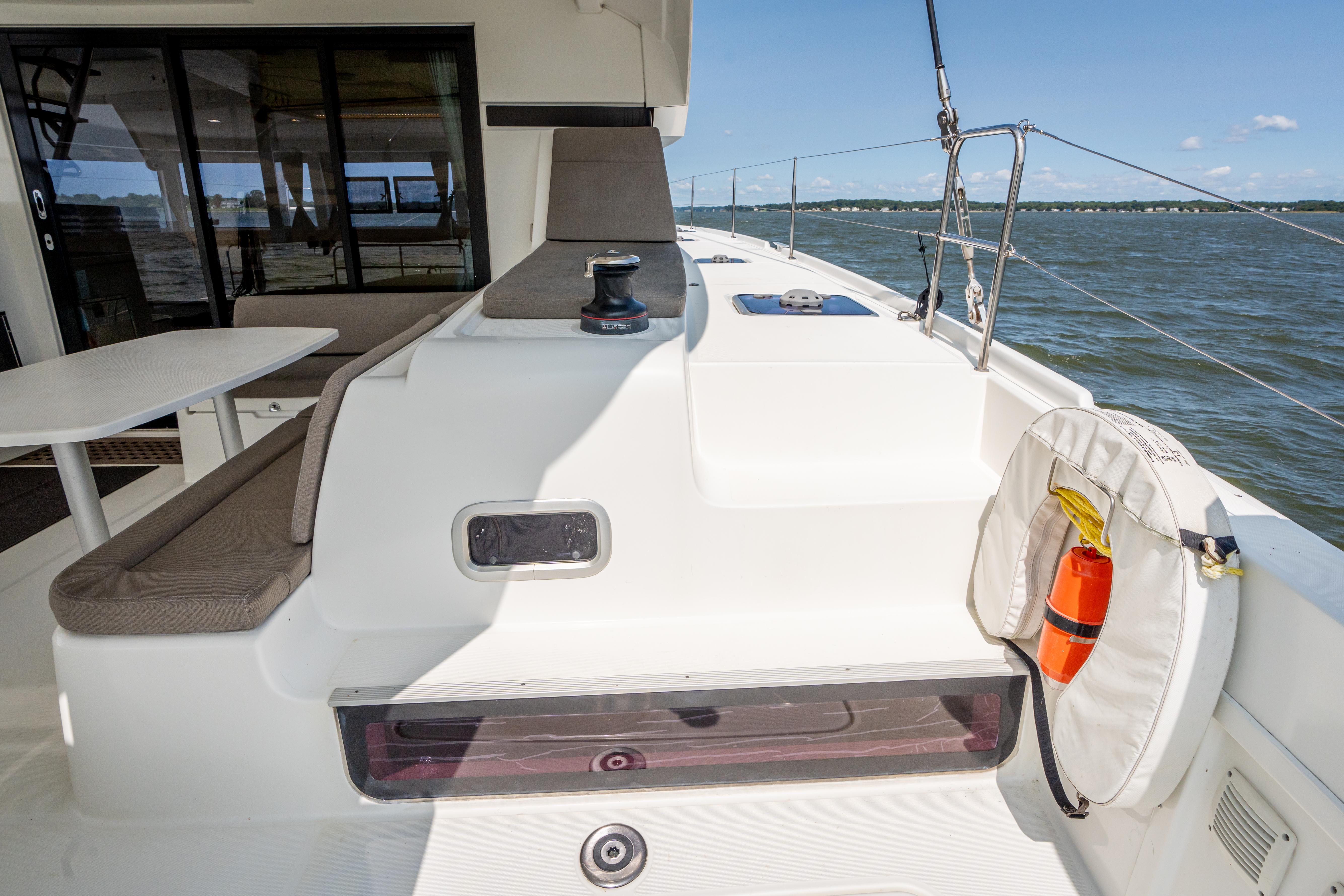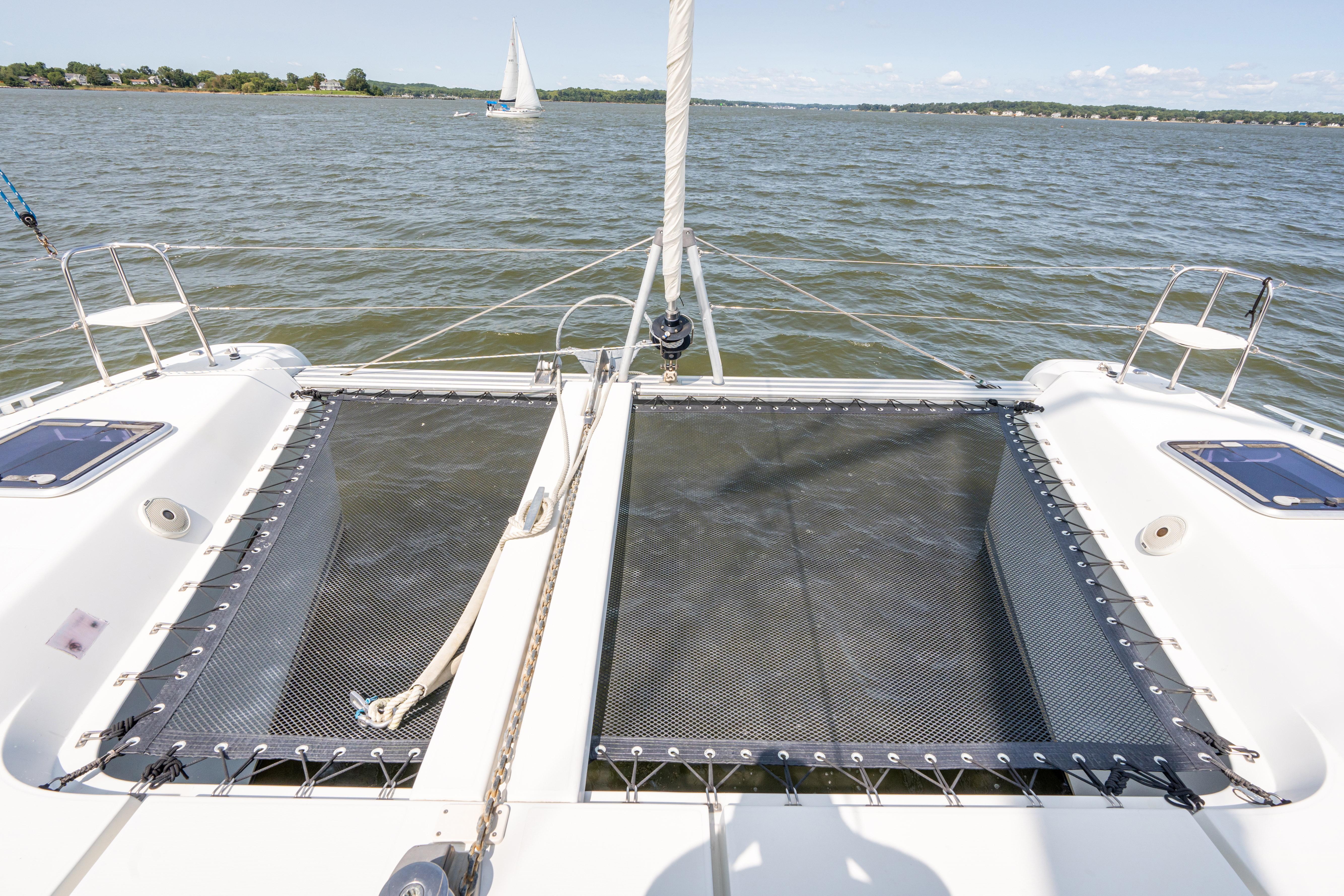 The port hull has two cabins and two heads. The aft stateroom has the same low island berth as the master, and a private head with a separate shower stall. The forward cabin has a smaller head/shower combination but also has access to a bow compartment that may be used to stash luggage or extra gear.