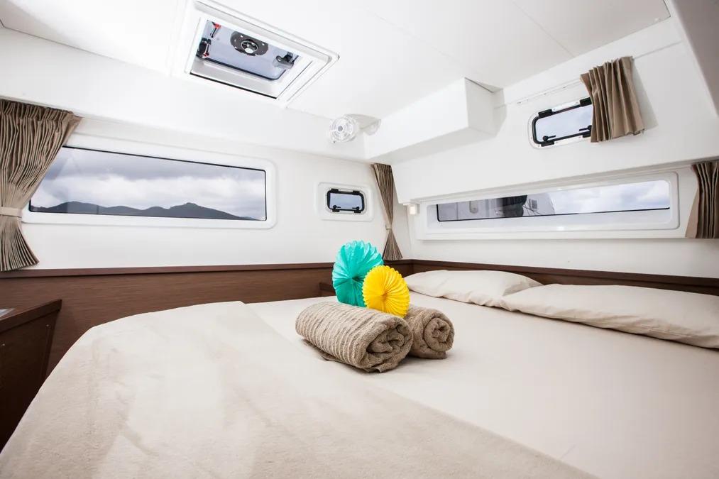 This Lagoon can accommodate up to 10 people in 1 single crew cabin, 4 guest double cabins and a saloon with 1 extra bed.