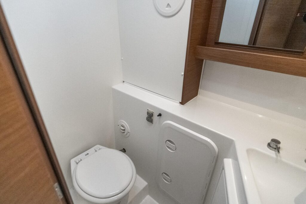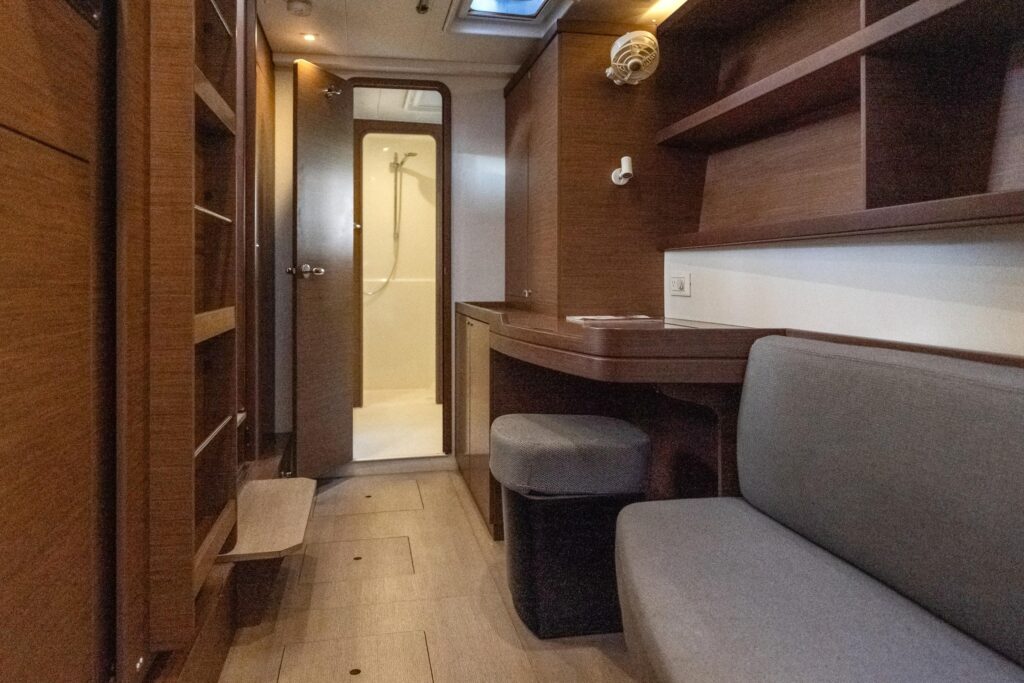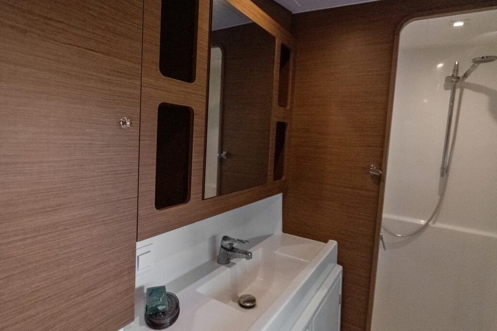 3 double cabins and what cabins! Island double beds for the aft cabins and beds with side access for the forward cabins, the aft cabins benefit from a bathroom with a separate shower, very large windows in the cabins offer excellent illumination and magnificent views of the surroundings, the vertical glazing in the coachroof provides saloon illumination: a well-lit, comfortable environment that is perfectly balanced between the galley and saloon areas, the U-shaped galley, fully fitted with broad work surfaces and extensive storage space, is oriented towards the external cockpit.