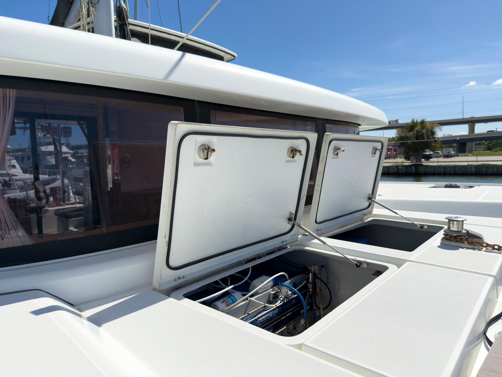 Deck & Hull: hard top Bimini, New Trampoline, Fish cleaning station, Propane BBQ grill, Transom shower-hot/cold, Swim ladder, Custom textilene sunshade for aft cockpit, Davits.