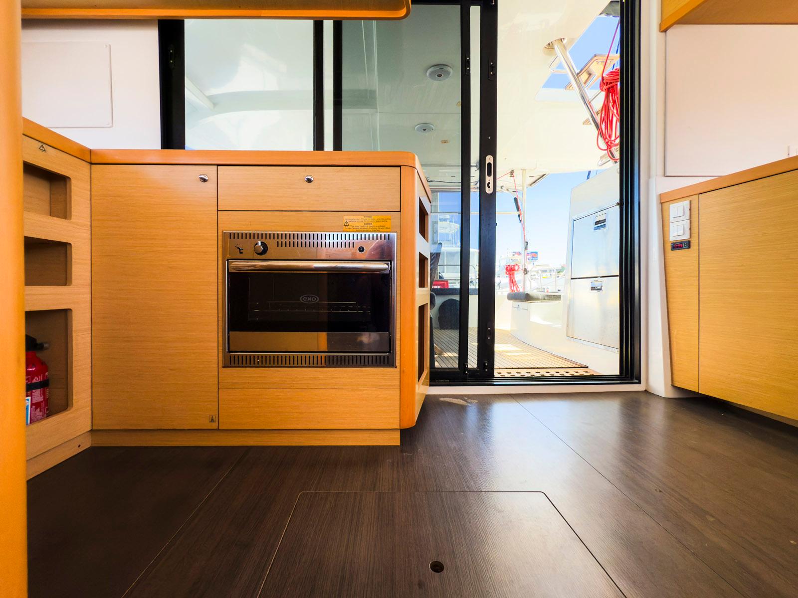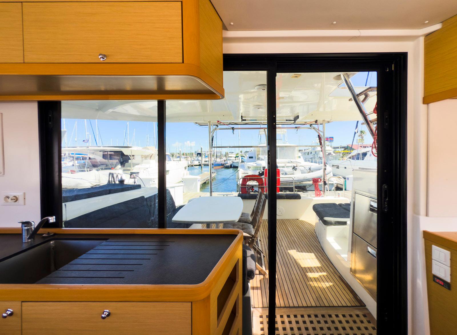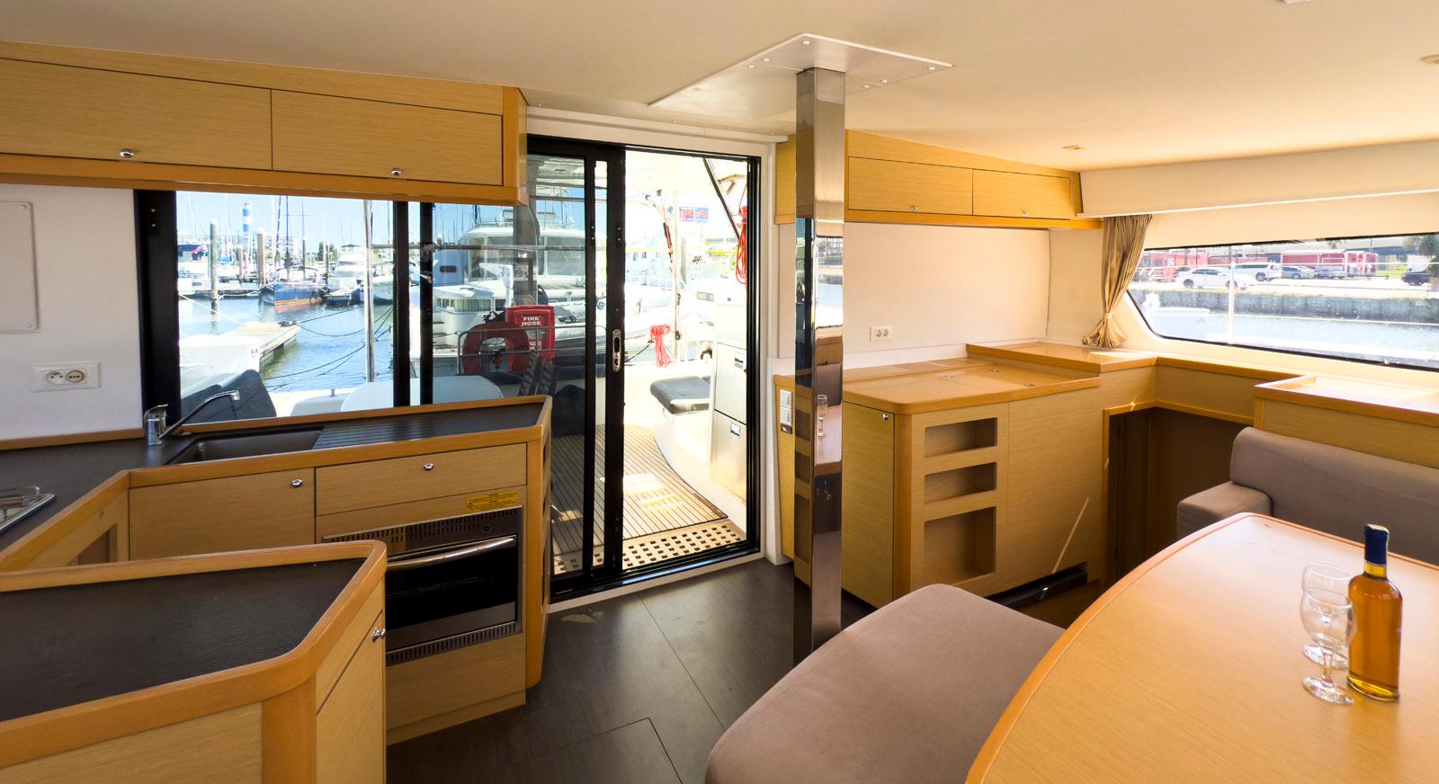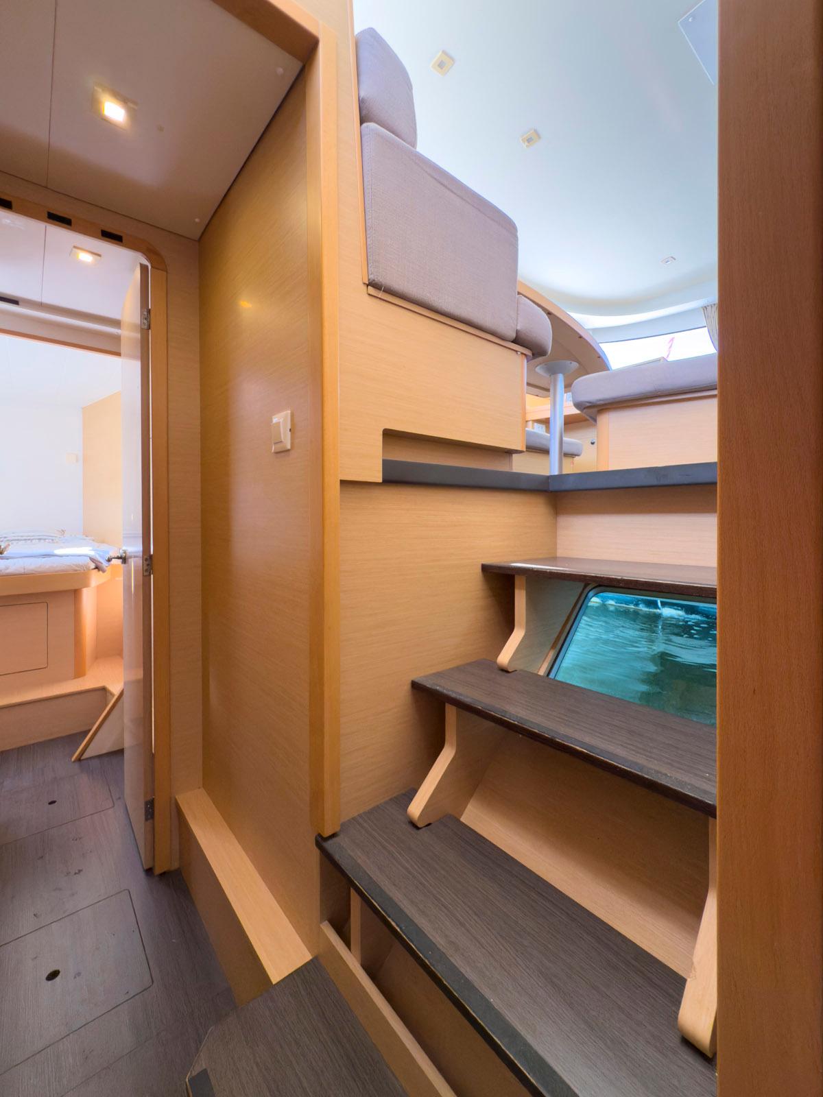A cozy cockpit, with smooth, elegant curves, a single level from the aft platform to the saloon: The suspended steps at the transom provide a whole new perception of the boat: a continuous, wide and inviting platform.