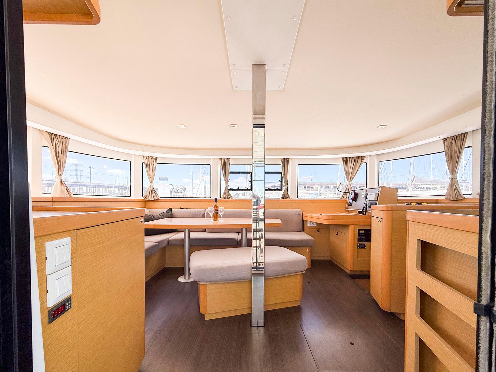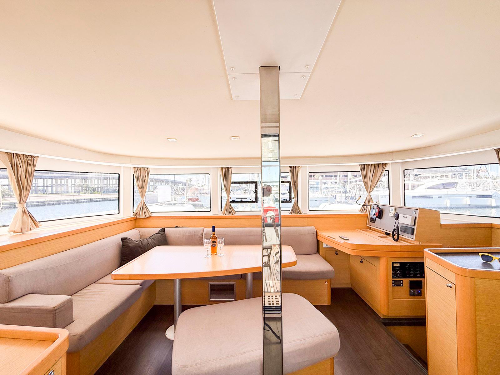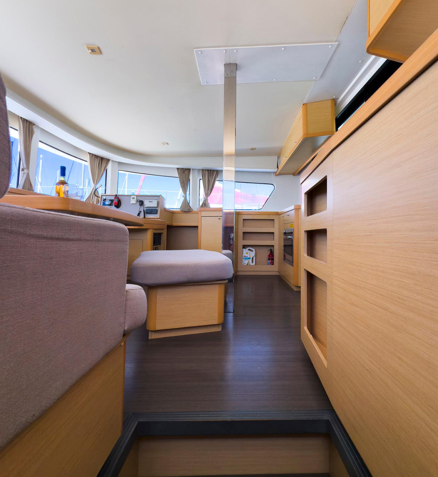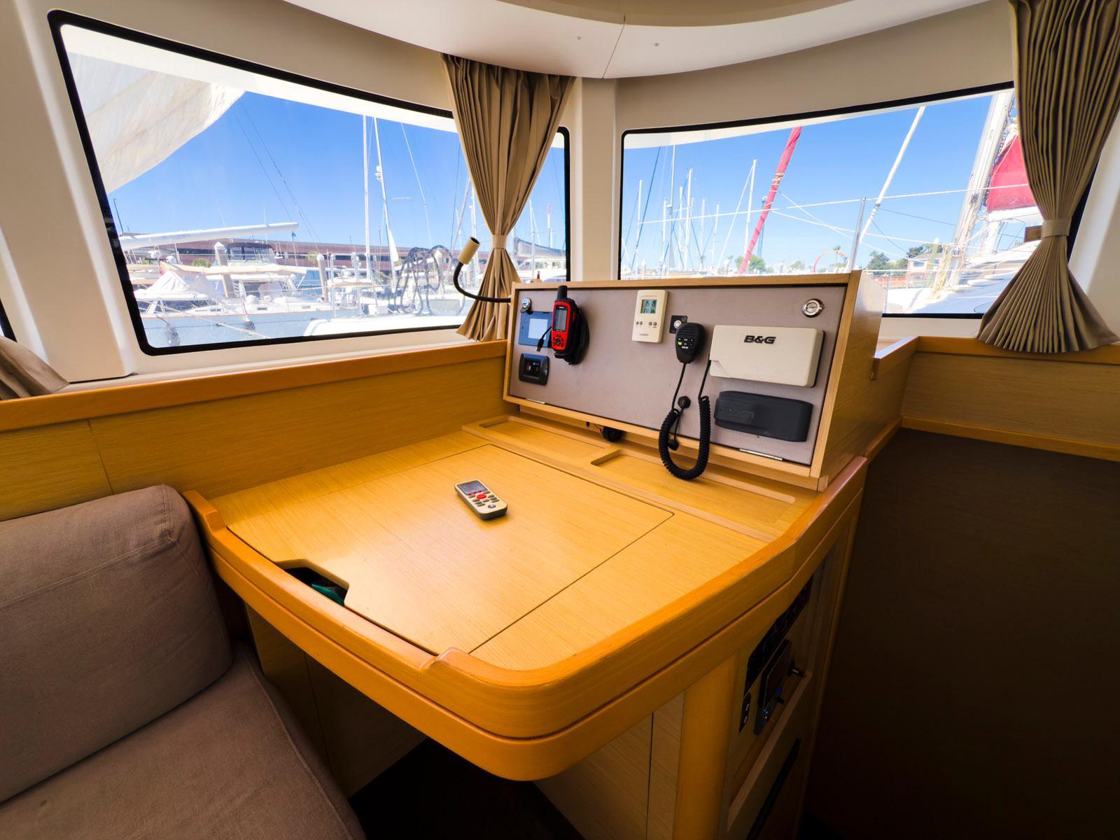 An ergonomic helming station at the coach roof bulkhead, offering direct communication between the cockpit and saloon, improved circulation, forward and aft of the helming station, direct access to the coach roof for easier access to the boom, a composite bimini with a sliding panel to ensure a good view of the sails, a closure panel for helming station safety when under way.