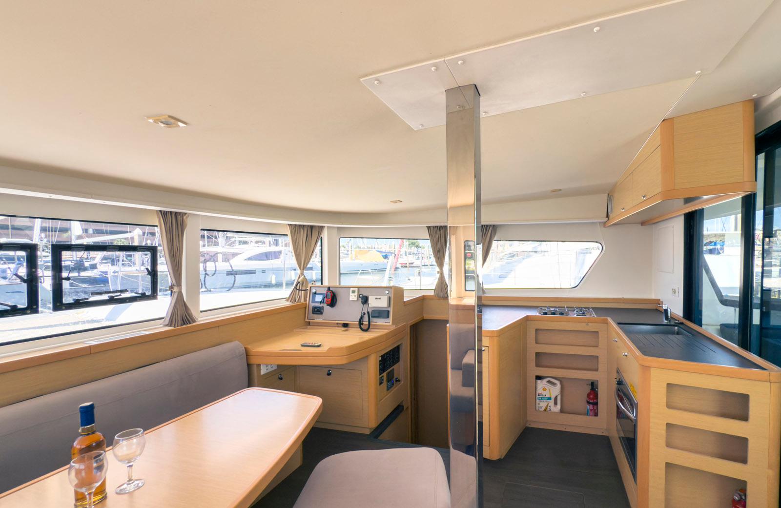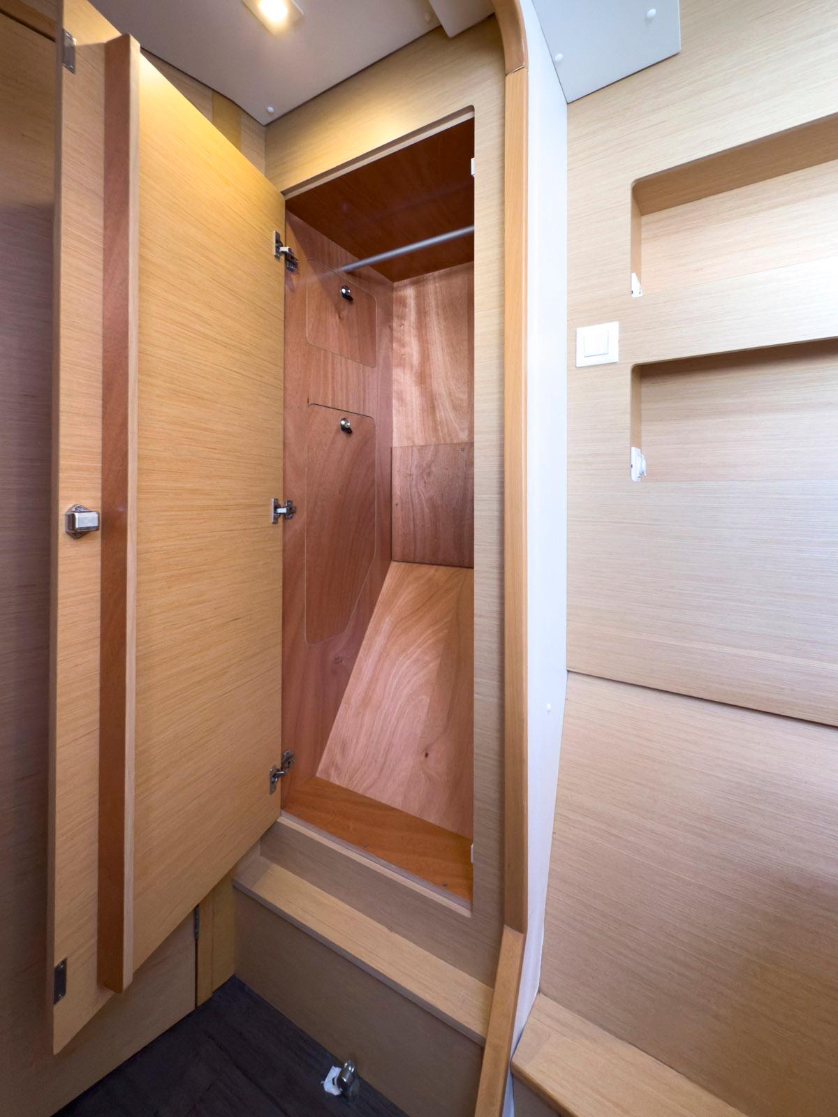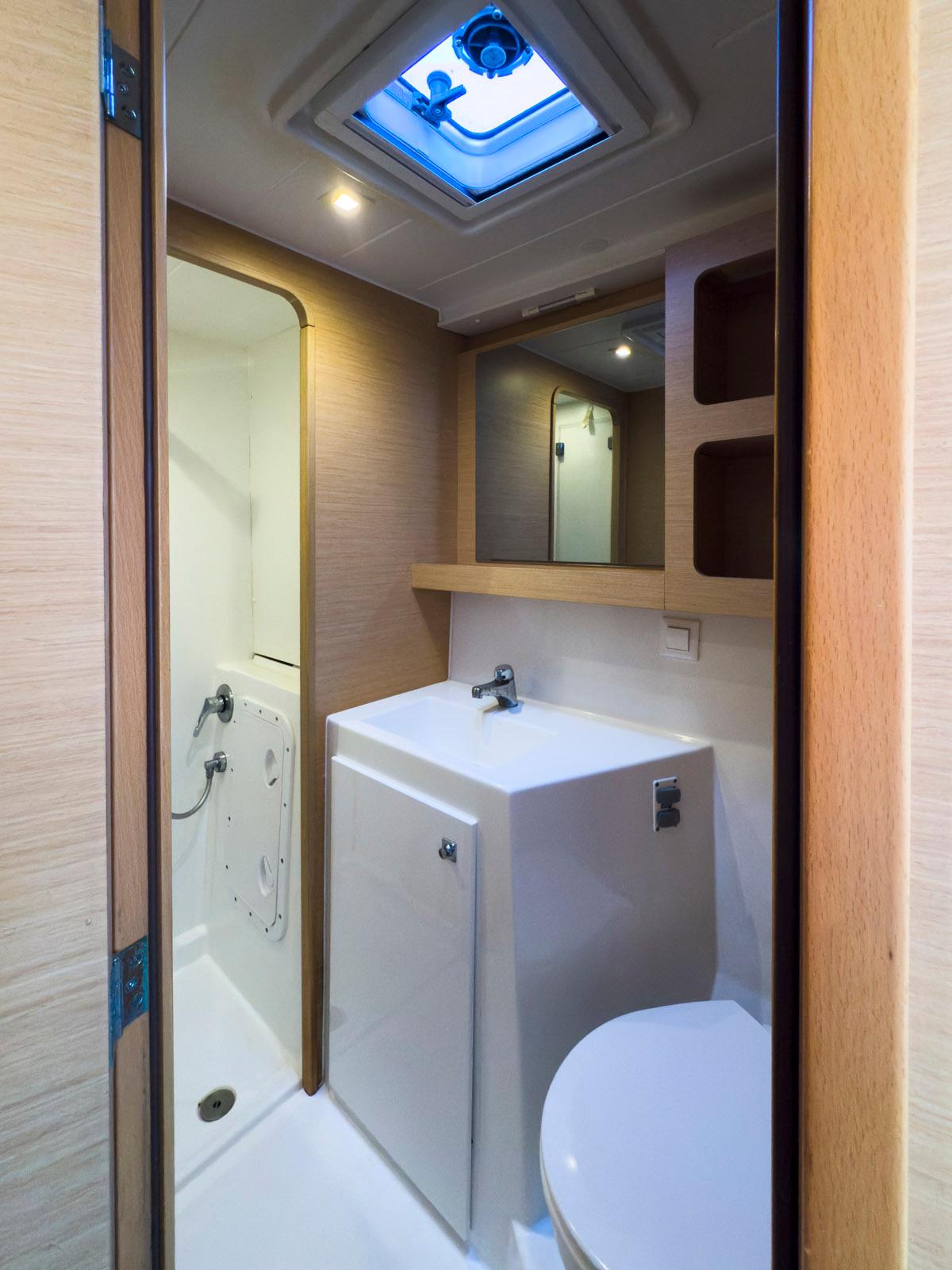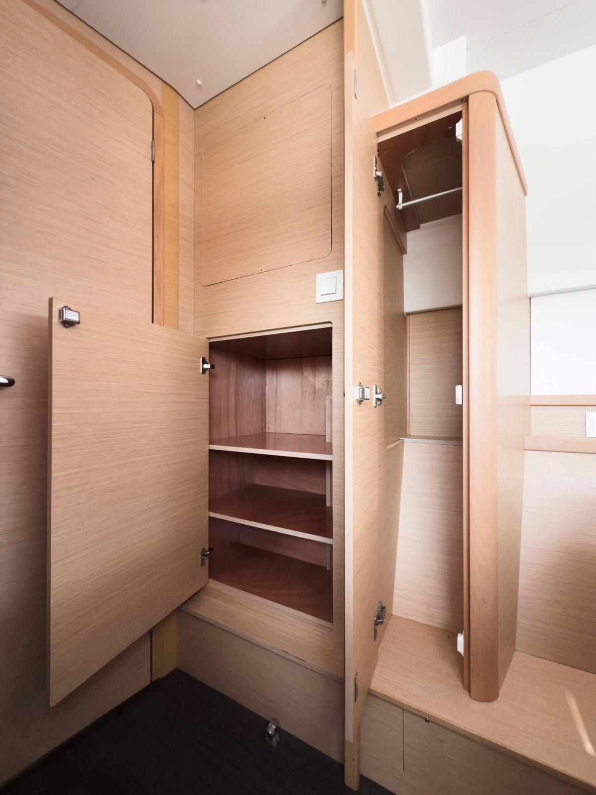An ergonomic helming station at the coach roof bulkhead, offering direct communication between the cockpit and saloon, improved circulation, forward and aft of the helming station, direct access to the coach roof for easier access to the boom, a composite bimini with a sliding panel to ensure a good view of the sails, a closure panel for helming station safety when under way.