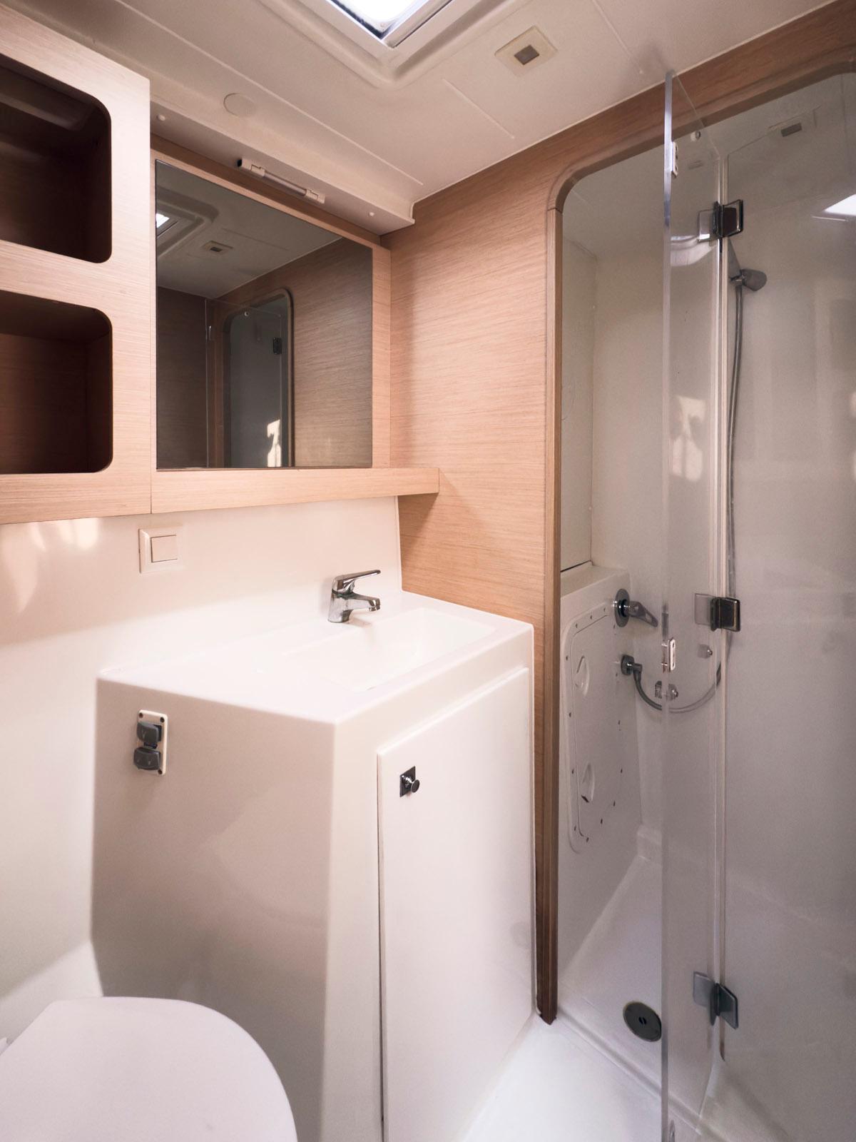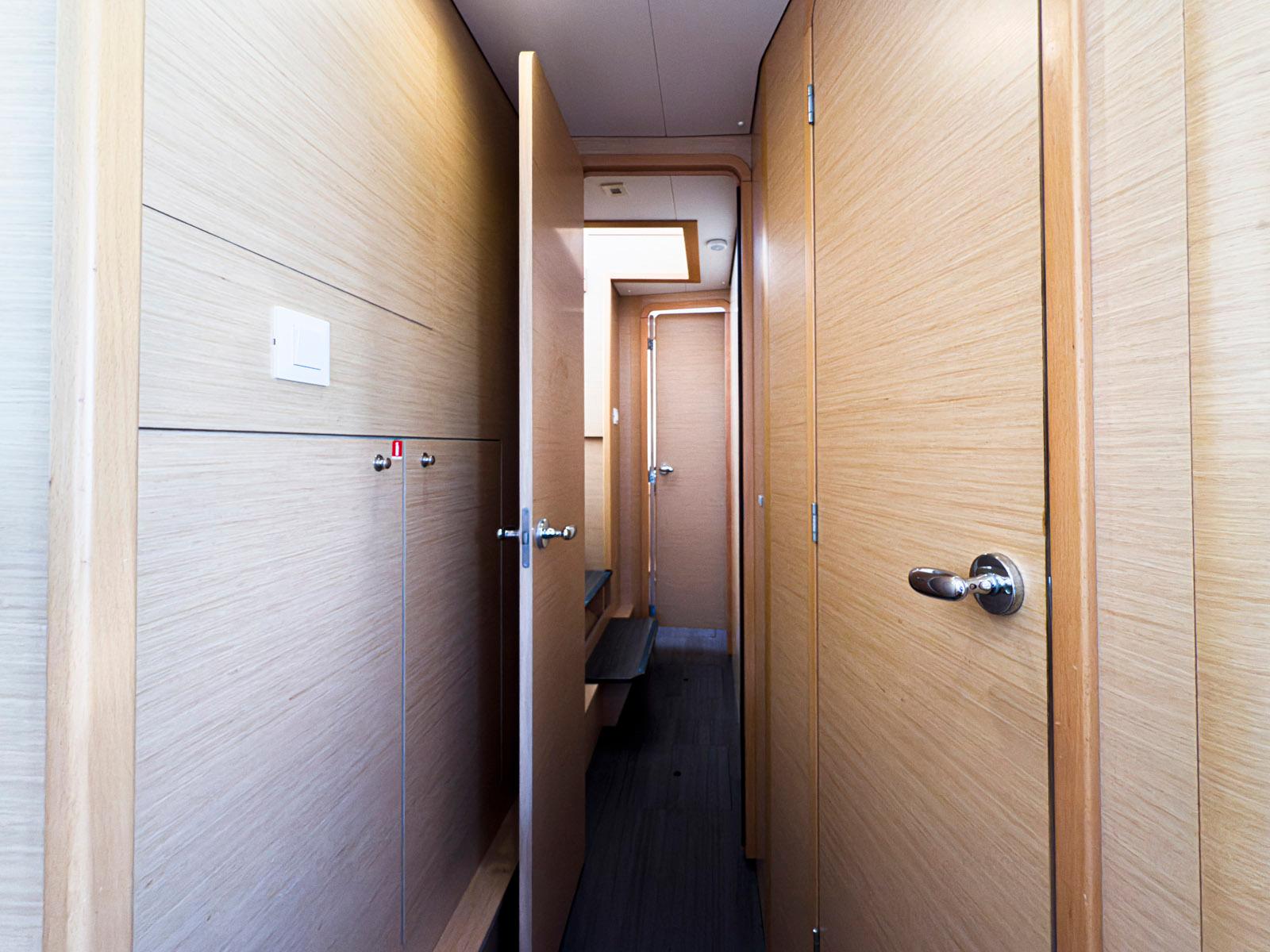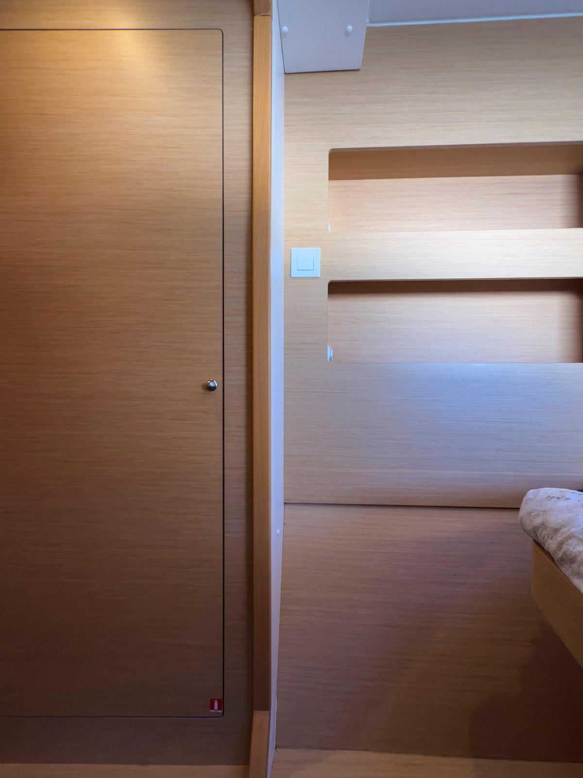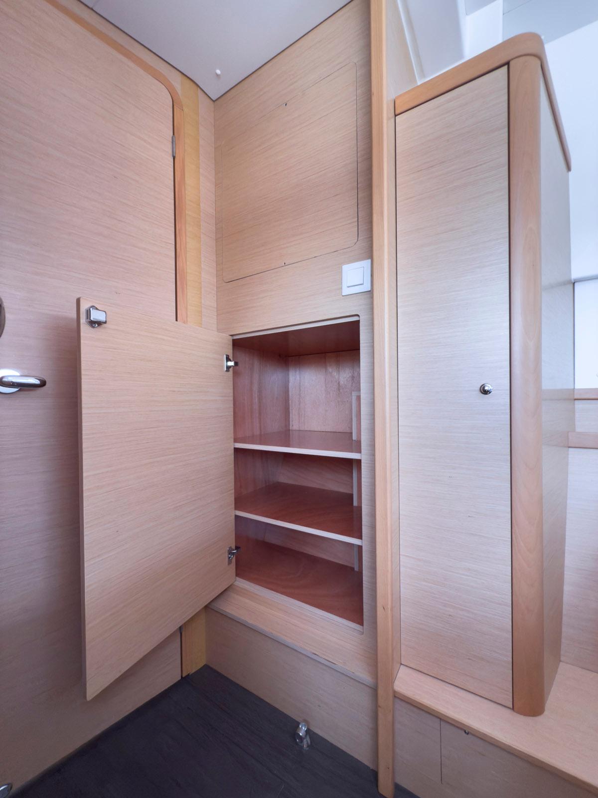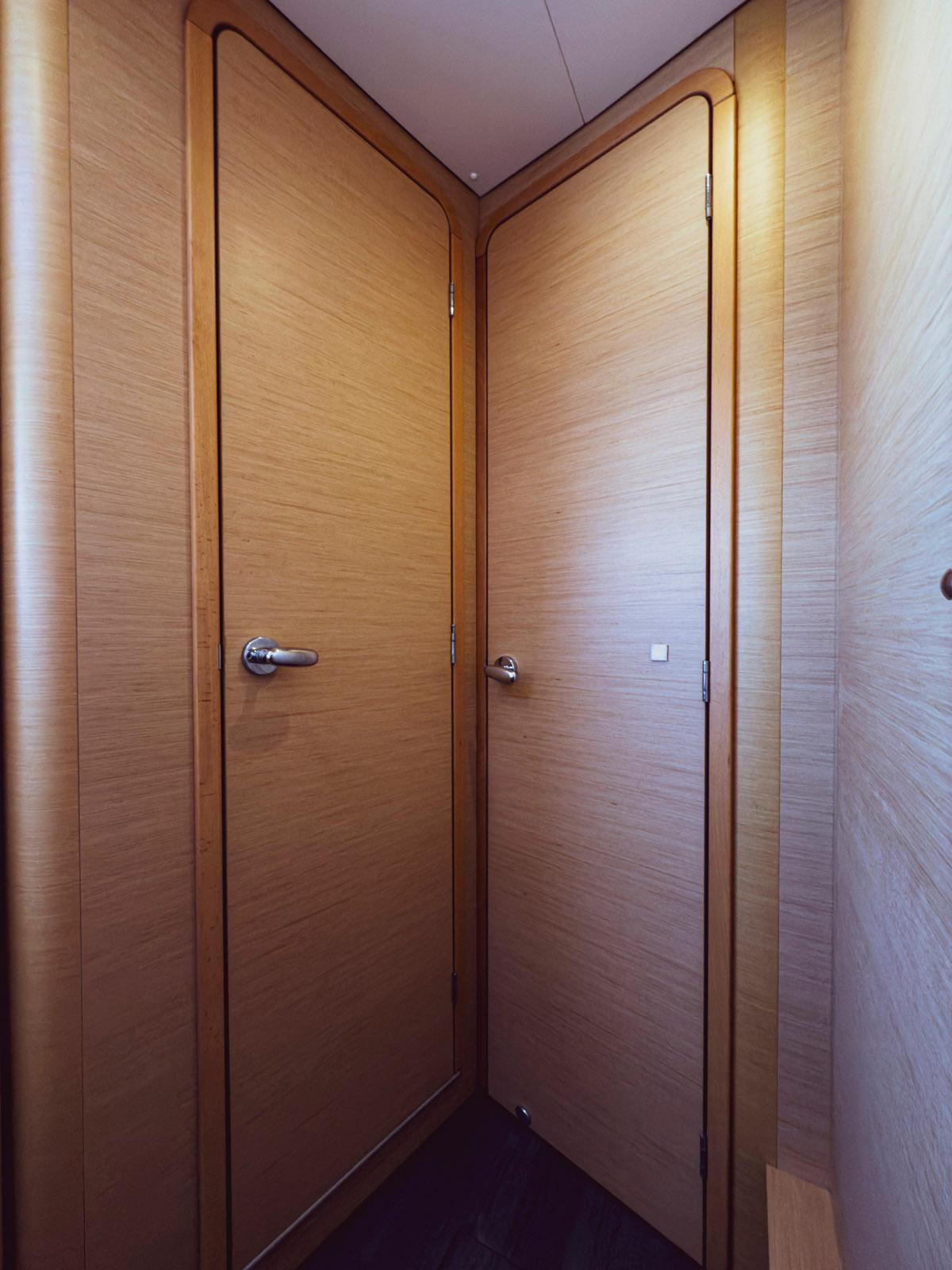 An ergonomic helming station at the coach roof bulkhead, offering direct communication between the cockpit and saloon, improved circulation, forward and aft of the helming station, direct access to the coach roof for easier access to the boom, a composite bimini with a sliding panel to ensure a good view of the sails, a closure panel for helming station safety when under way.