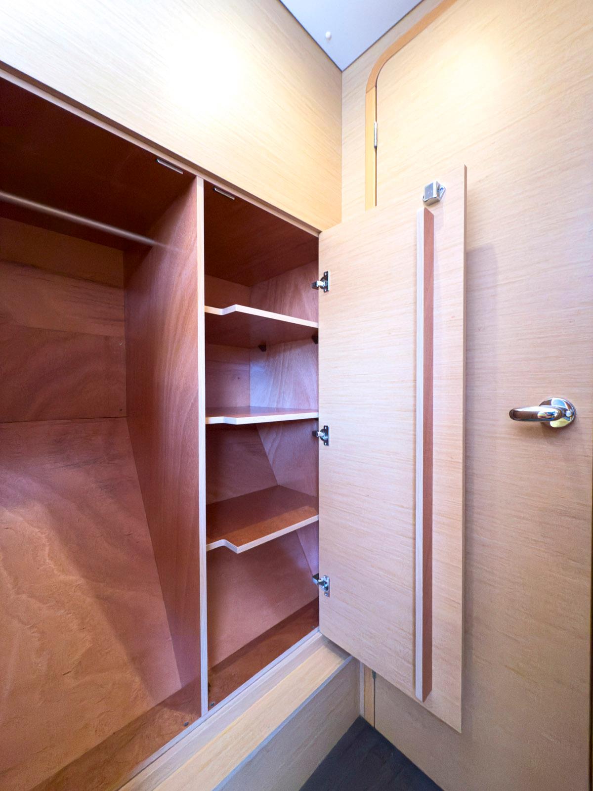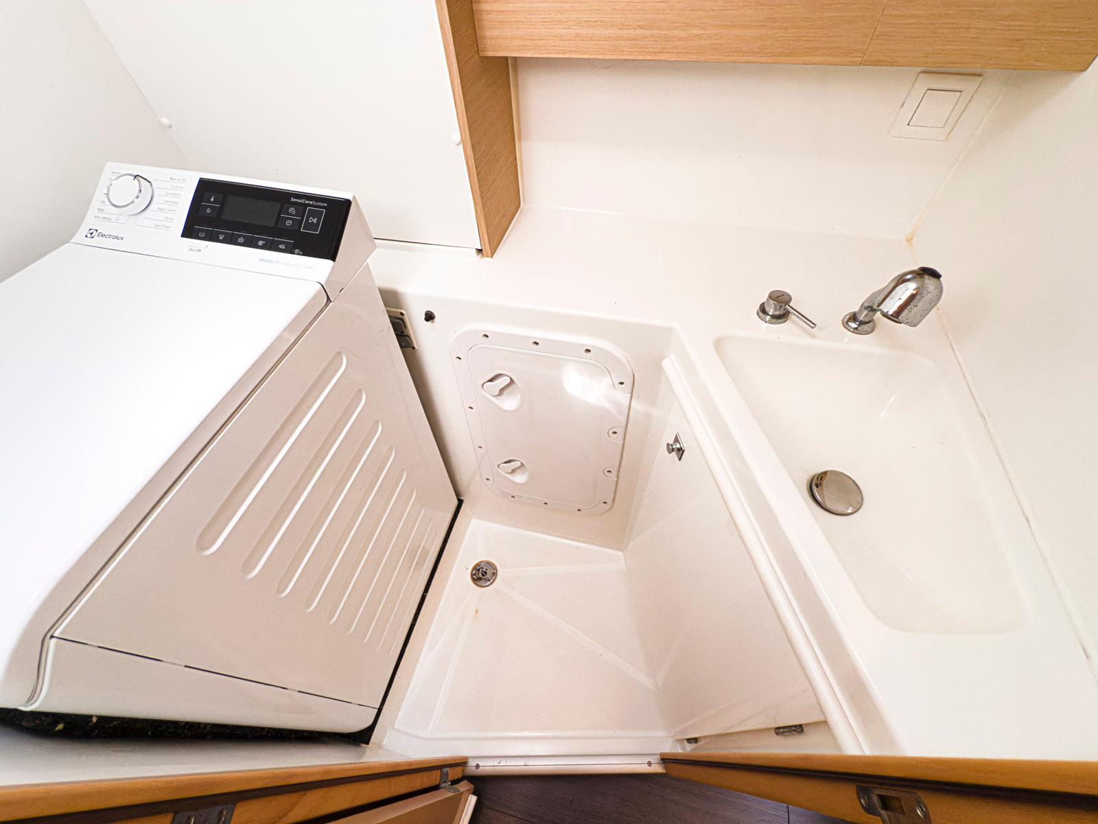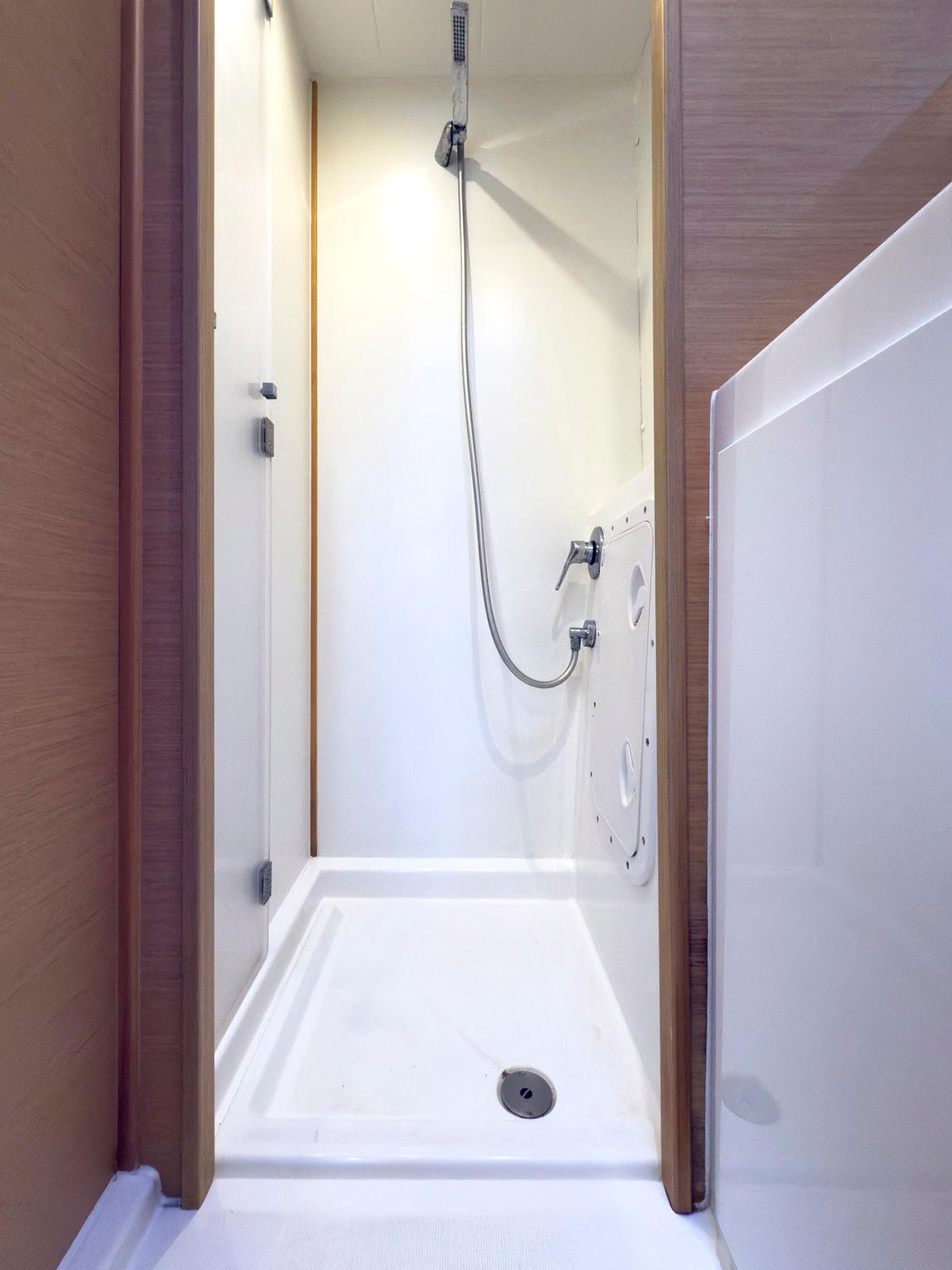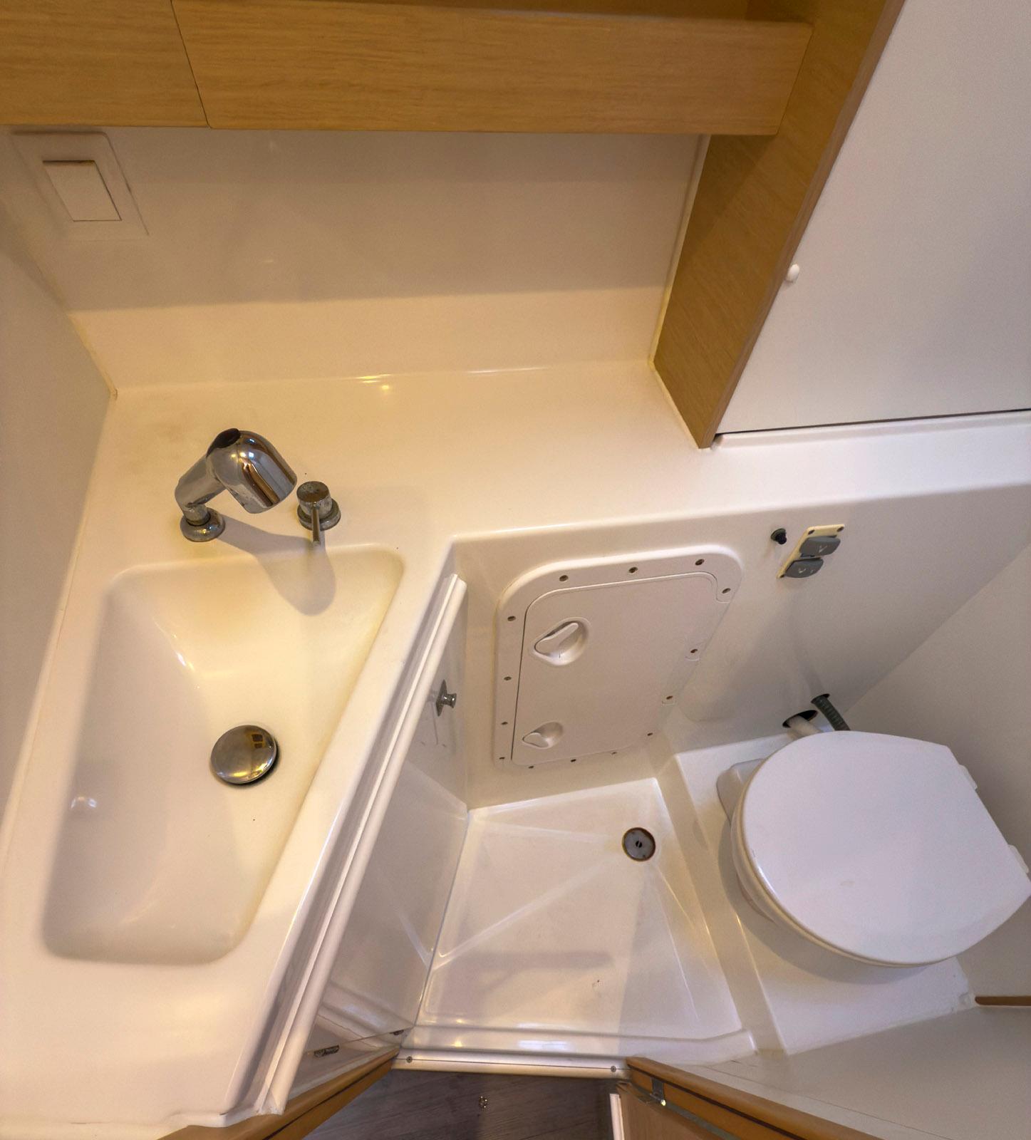 An ergonomic helming station at the coach roof bulkhead, offering direct communication between the cockpit and saloon, improved circulation, forward and aft of the helming station, direct access to the coach roof for easier access to the boom, a composite bimini with a sliding panel to ensure a good view of the sails, a closure panel for helming station safety when under way.