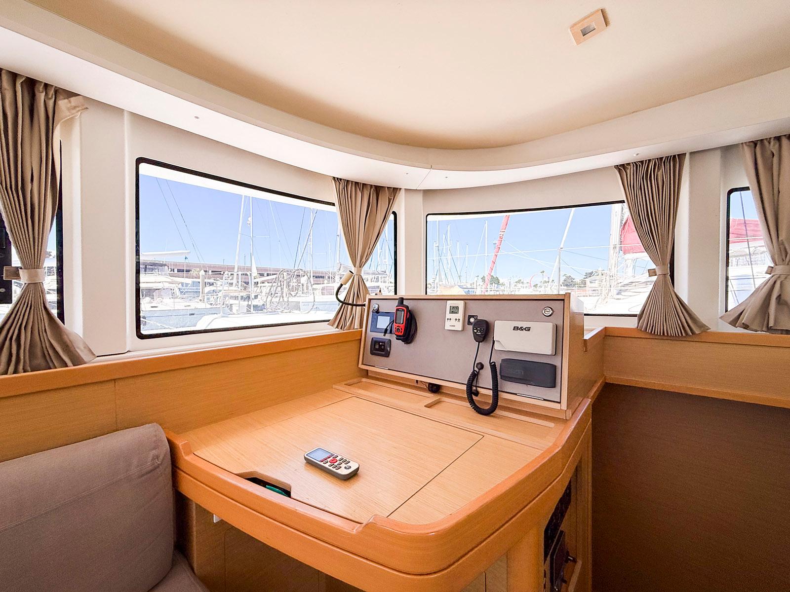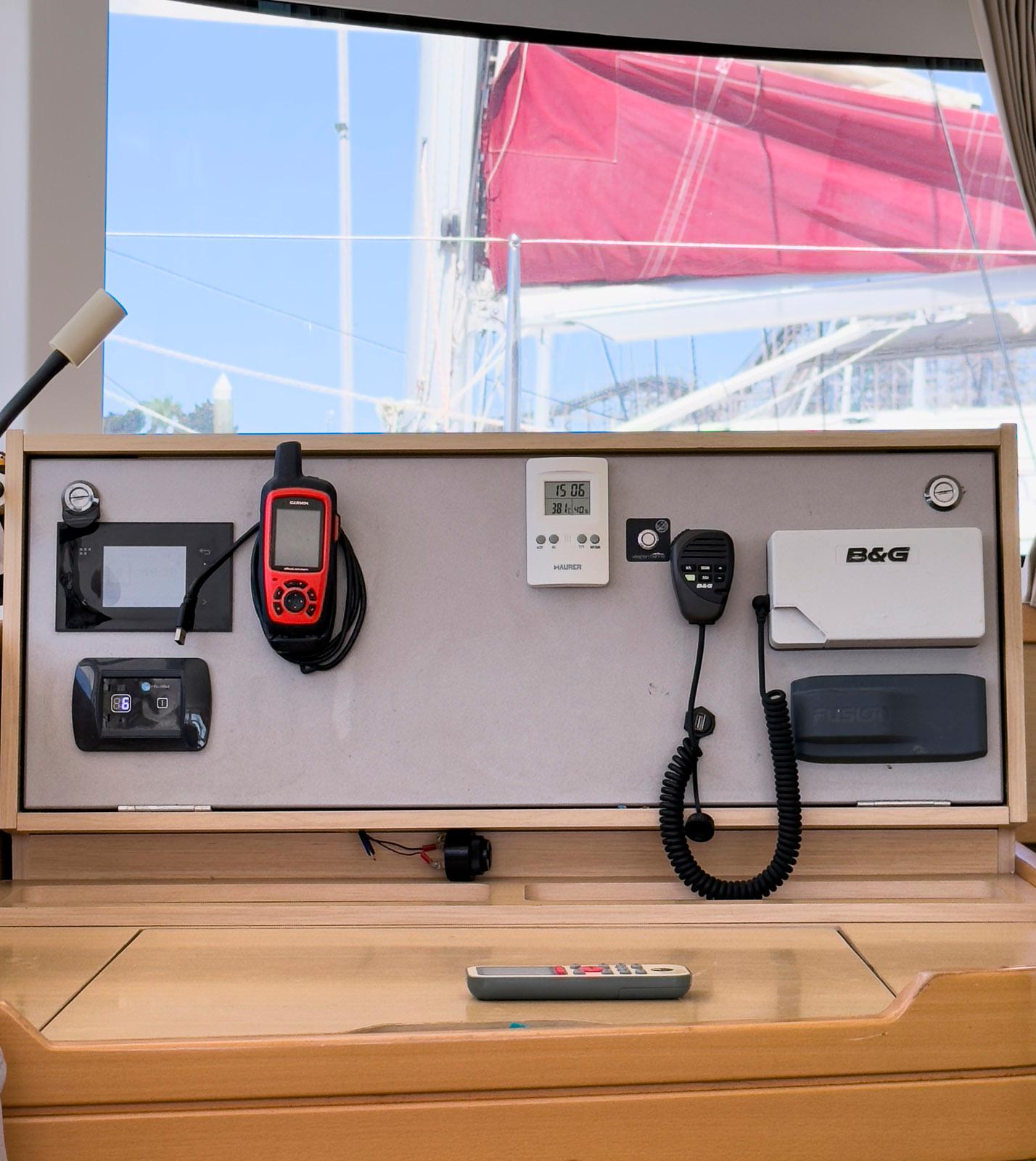 B&G 12 Display at helm station Chart plotter, 2 B&G Triton displays for wind, speed, depth and autopilot AIS transceiver B&G VHF B&G remote VHF mic at helm, Fusion Bluetooth radio with speakers (bow, cockpit and salon)