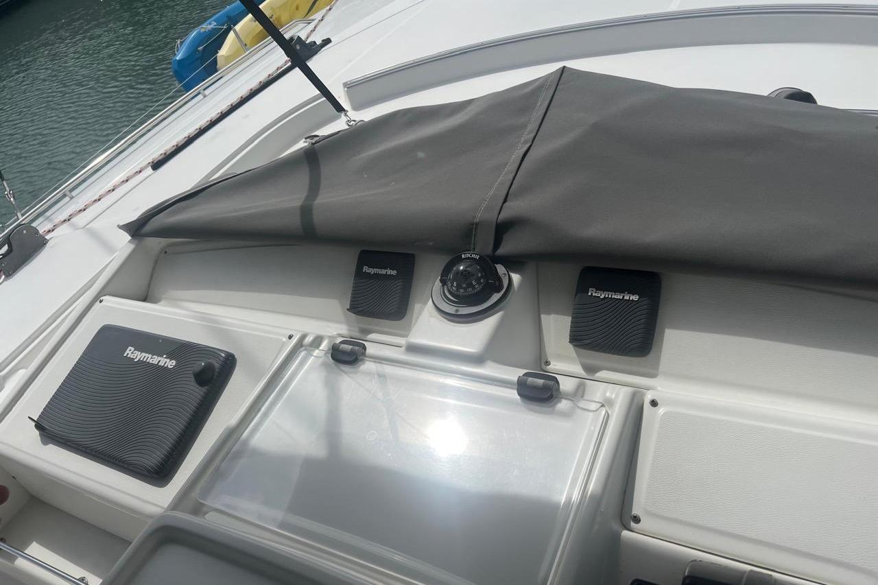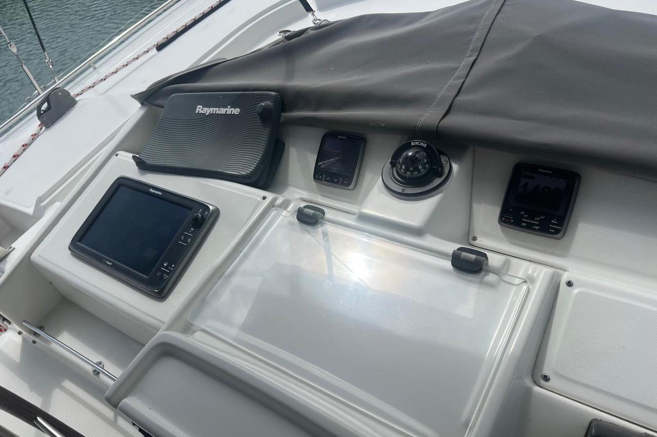 • Large cockpit functions as deck salon, protected by fixed composite bimini with integrated cockpit lighting