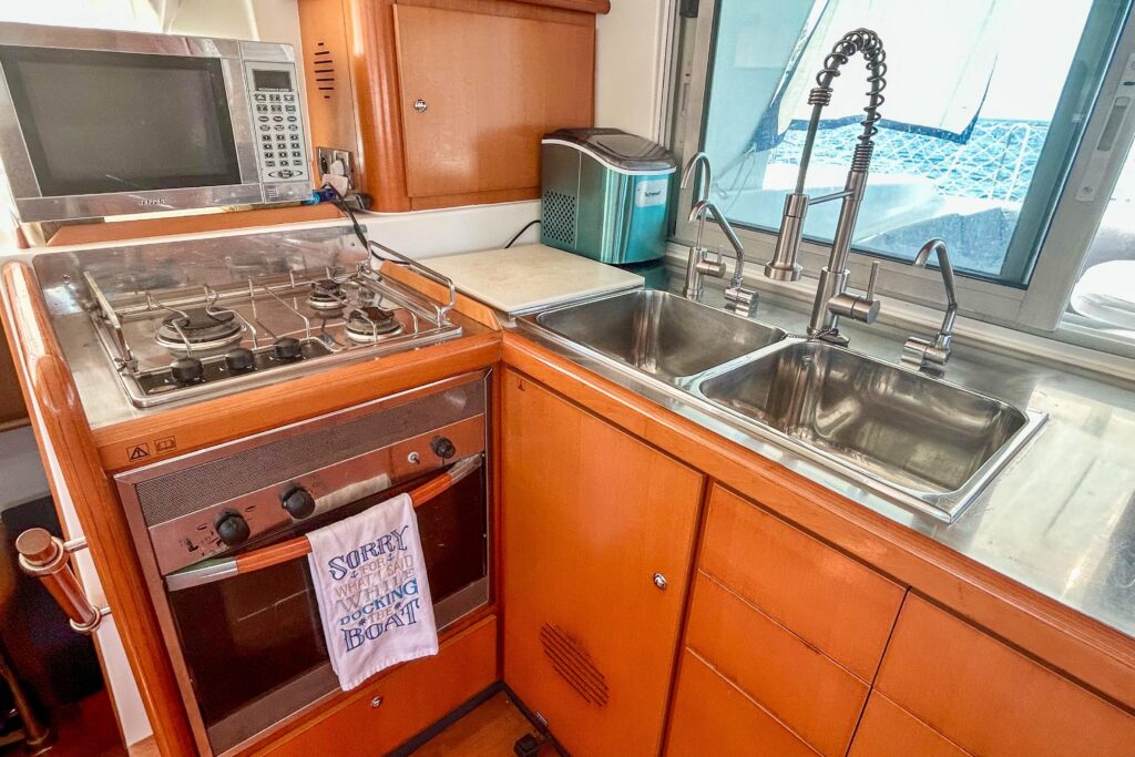 The cockpit and salon have two full size and one coffee table, which are interchangeable for optimal entertaining space. Additionally, it features a well-sized 12' AB ('22) for exploring.