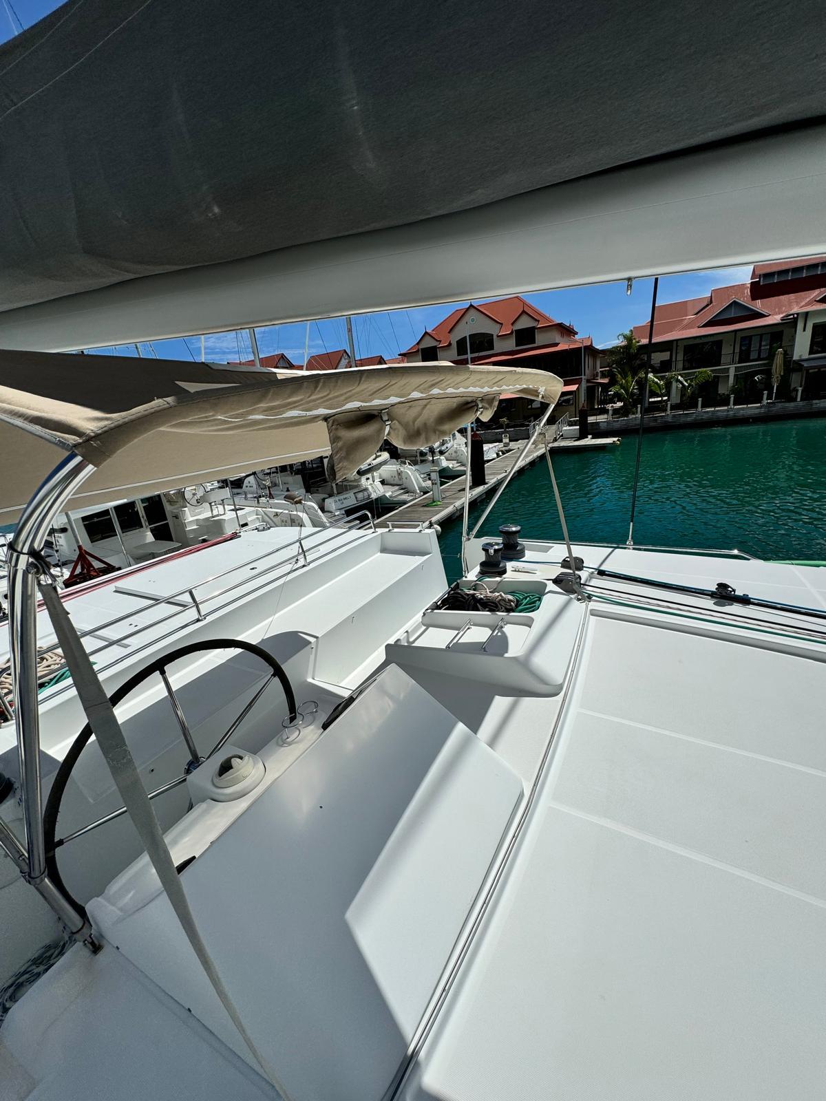 Magnifique Lagoon 450F d’occasion, visible à Eden Island, Seychelles. Ce catamaran Lagoon 450 flybridge est une référence en matière de confort, d’élégance et de performance.