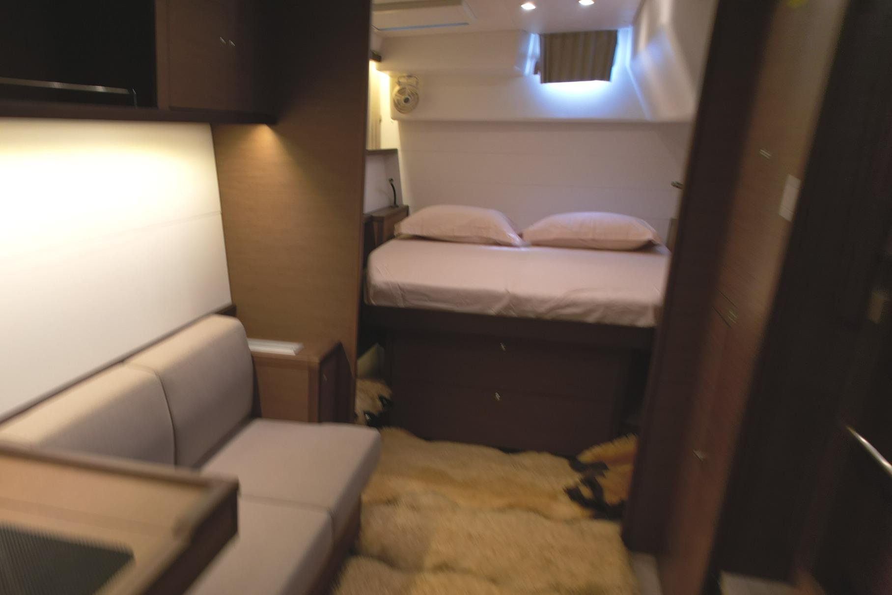 She is the preferred owner’s cabin layout with two additional guest cabins on the port side, and three heads. The expansive salon with 360° vertical glazing, U-shaped galley, and elevated flybridge helm deliver superior comfort and visibility.