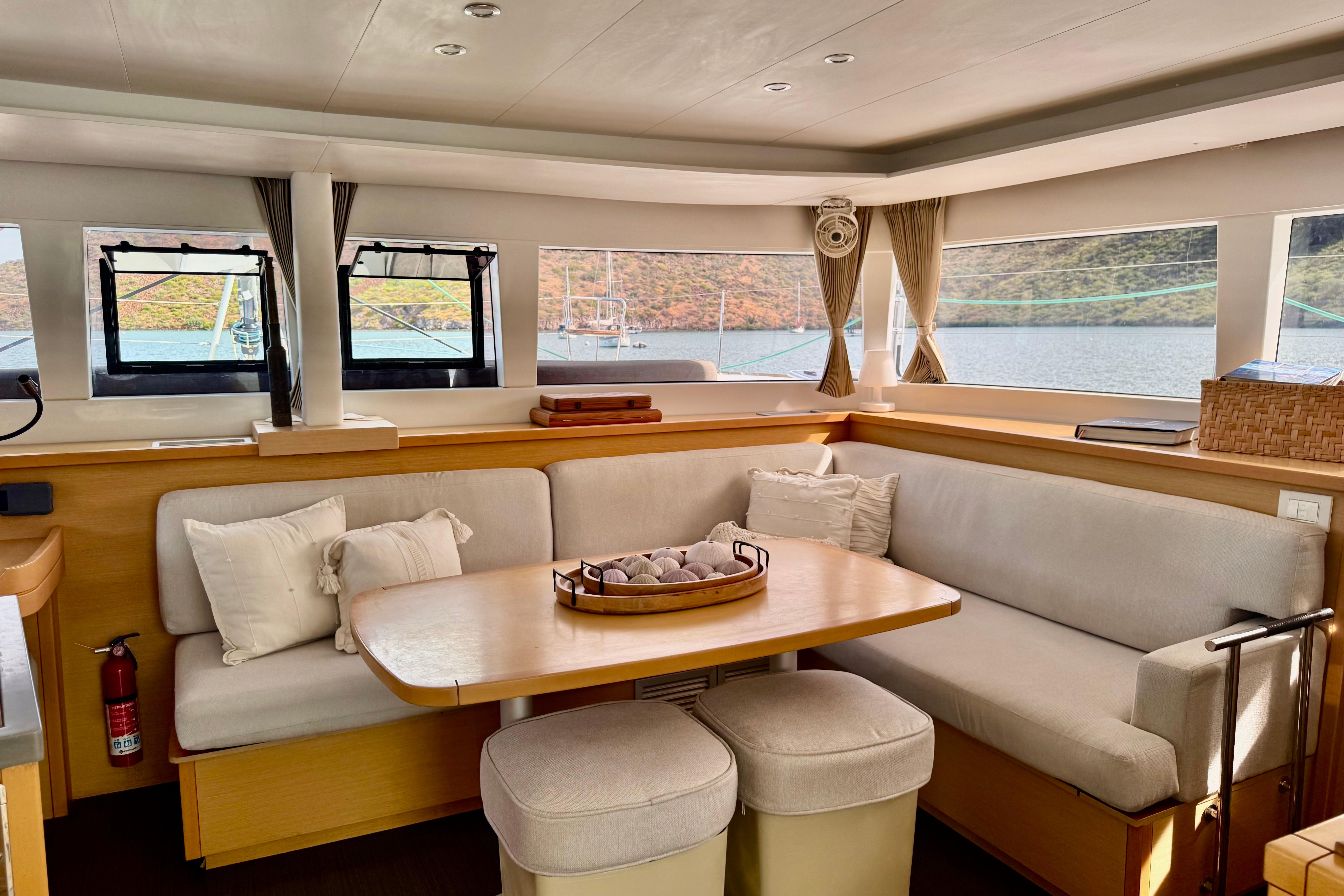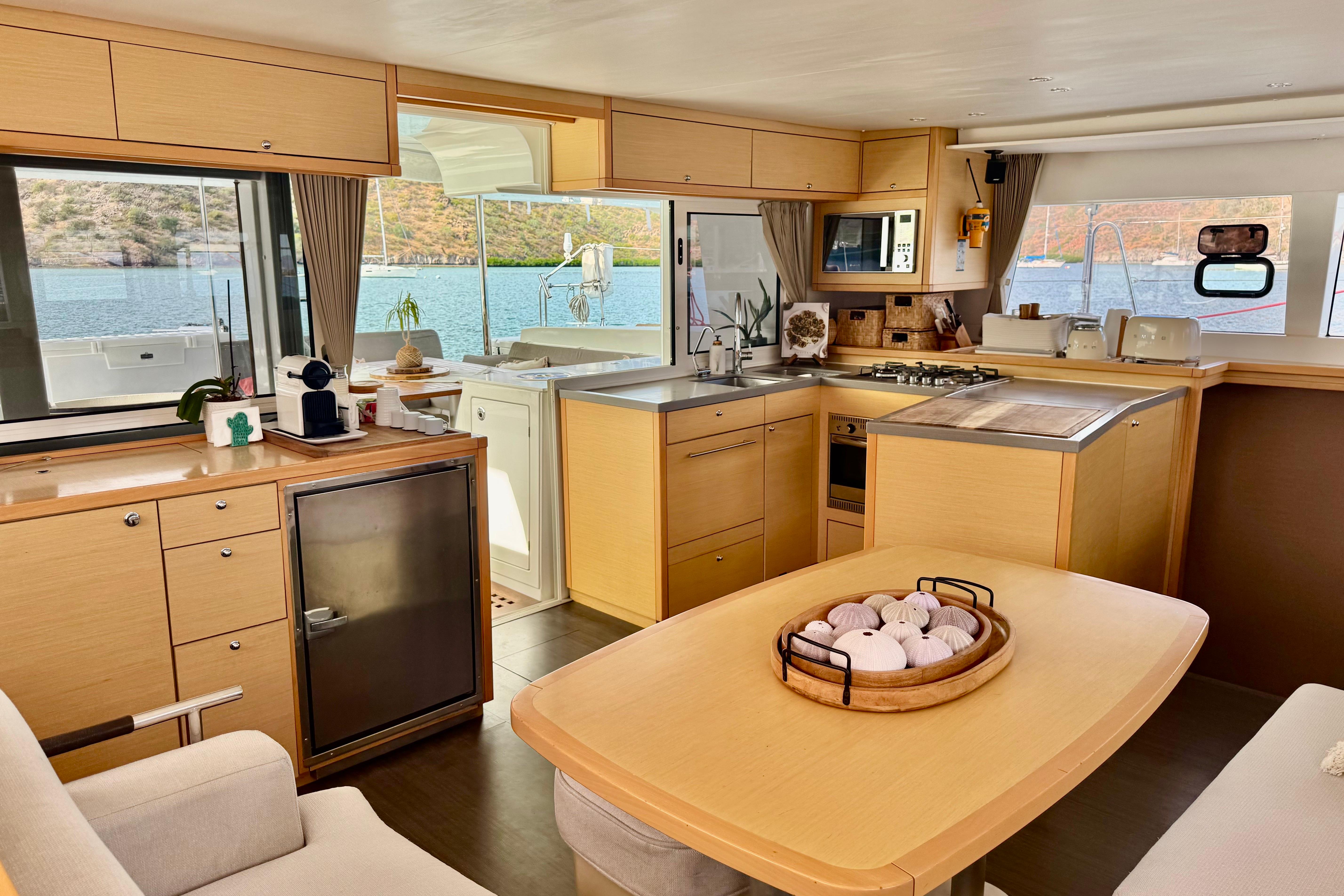 On the flybridge, the helm sits alongside a large sun-lounge where everyone can gather. A wide walkway creates a smooth connection down to the salon, enhancing the natural flow between outdoor and indoor living. At the bow, a welcoming lounge with sunpad (solarium) and the signature trampolines invite you to unwind to the rhythm of the ocean. Inside, this fully equipped vessel delivers the comforts of home.