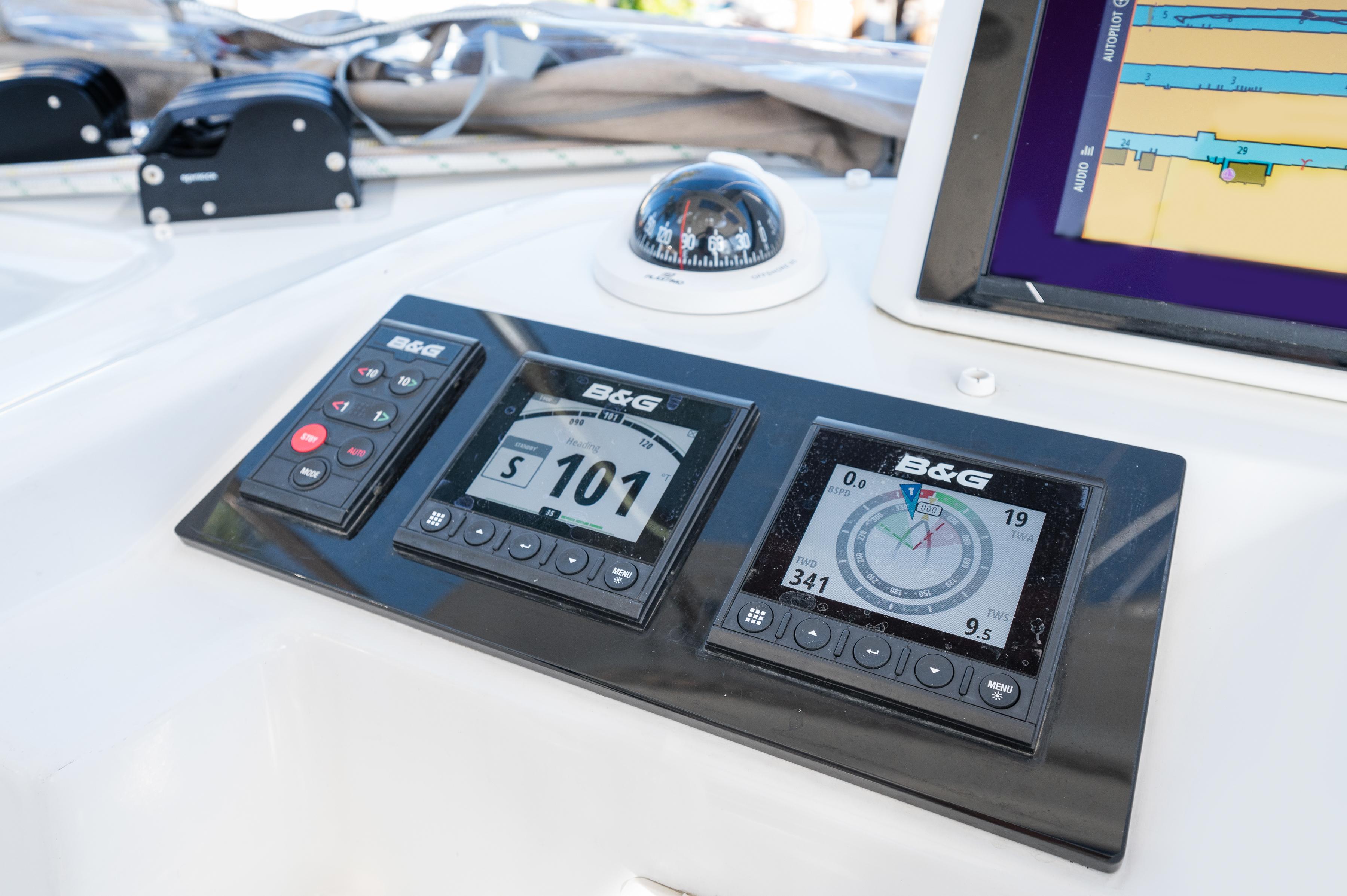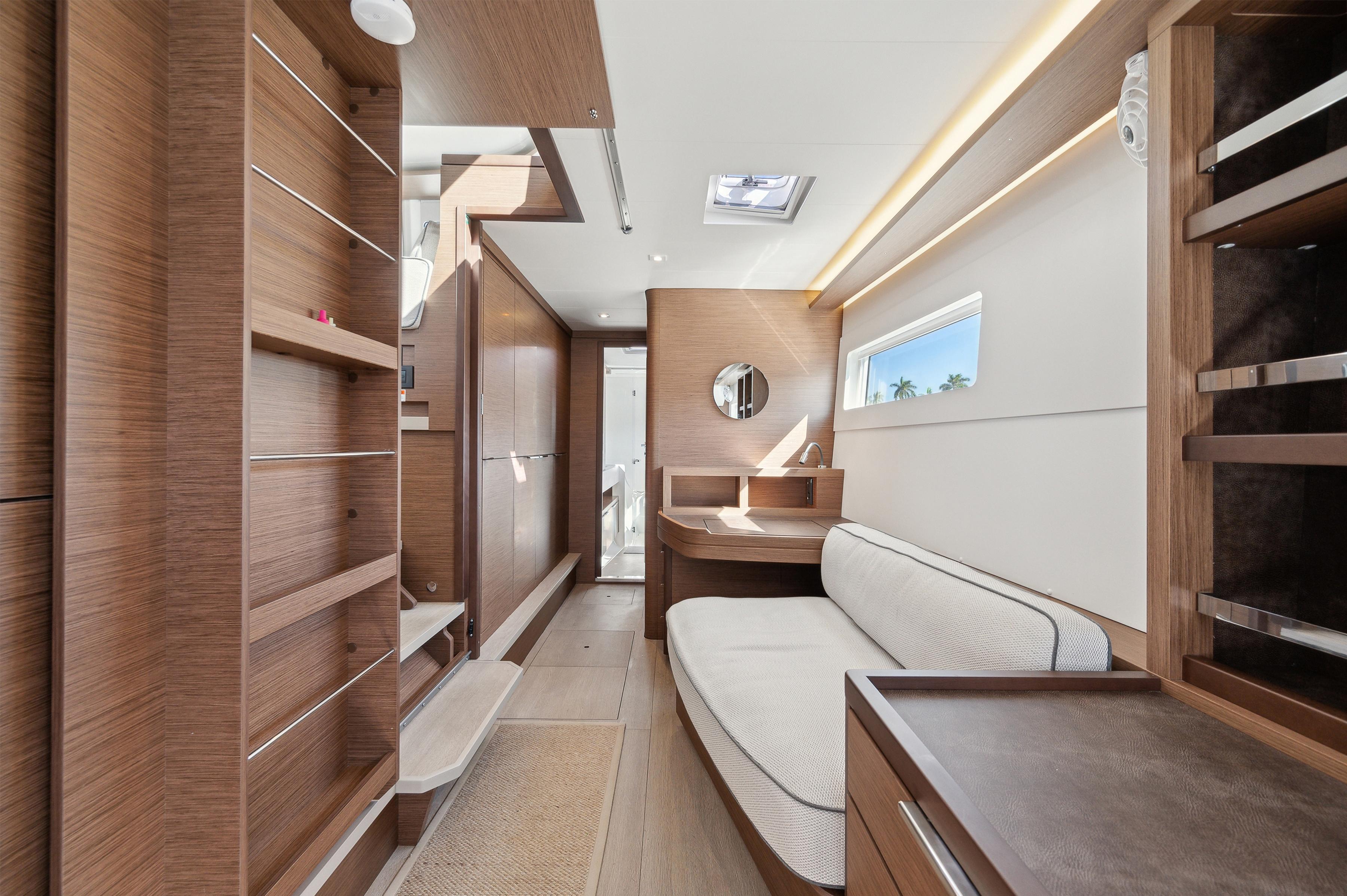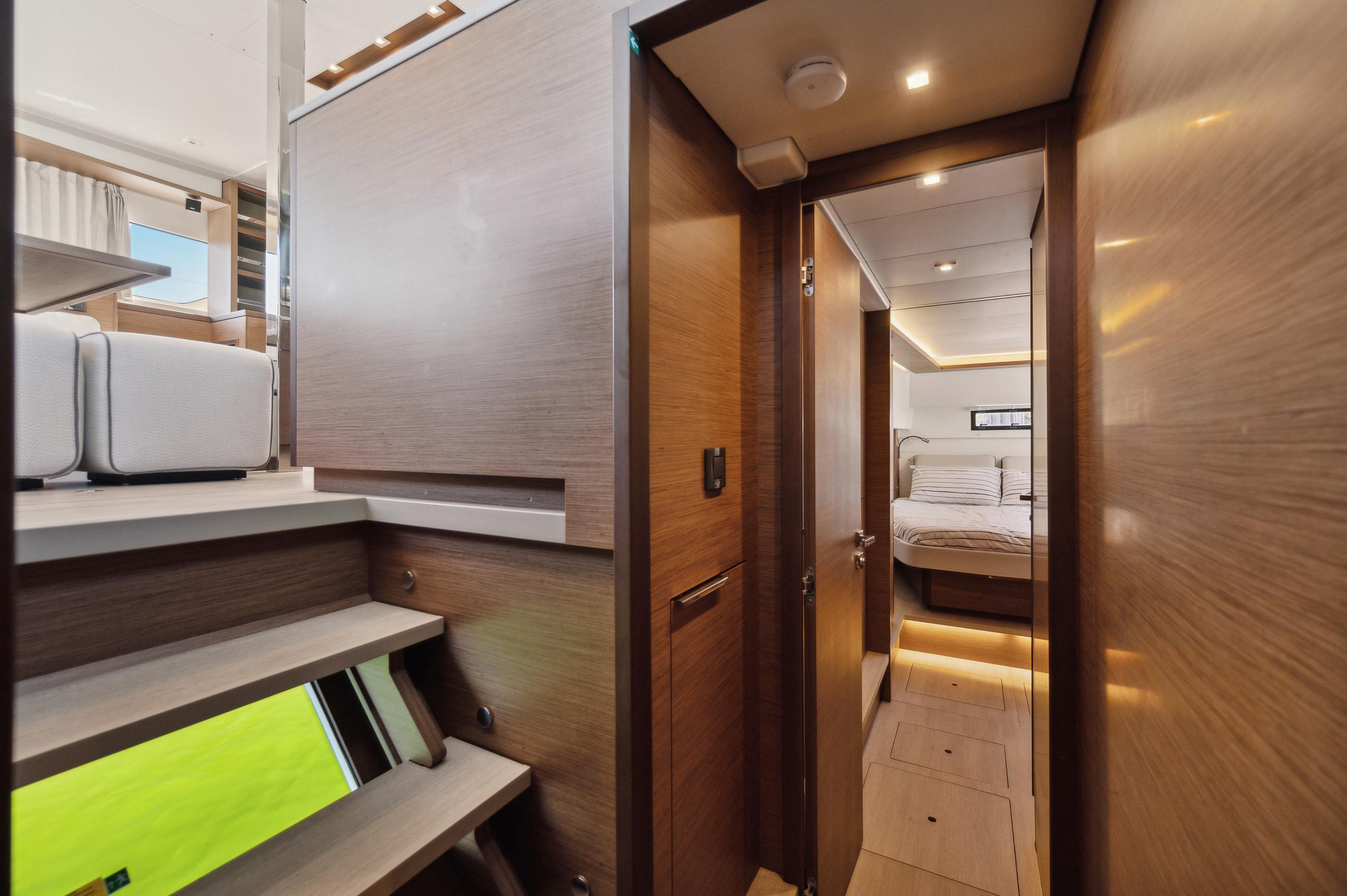 All lines lead to the centrally positioned flybridge helm, where two electric winches and intuitive ergonomics make short-handed sailing remarkably simple.
