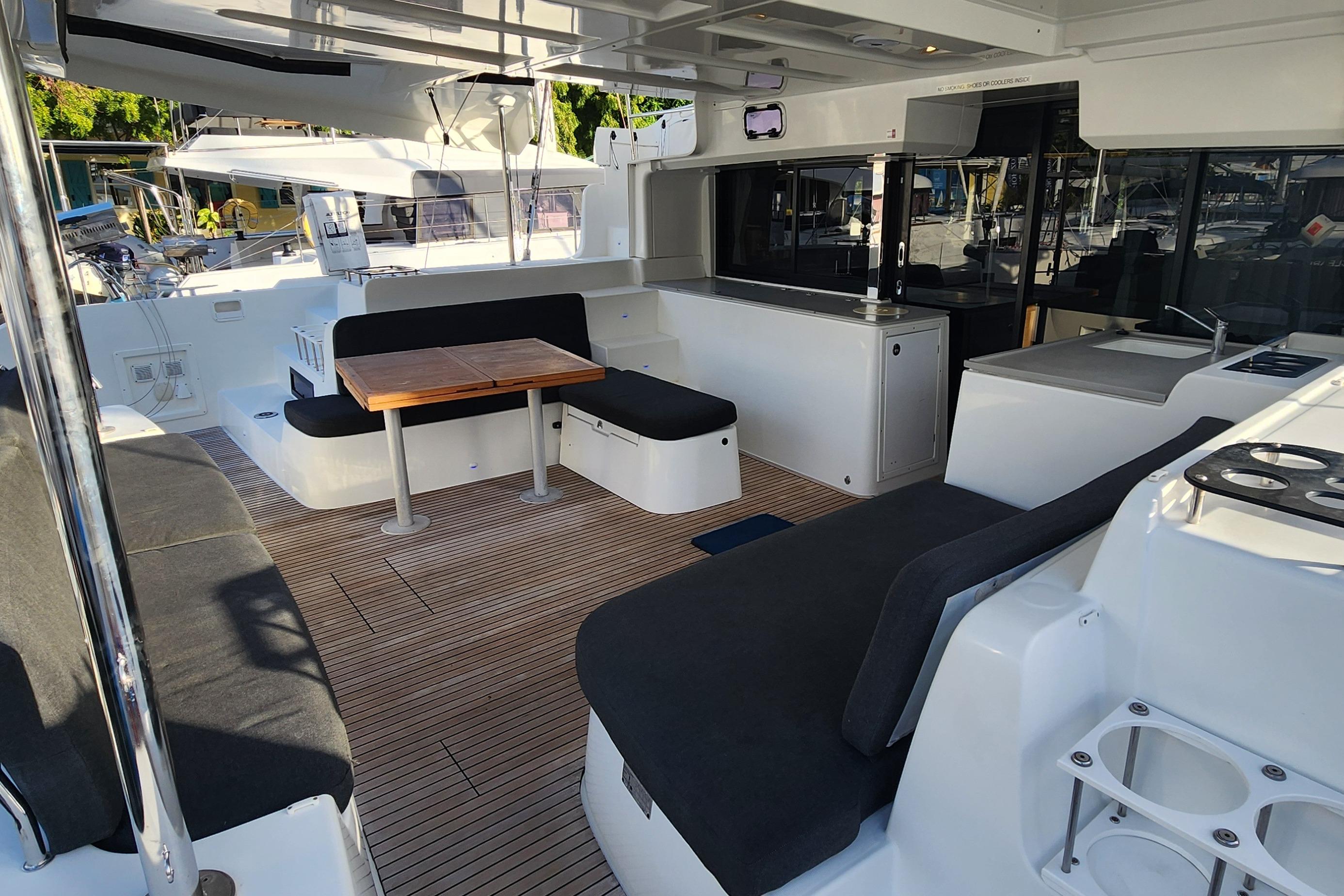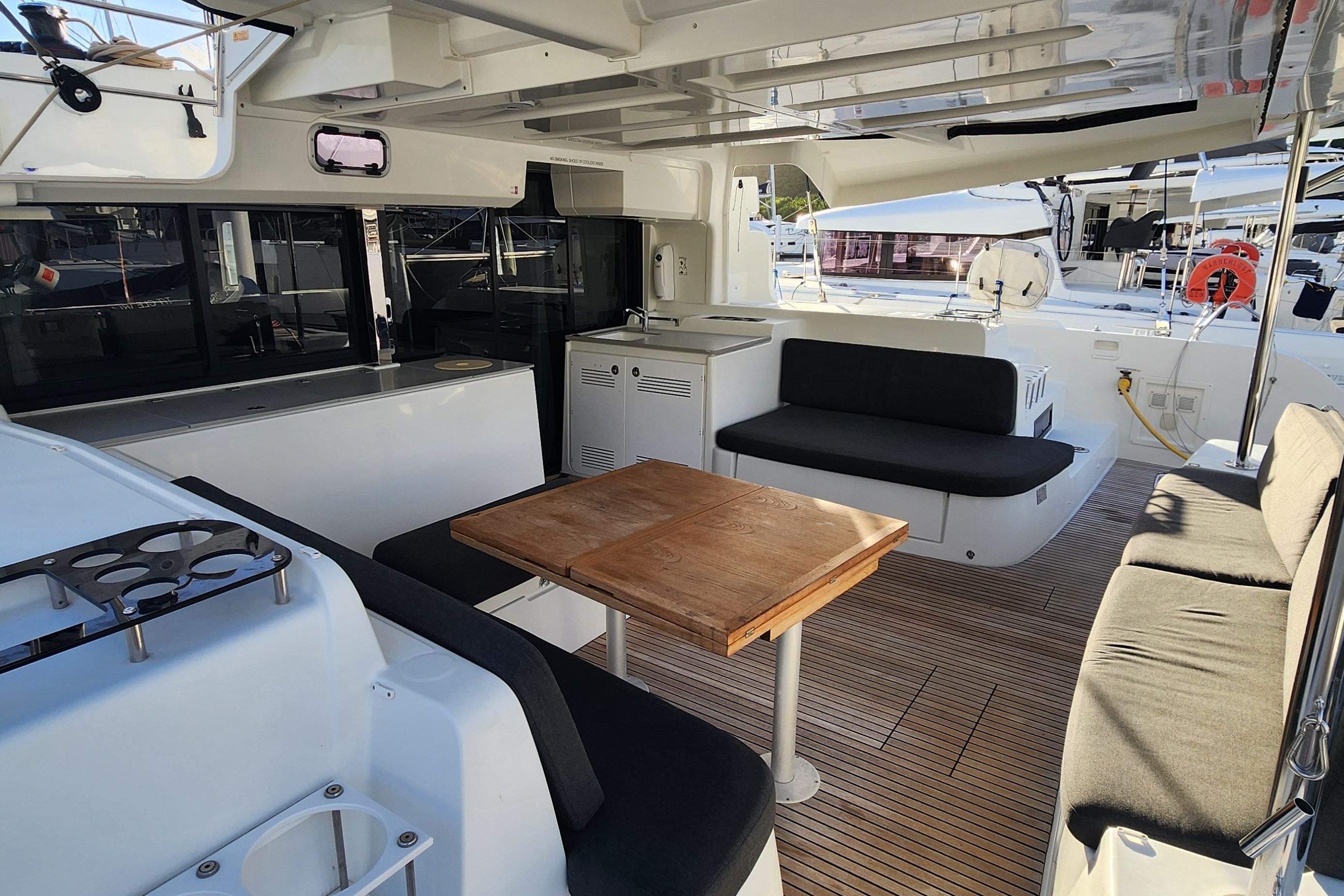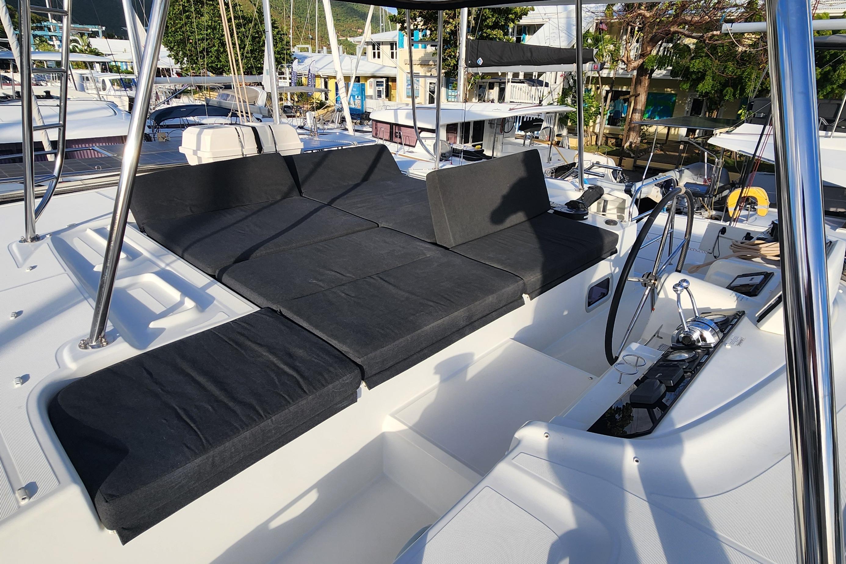 Equipped with twin upgraded 57 HP Yanmar engines, this Lagoon 46 delivers excellent performance under power. The sailing performance is equally impressive, with a square-top mainsail and self-tacking jib, an assortment of downwind sails, and all-running rigging leading straight to the winches at the helm, ensuring easy handling and optimal sailing performance. For the dive enthesitis, Clearlake comes with an onboard dive compressor complete with customs dive tank holsters on the sterns.