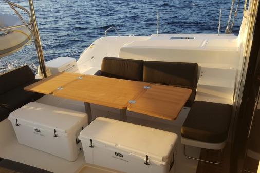 Entertain with Fusion MS-RA70 audio and 6 speakers. Exterior highlights include a flybridge composite bimini with graphite enclosure, teak cockpit table, stainless dinghy hoist with manual winch (electric-ready), underwater lights, and shore power (2x30A).